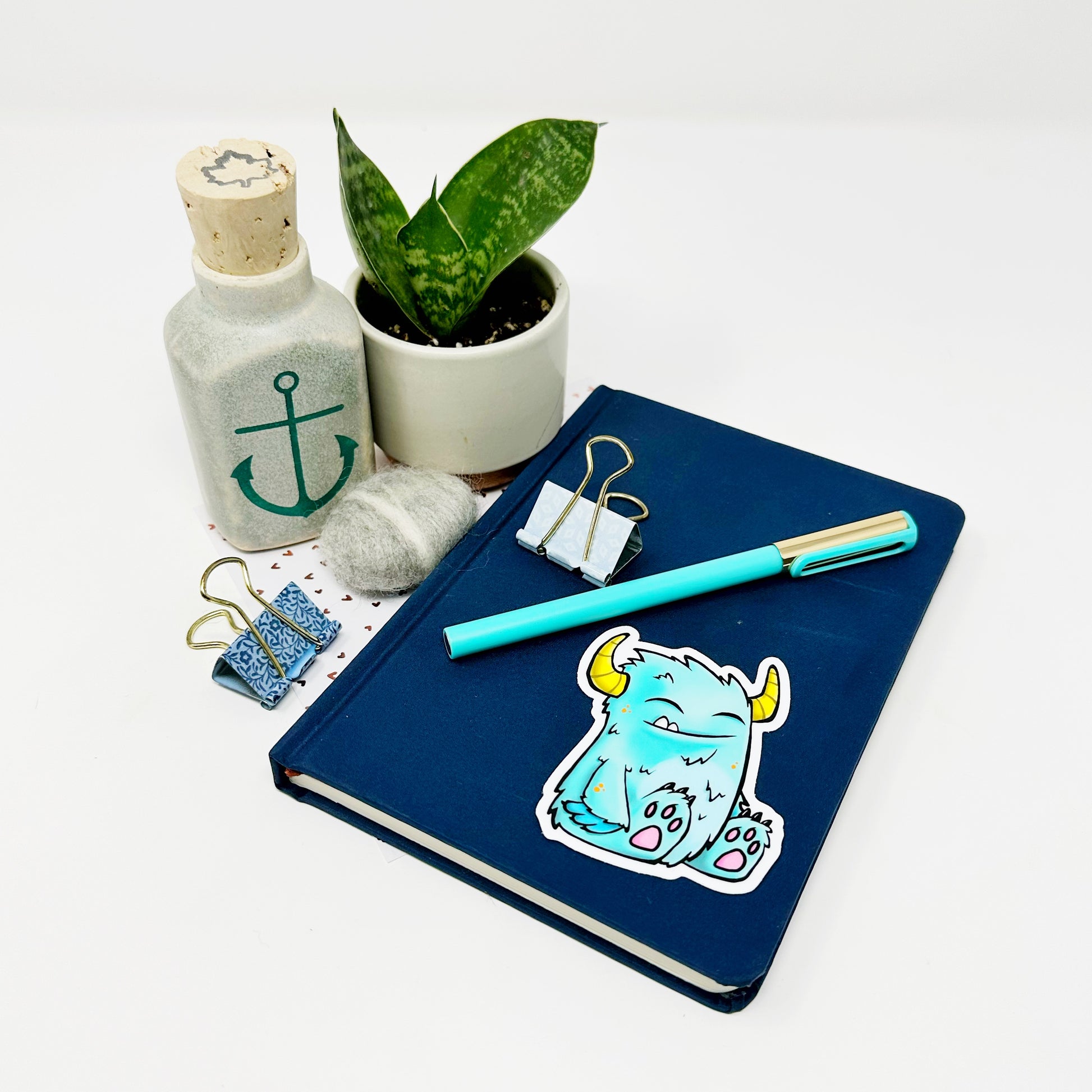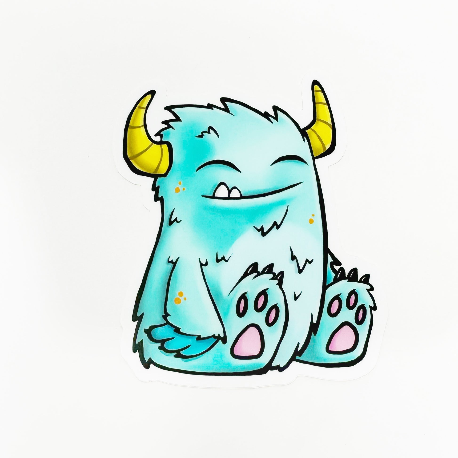 Adorable illustrated blue monster die cut vinyl sticker.