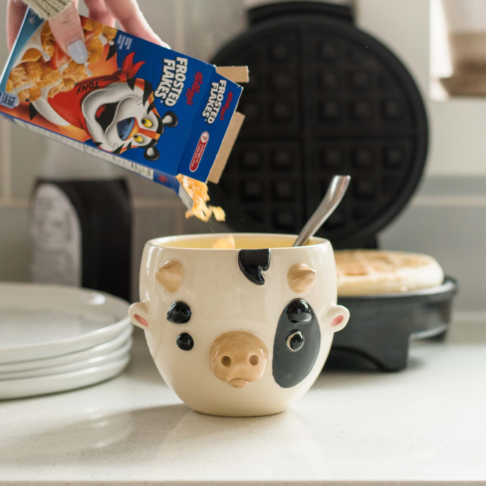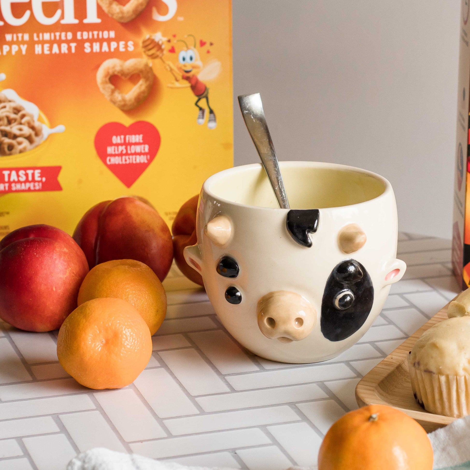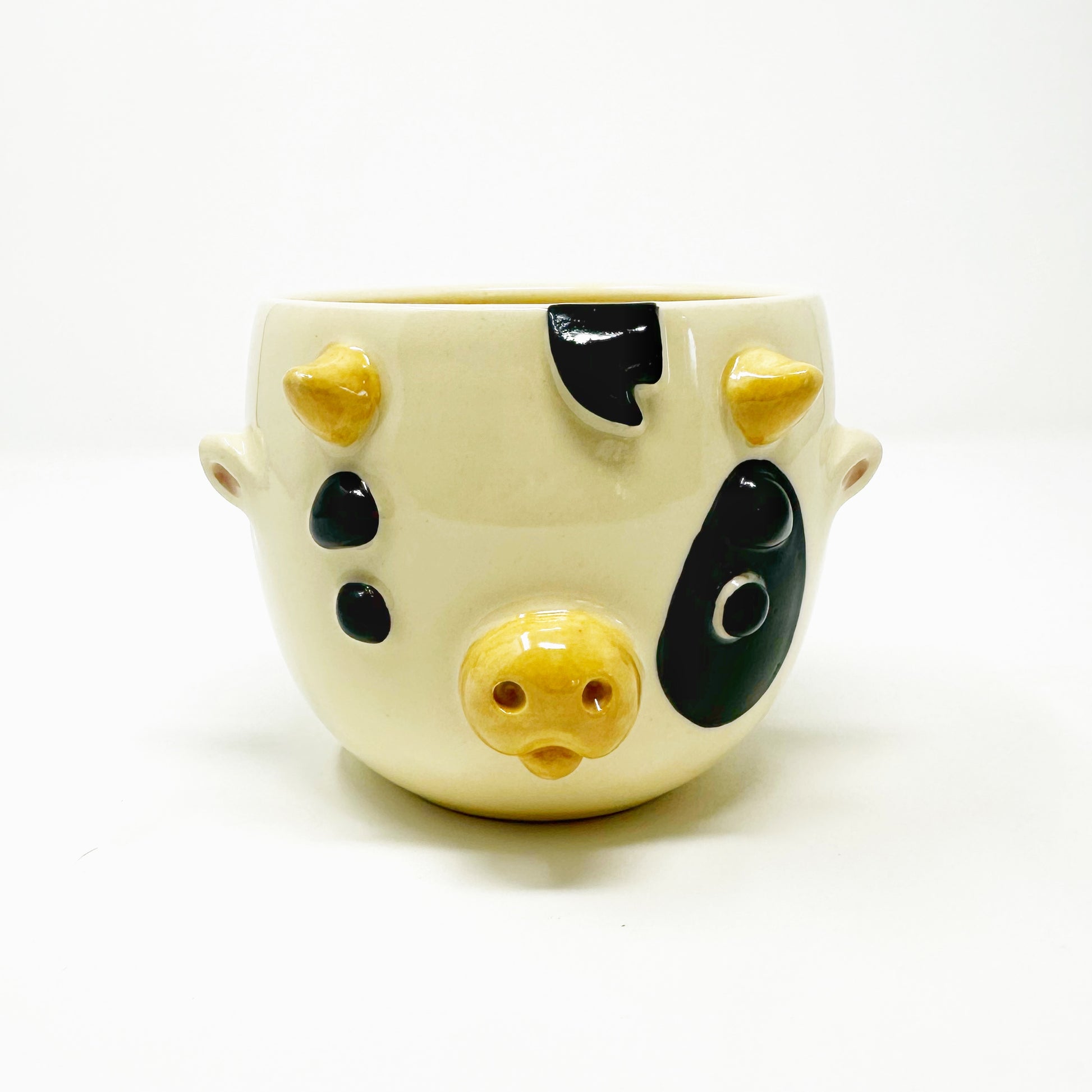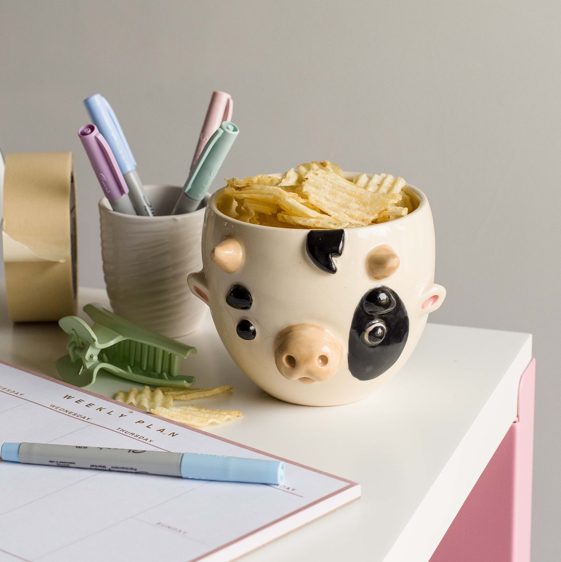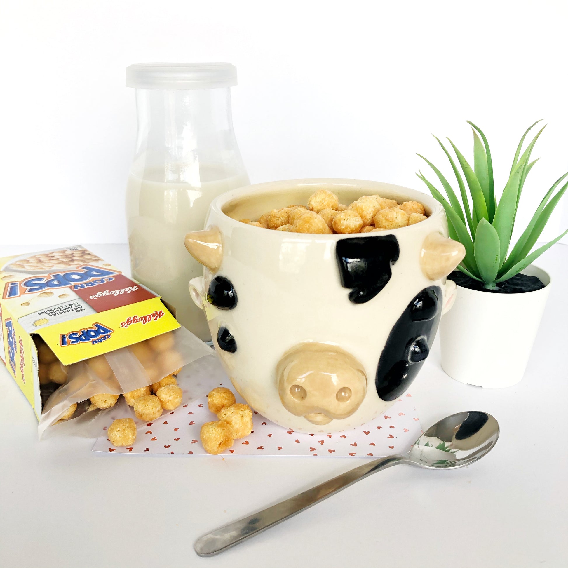 So glad Sarah and Blair made the dairy cow bowl available! It is a mirror image of the dairy cow mug so the eye patch is on the opposite side. This makes for some variety and I feel like I have 2 different friends at the table instead of the same design. The inside is also yellow like the mug. I love using the cow bowl for treats like nuts, veggie sticks or small crackers. I can also use it for dips too. It is so versatile!