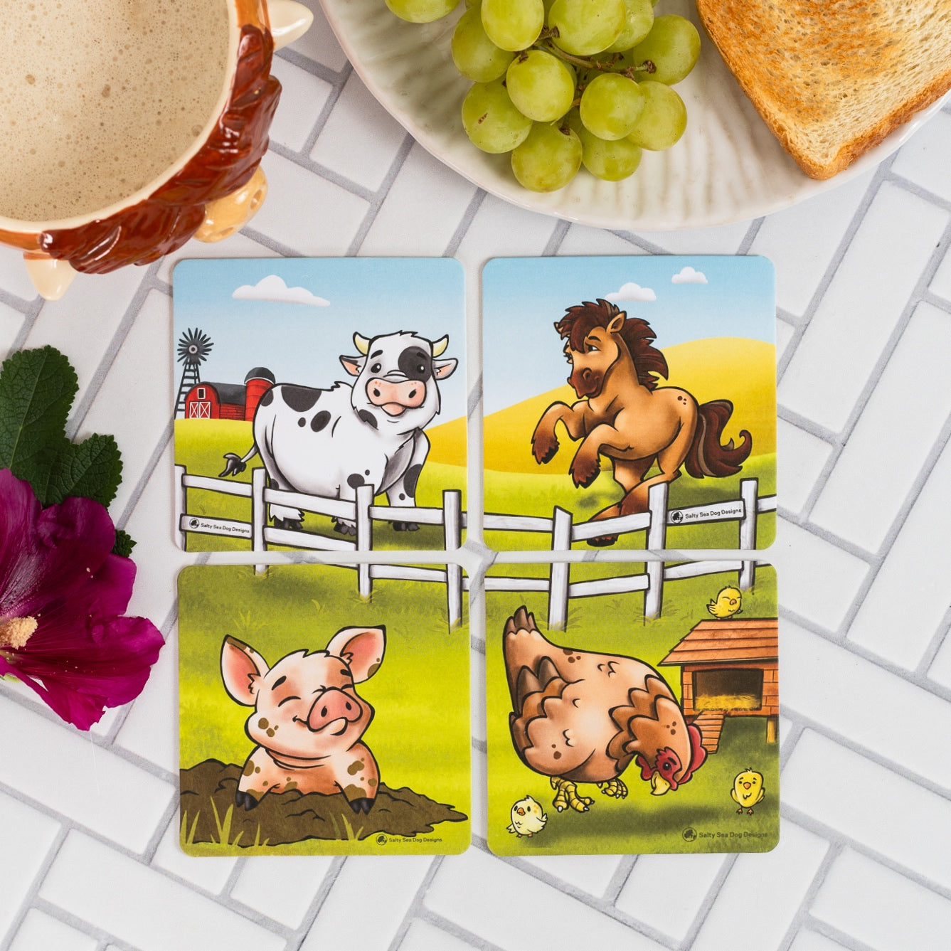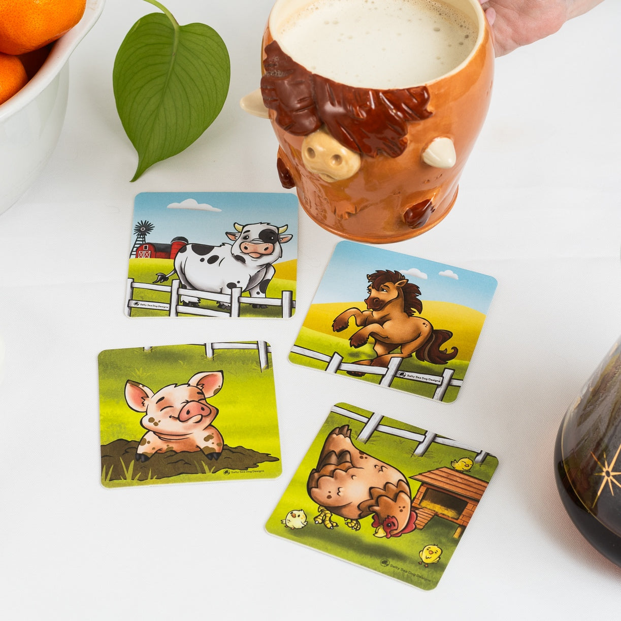 These playful coasters are designed to protect your surfaces and spark a little joy. Illustrated by Blair and printed on high-quality pulpboard, each set features four vibrant images that come together to form one cheerful, puzzle-like design. Durable, absorbent, and full of personality—these coasters are as practical as they are delightful.