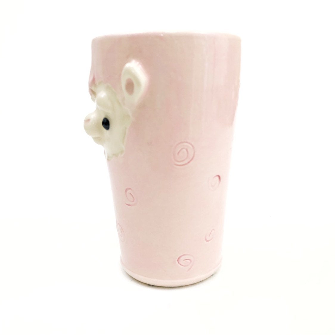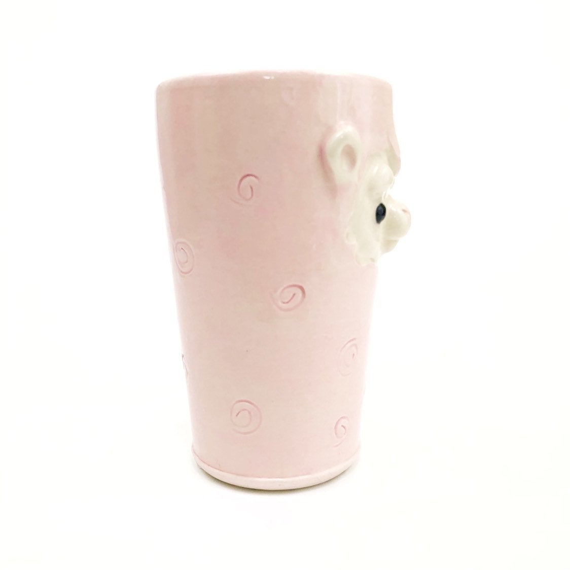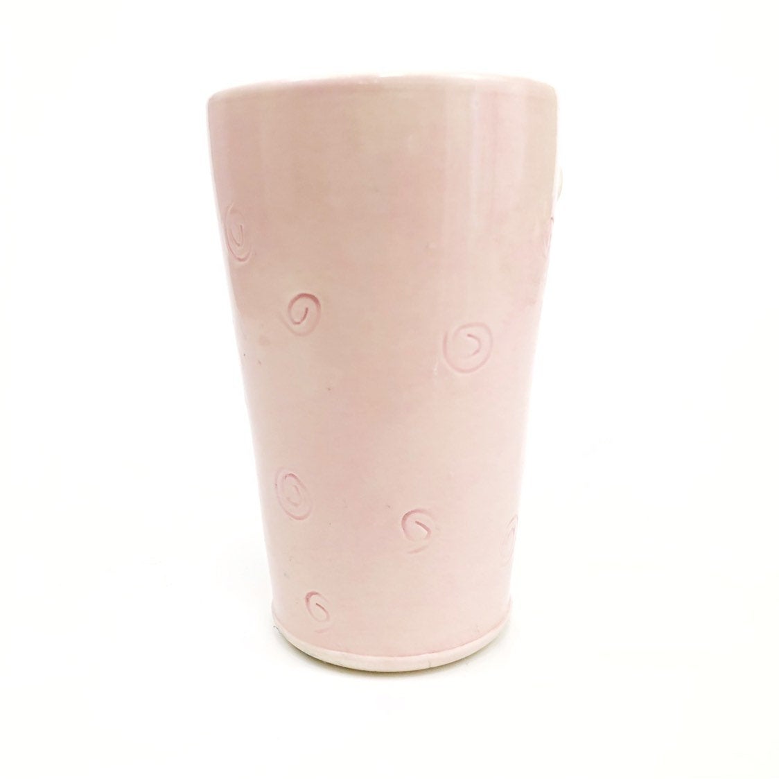This tumbler is lovingly created on the wheel and then the features are built on by hand. Since all of our tumblers are built one at a time, no two items are exactly the same. Our tumblers are also hand painted adding to the unique design on every mug. You may be able to see our hands at work in the brush strokes of the glaze.