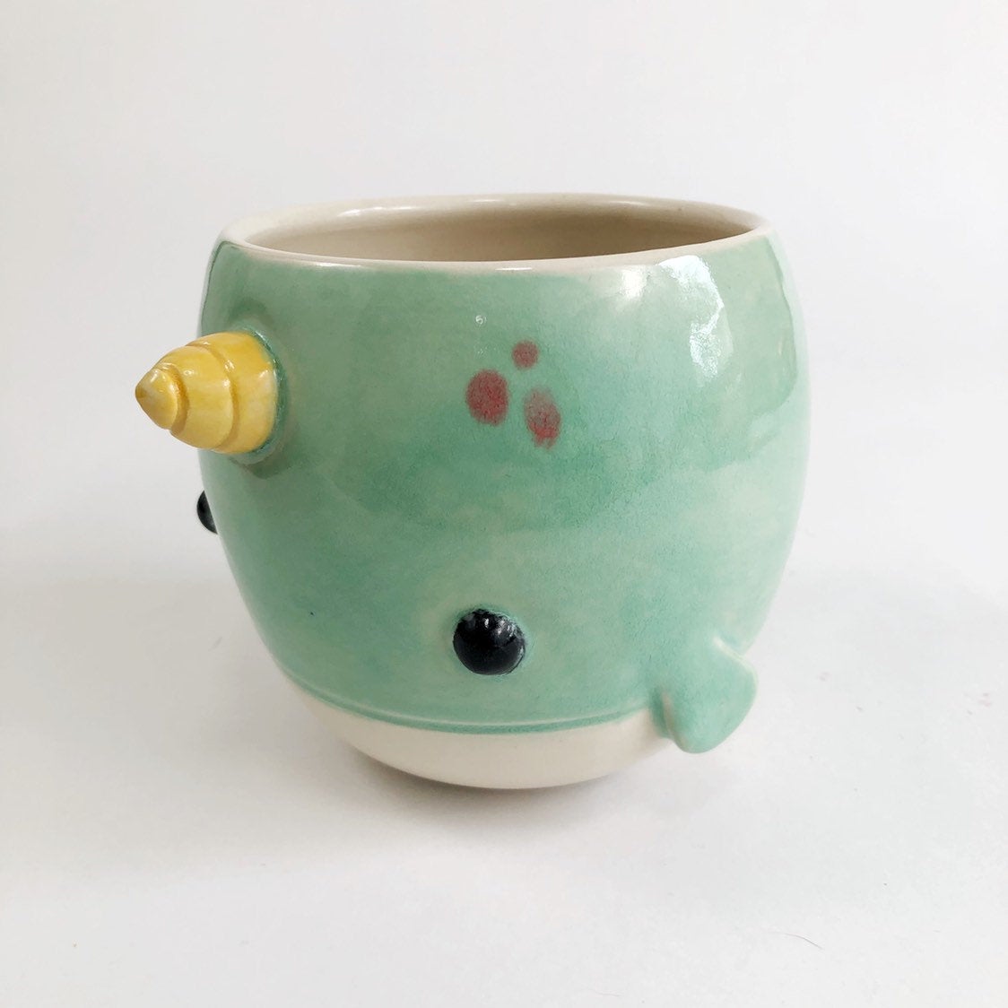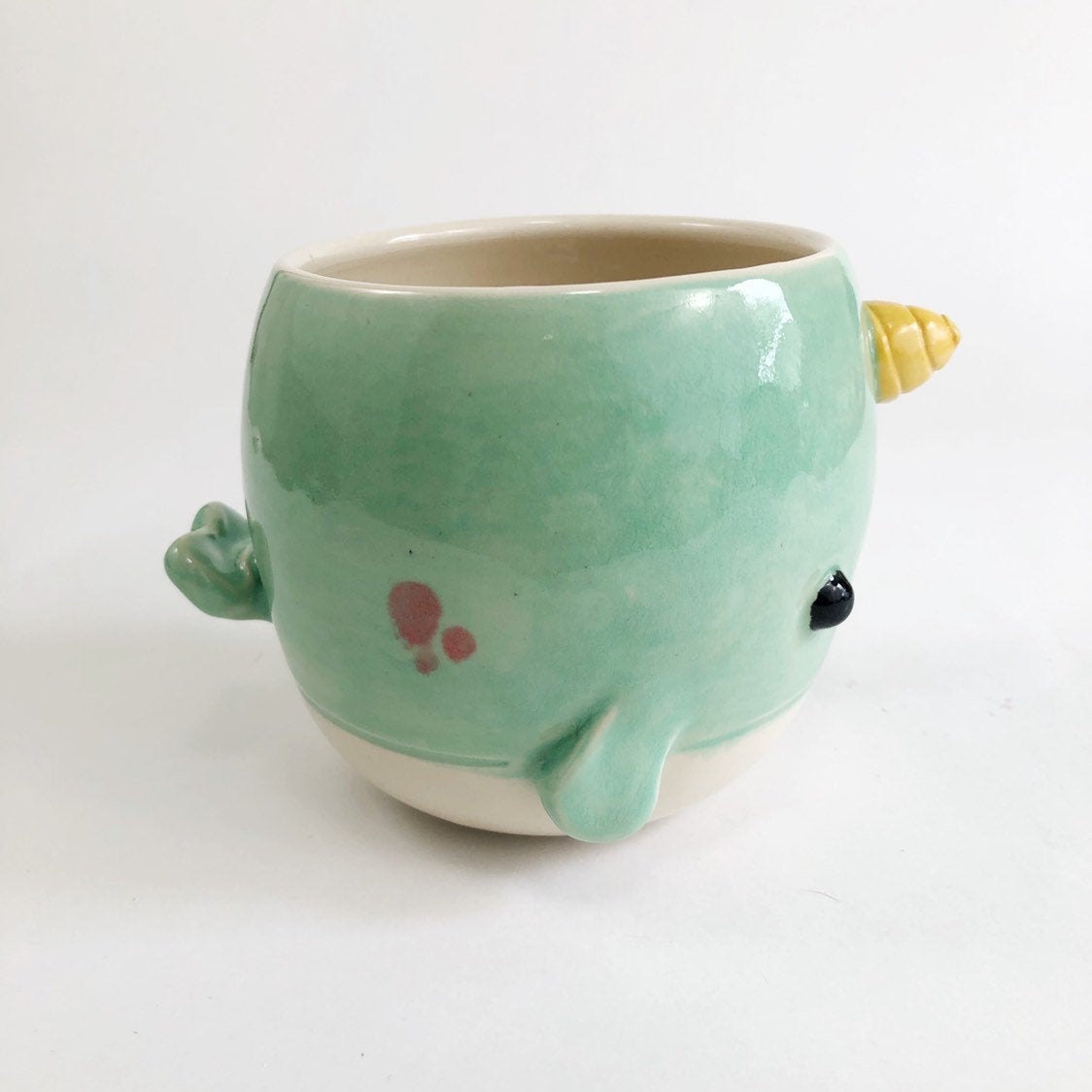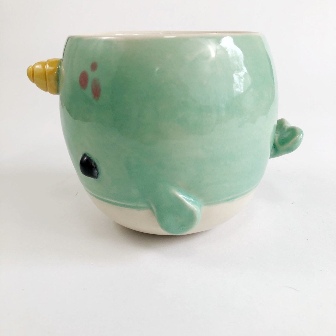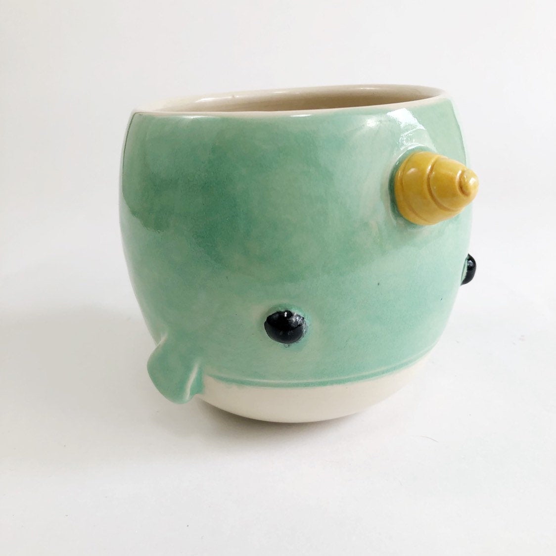 This delightful little narwhal planter is a perfect addition to your living room, home office or bathroom. Standing at 3.5” tall and approximately 4” wide it will hold a succulent or two or a small leafy plant. This handcrafted item is also suitable as a bowl and the perfect size for soup, ice cream, snacks and fruit (if you're into that kind of thing).