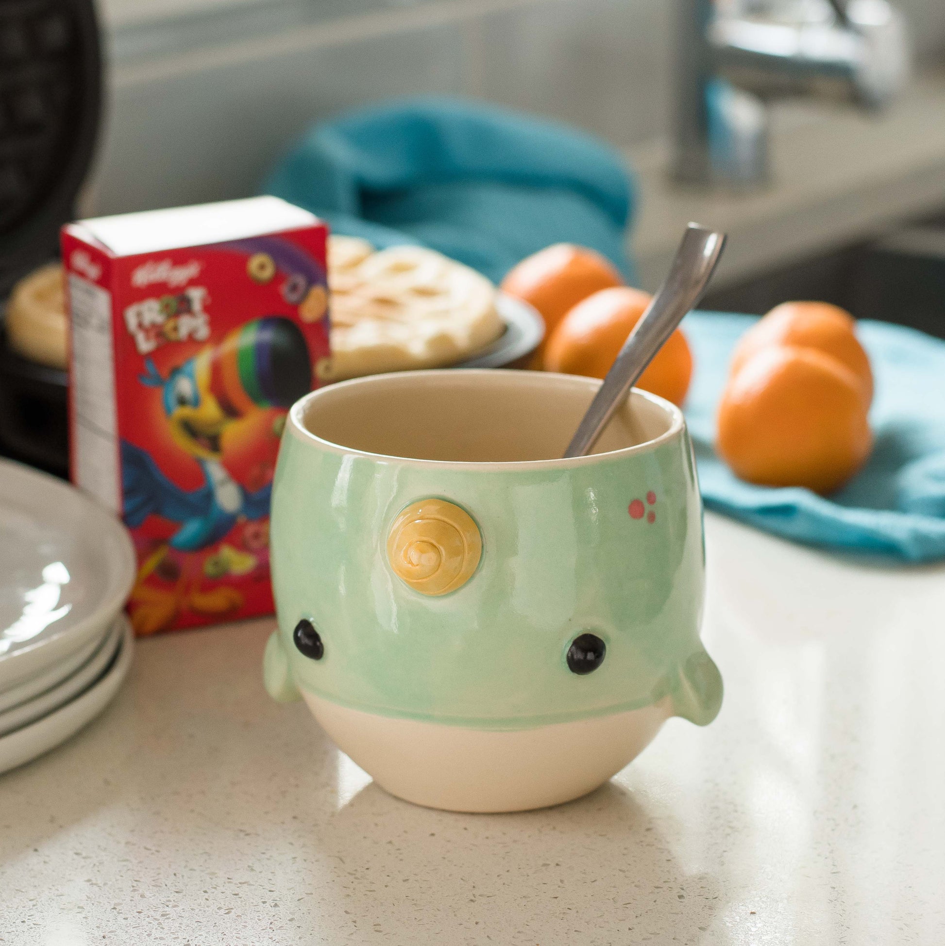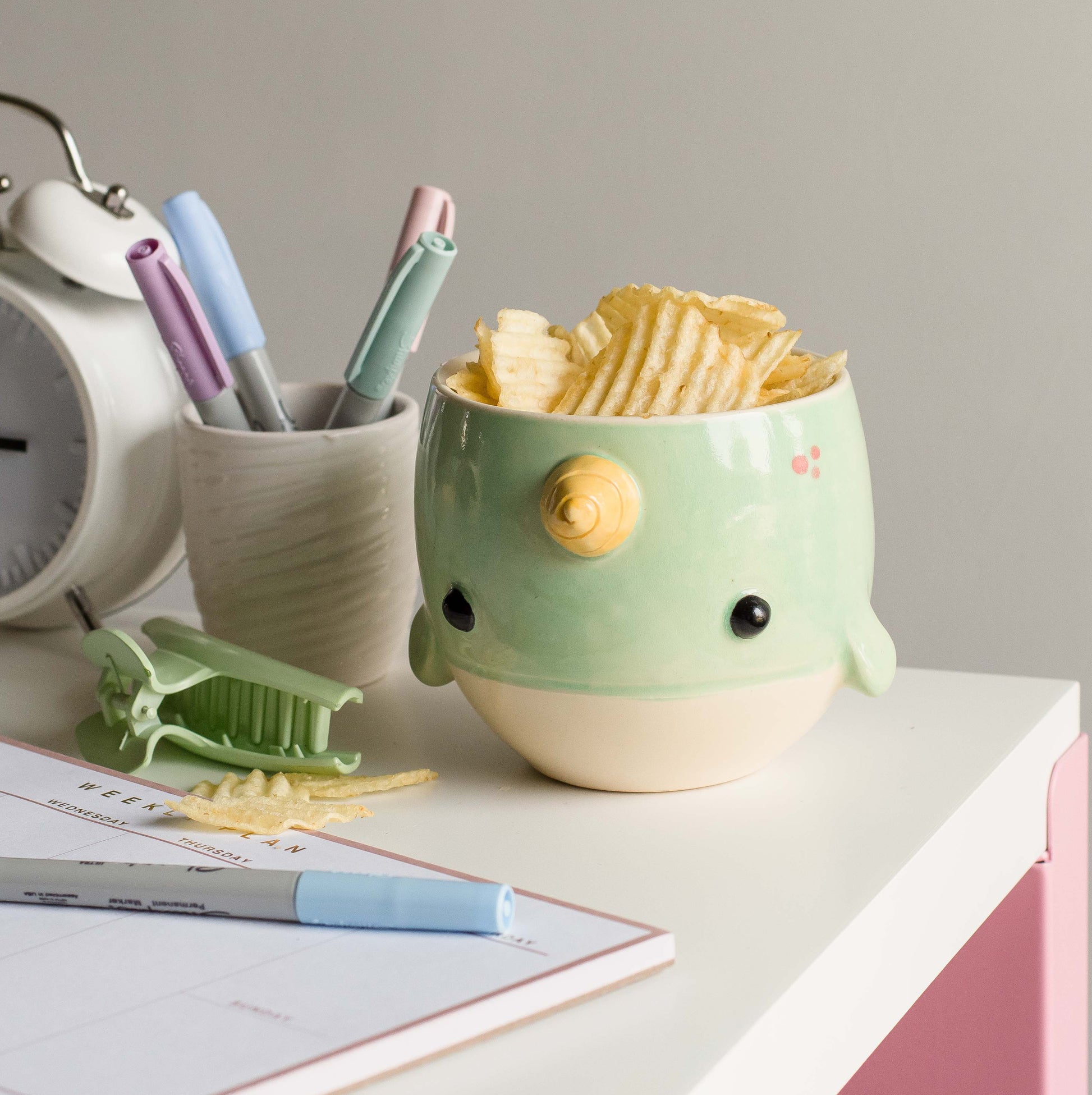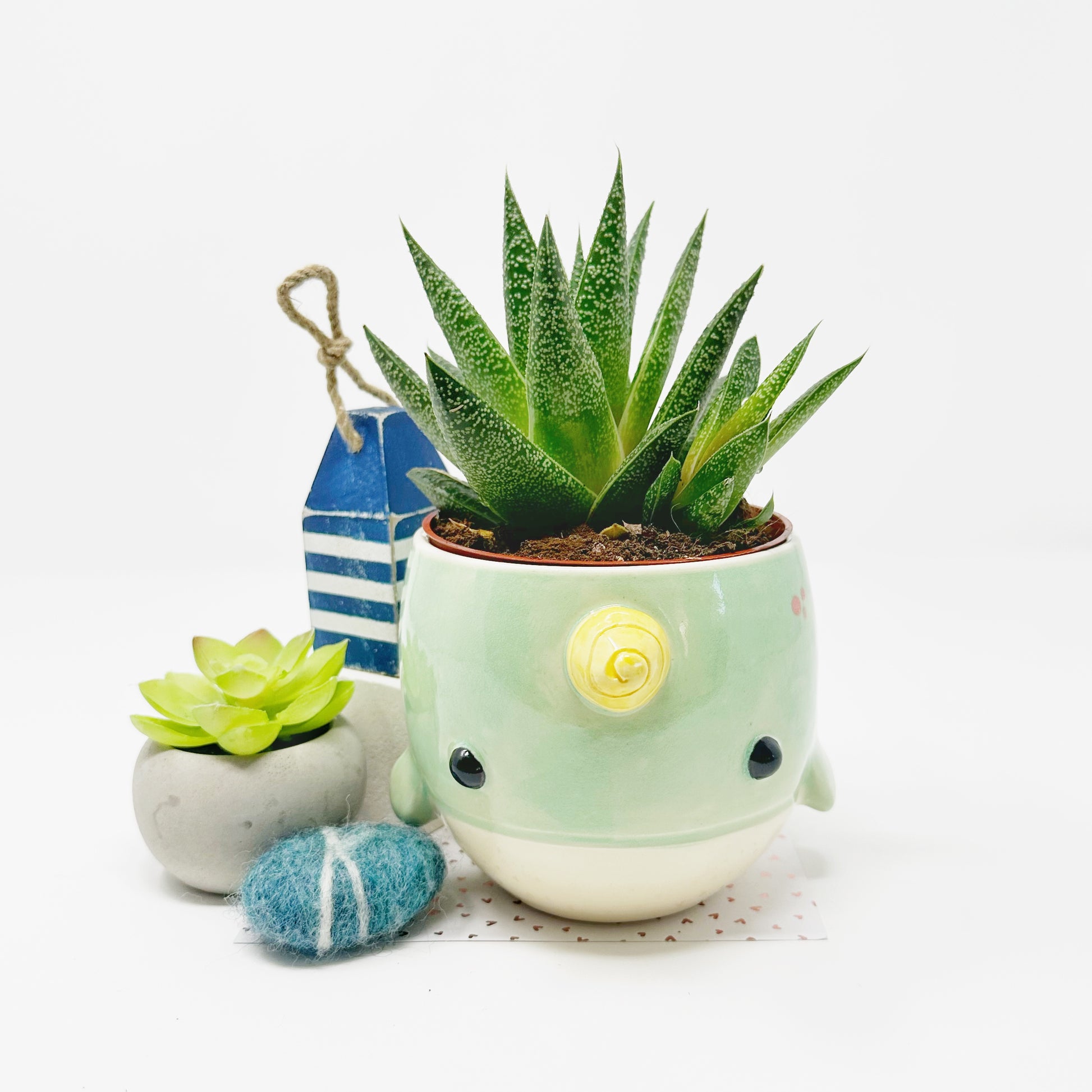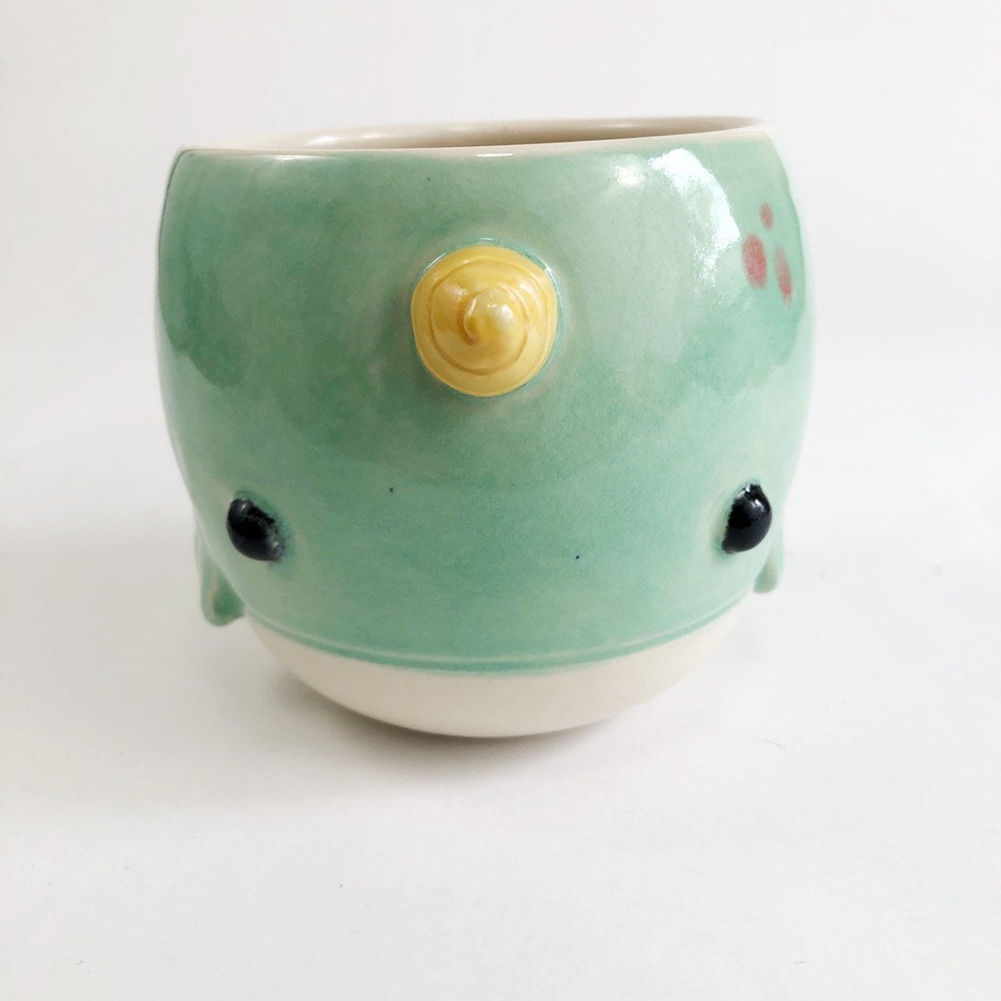 This delightful little narwhal planter is a perfect addition to your living room, home office or bathroom. Standing at 3.5” tall and approximately 4” wide it will hold a succulent or two or a small leafy plant. This handcrafted item is also suitable as a bowl and the perfect size for soup, ice cream, snacks and fruit (if you're into that kind of thing).