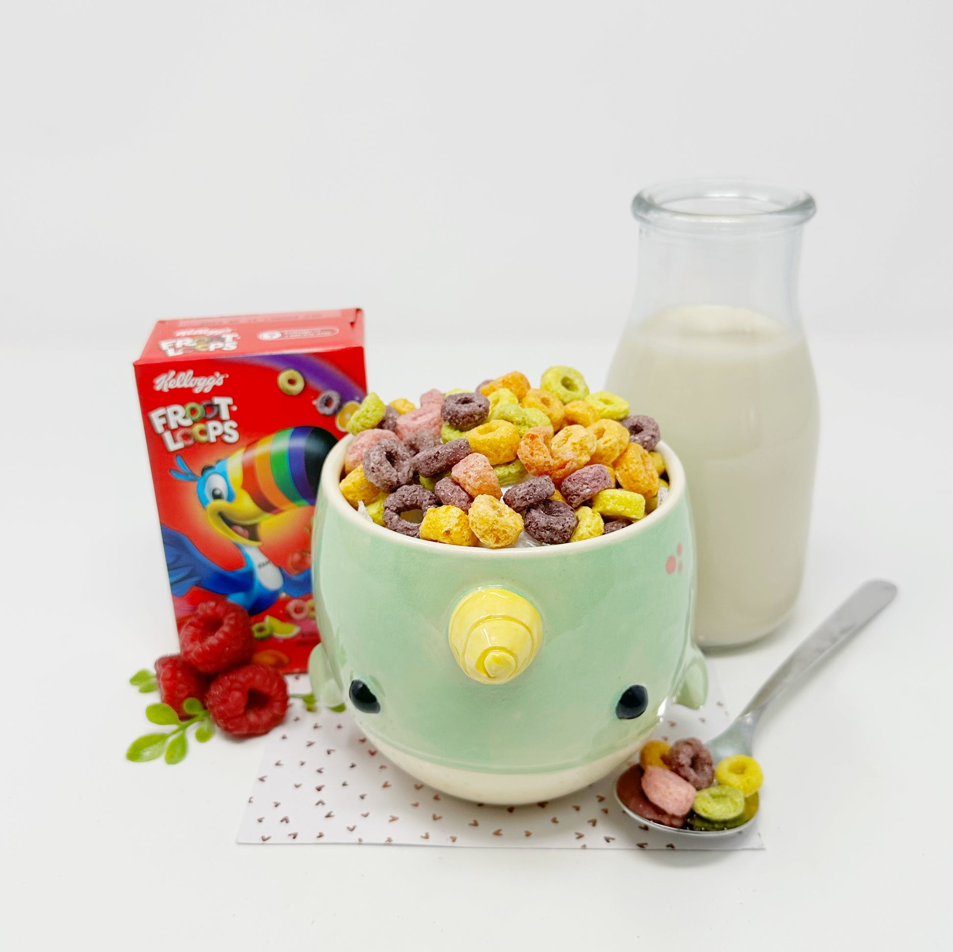 Our bowls are lovingly created on the wheel and then the features are built on by hand. Since all of our items are built one at a time, no two are exactly the same. Our creations are also hand painted adding to the unique design on every pice. You may be able to see our hands at work in the brush strokes of the glaze.