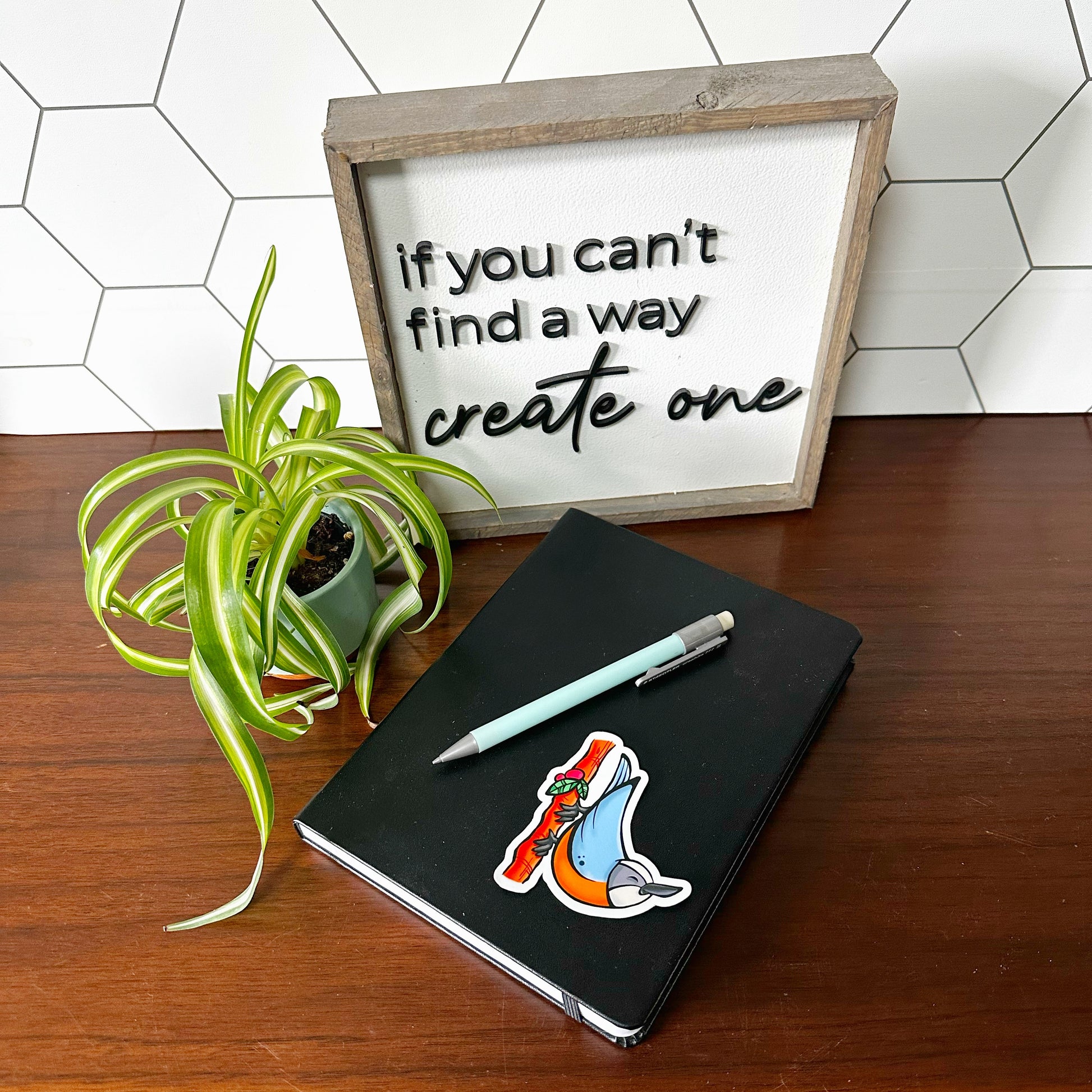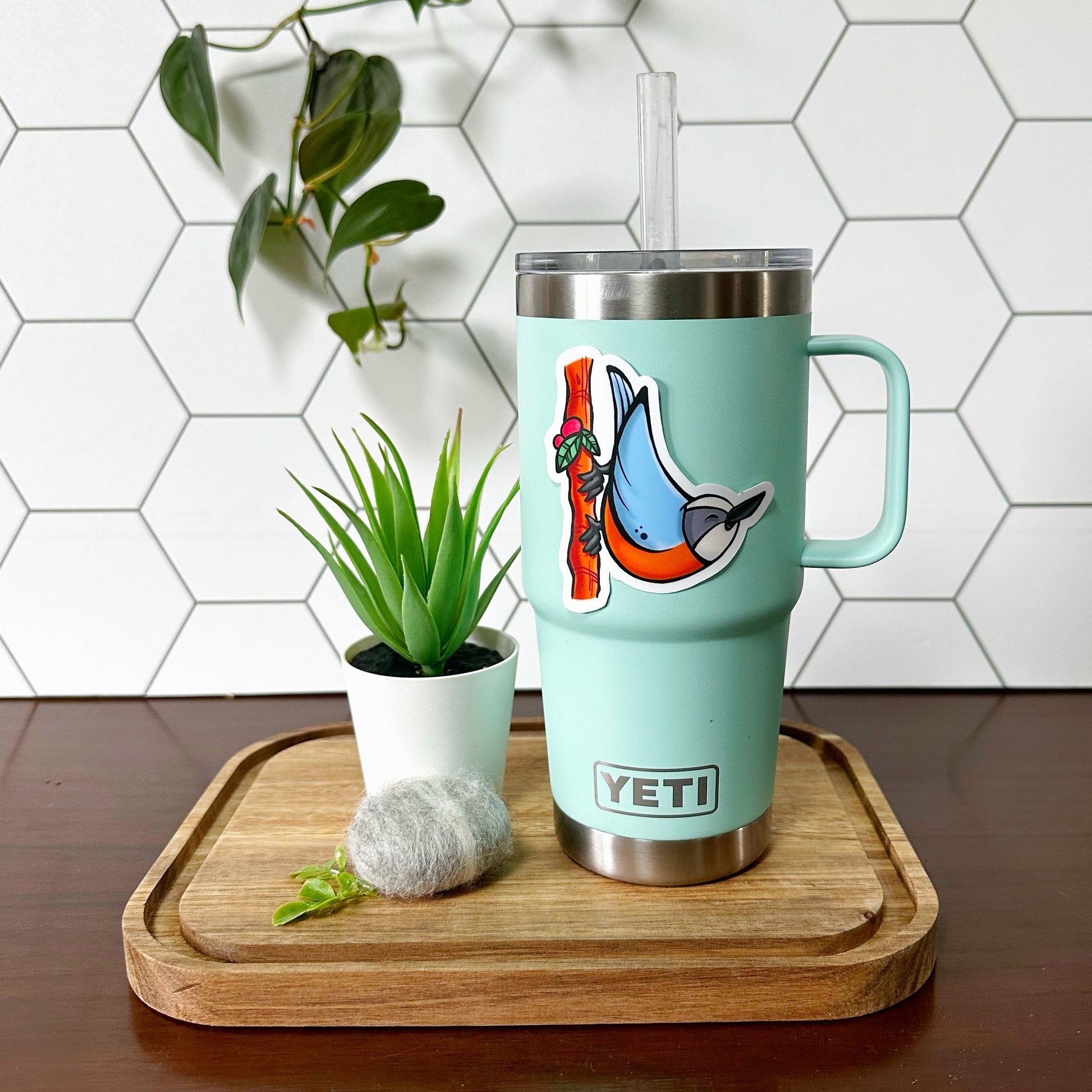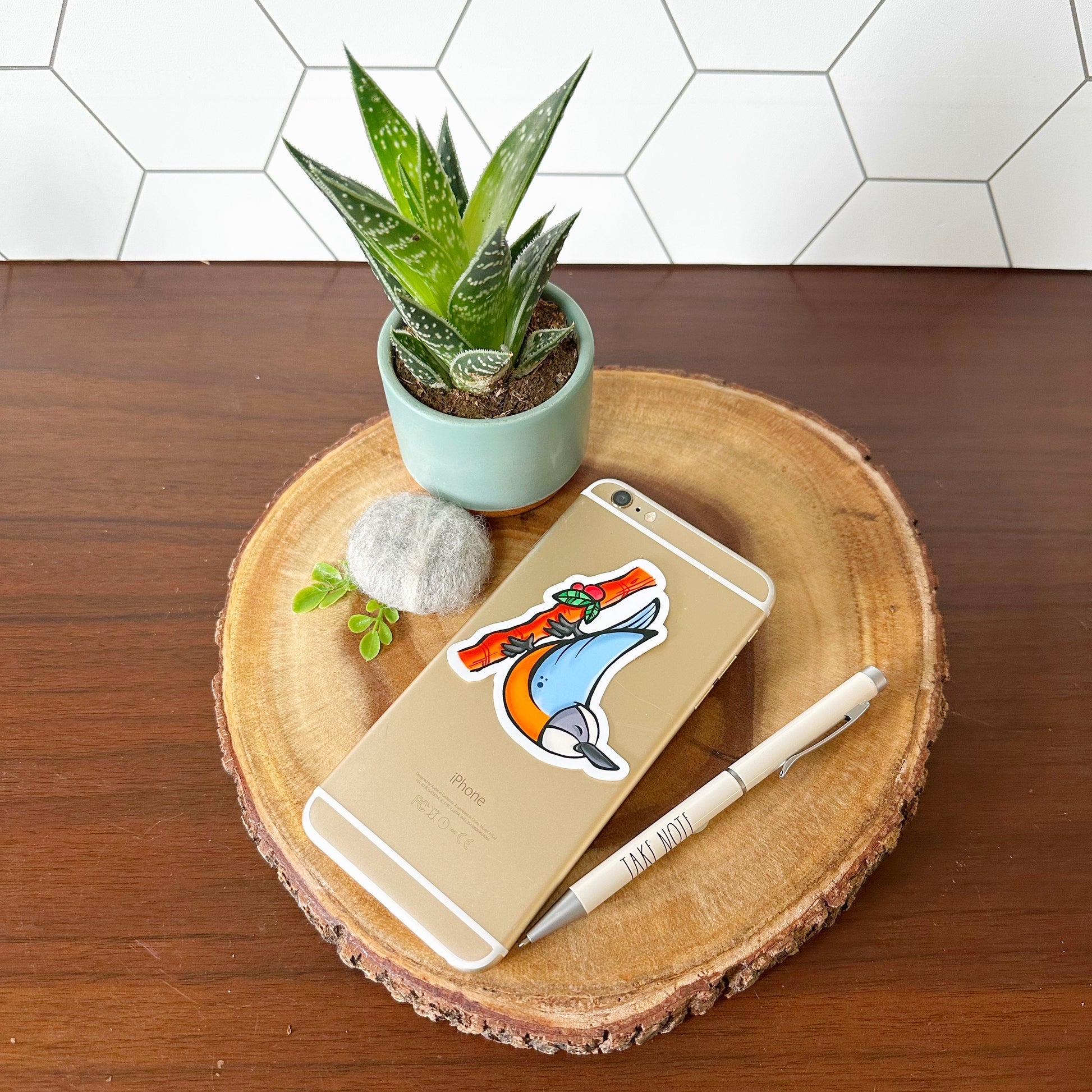 Adorable illustrated nuthatch die cut vinyl sticker.