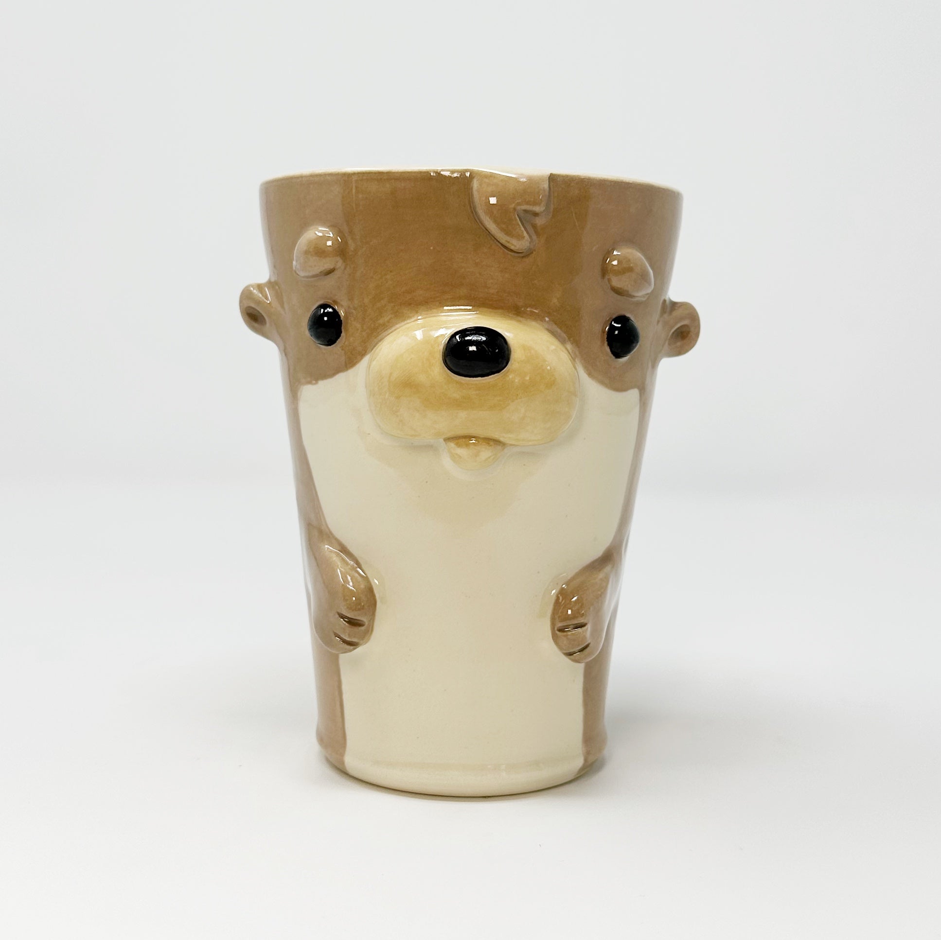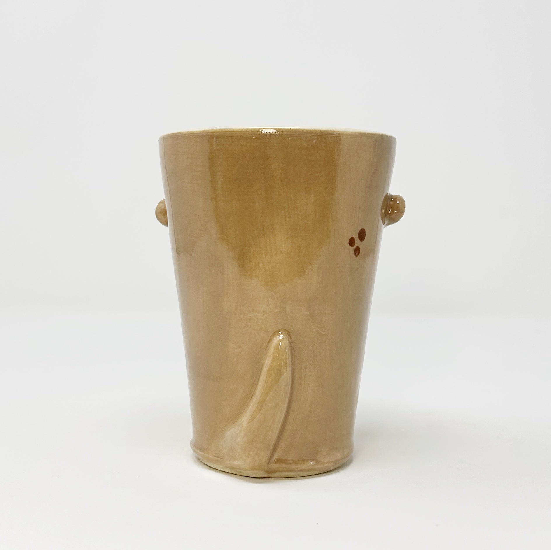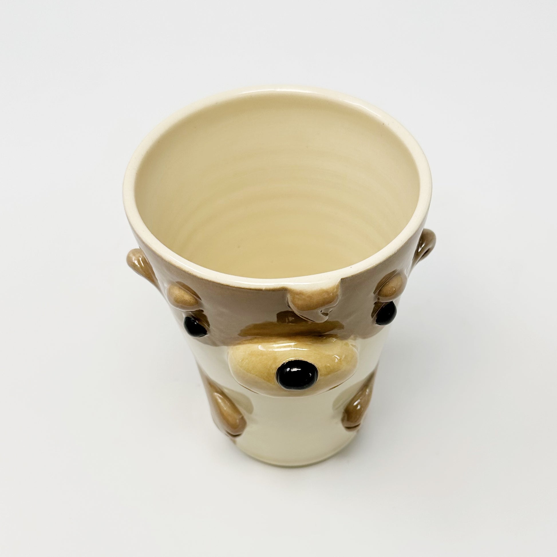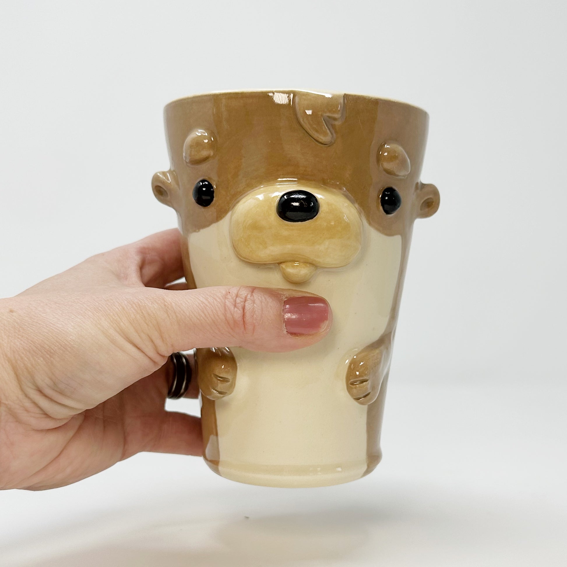 This tumbler is lovingly created on the wheel and then the features are built on by hand. Since all of our tumblers are built one at a time, no two items are exactly the same. Our tumblers are also hand painted adding to the unique design on every mug. You may be able to see our hands at work in the brush strokes of the glaze.