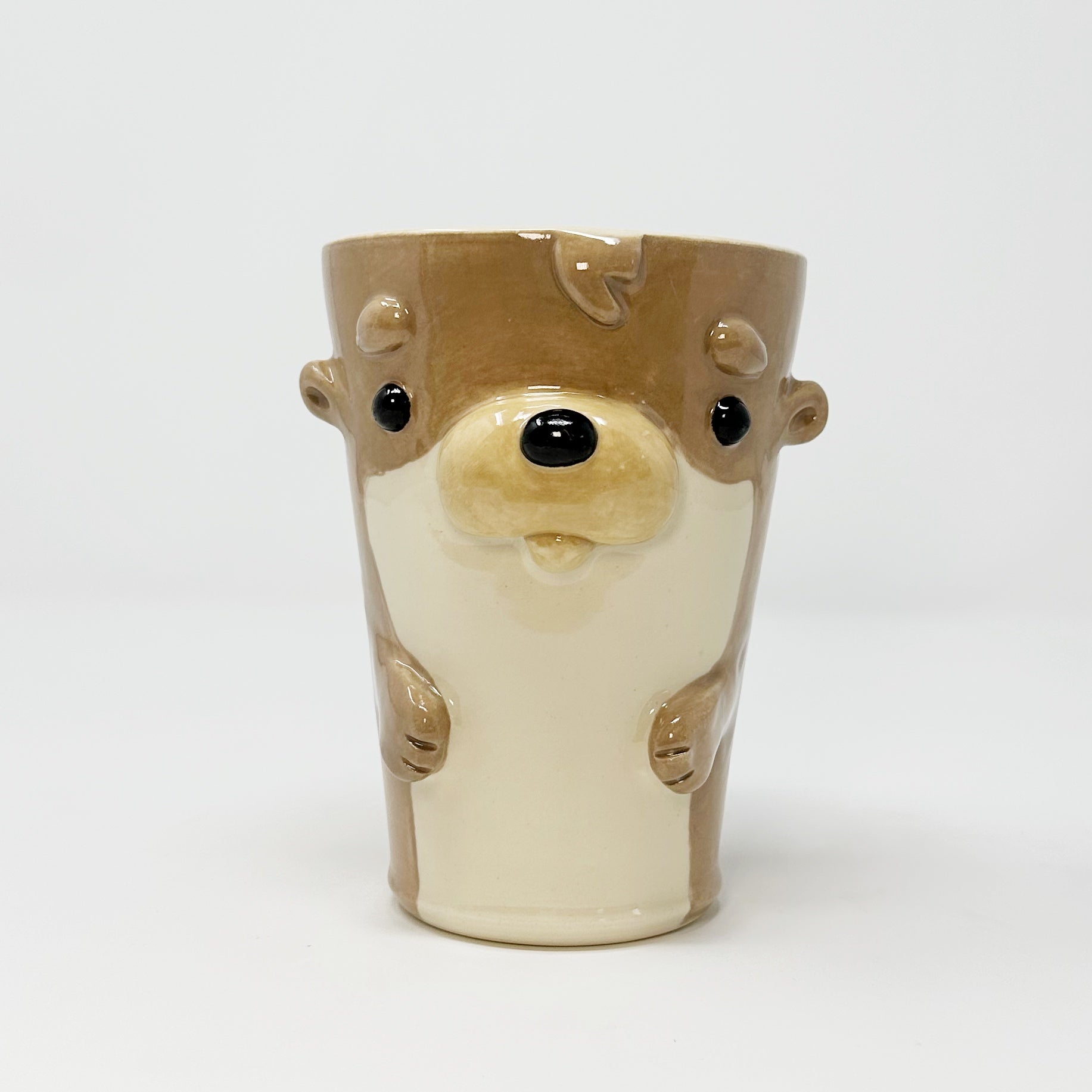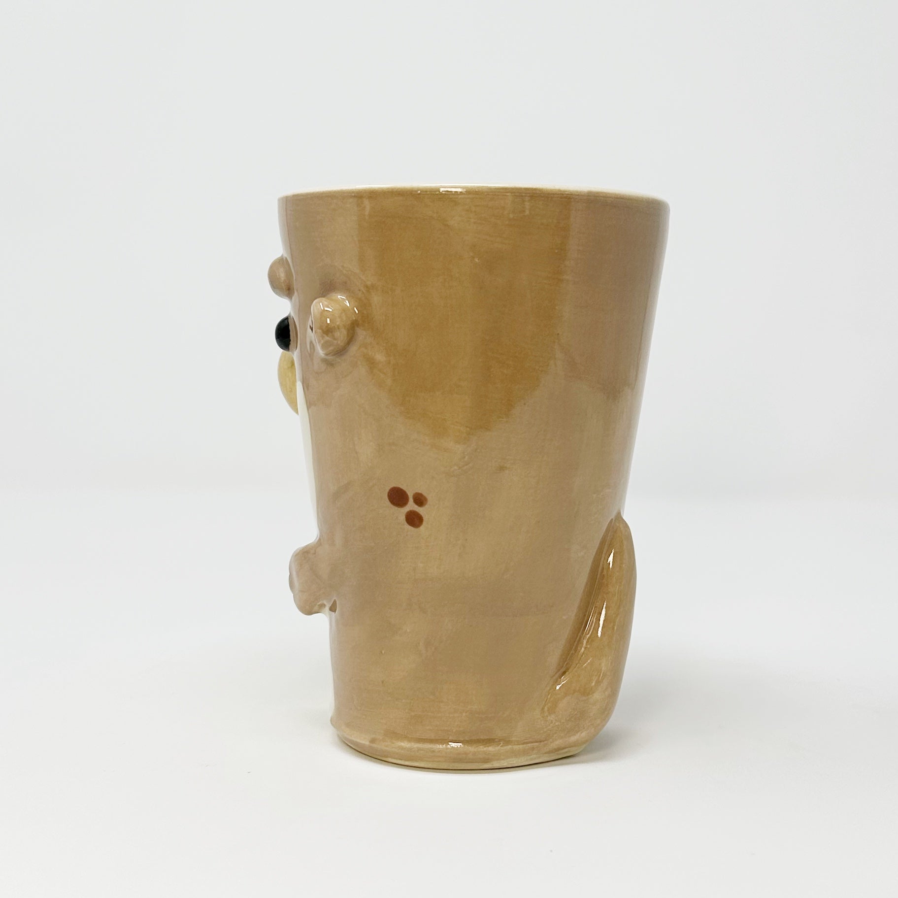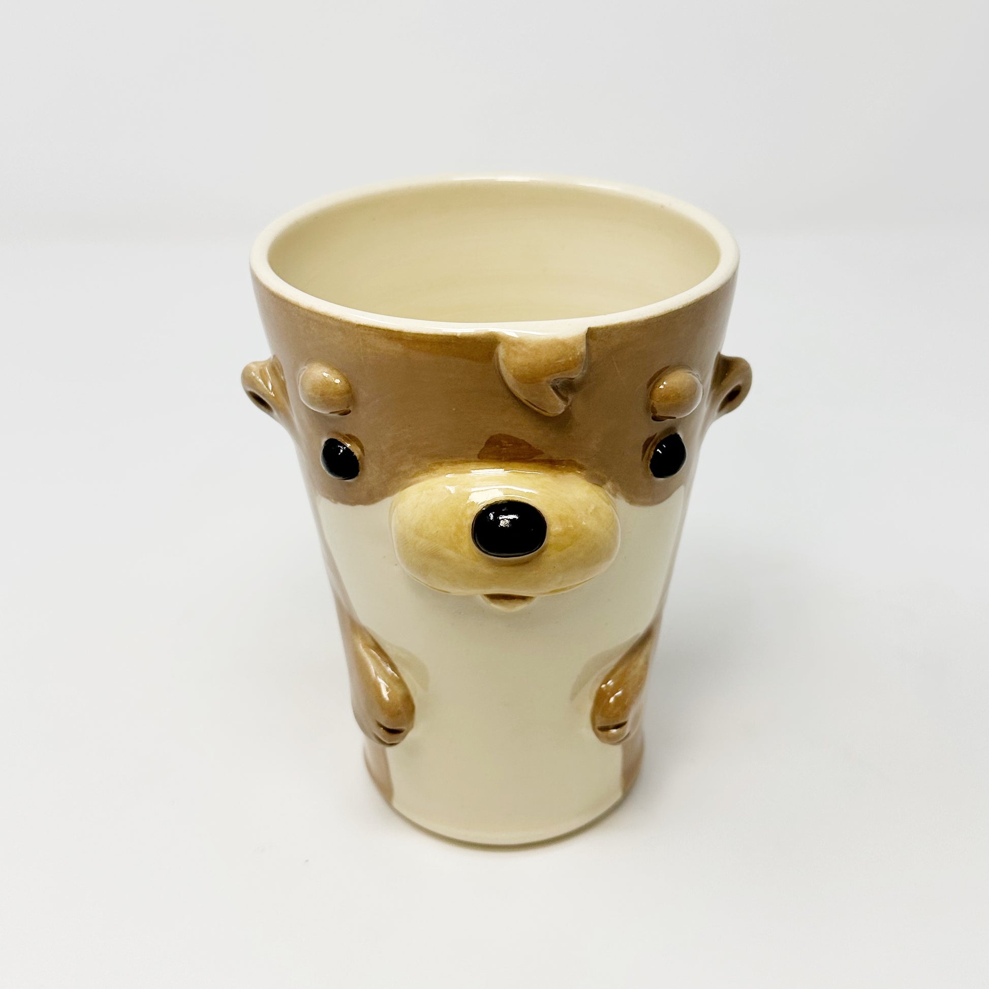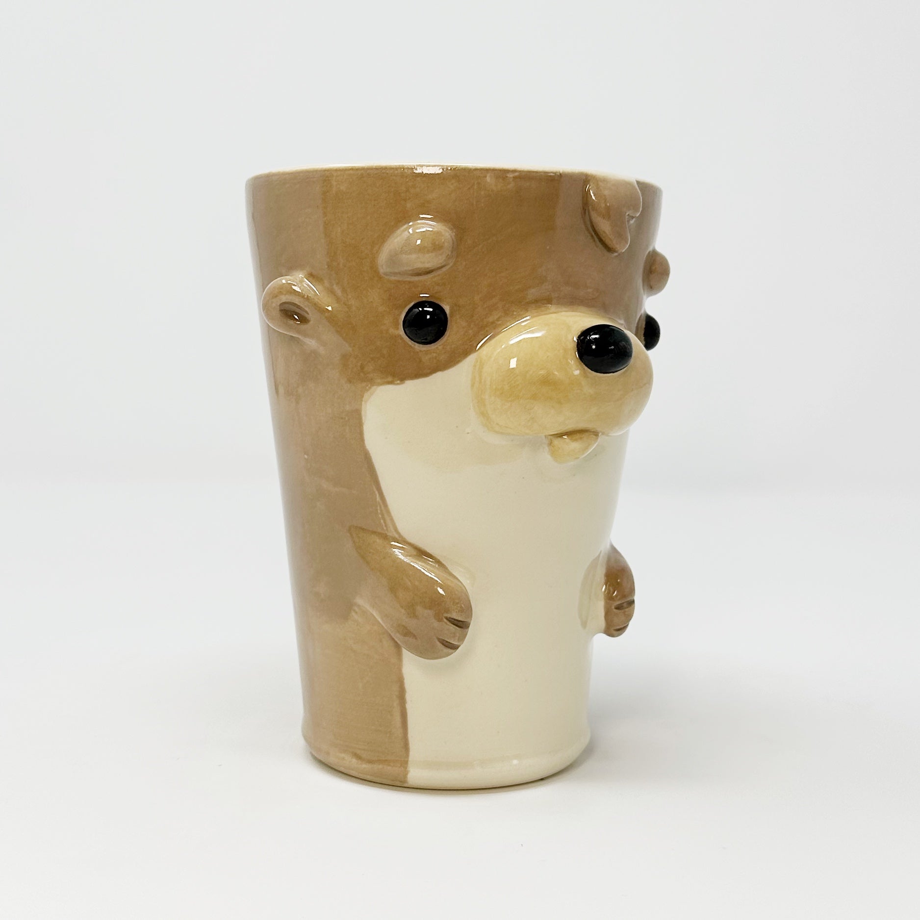 This tumbler is lovingly created on the wheel and then the features are built on by hand. Since all of our tumblers are built one at a time, no two items are exactly the same. Our tumblers are also hand painted adding to the unique design on every mug. You may be able to see our hands at work in the brush strokes of the glaze.