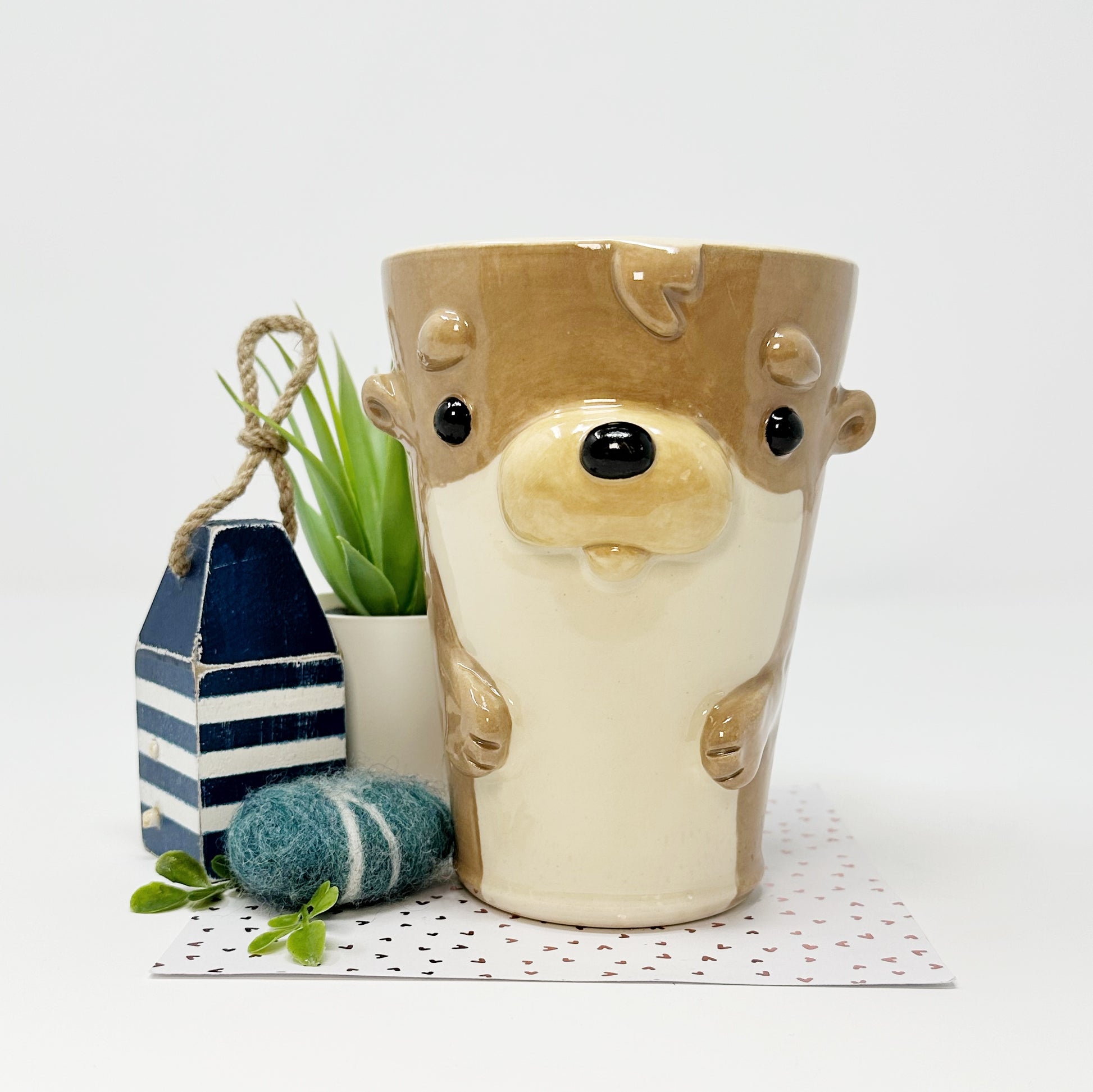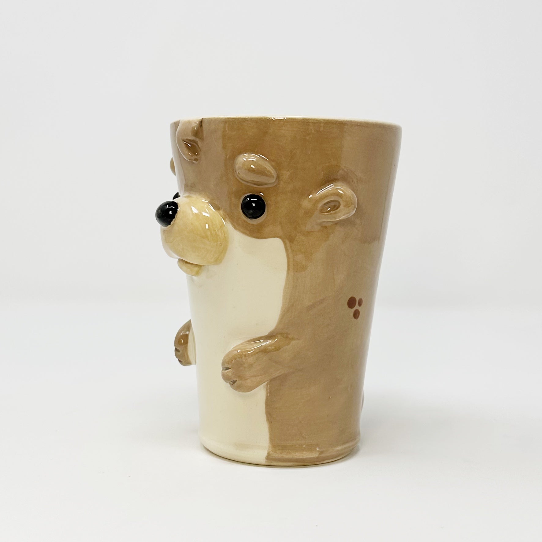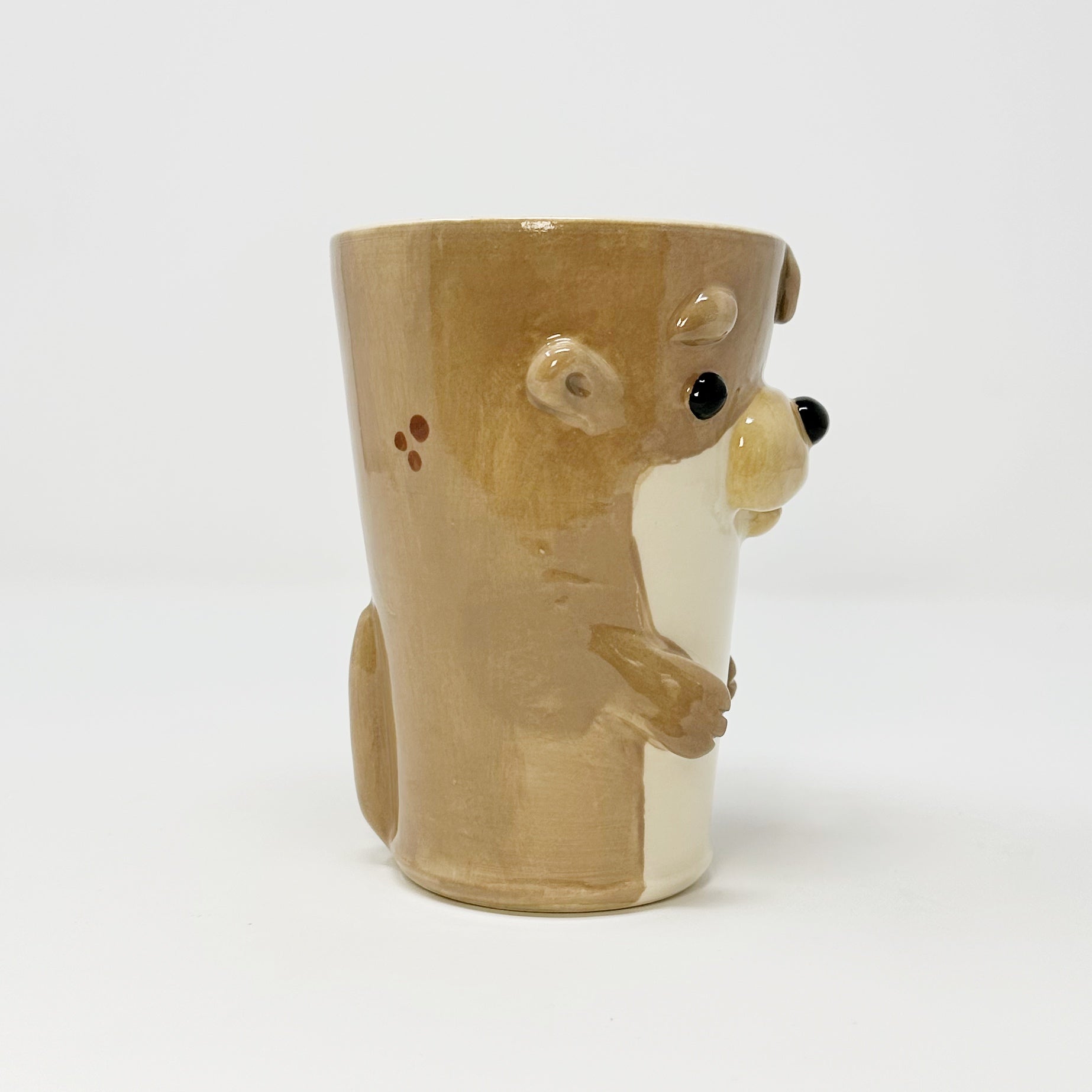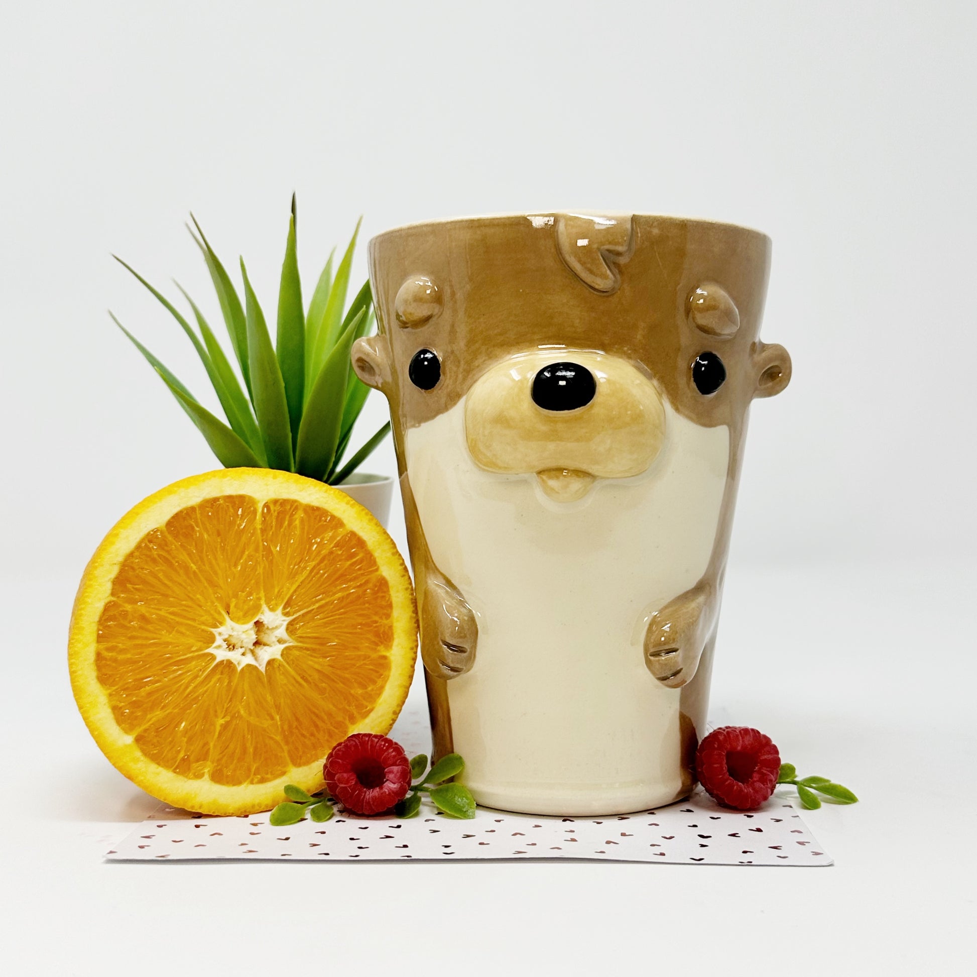 This tumbler is lovingly created on the wheel and then the features are built on by hand. Since all of our tumblers are built one at a time, no two items are exactly the same. Our tumblers are also hand painted adding to the unique design on every mug. You may be able to see our hands at work in the brush strokes of the glaze.