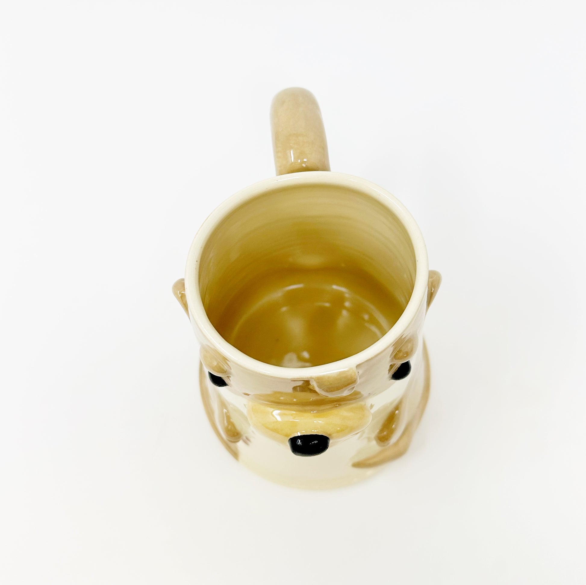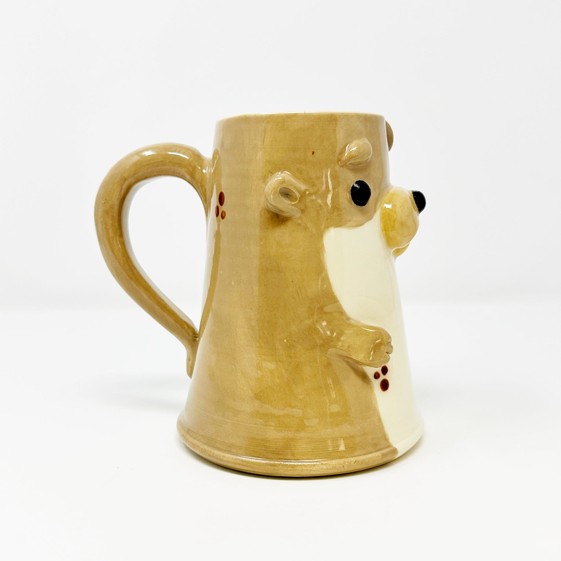 This mug is lovingly created on the wheel and then the features are built on by hand. Since all of our mugs are built one at a time, no two mugs are exactly the same. Our mugs are also hand painted adding to the unique design on every mug. You may be able to see our hands at work in the brush strokes of the glaze. You may also notice some texture in spots. This is part of our handmade quality and the uniqueness to every piece.