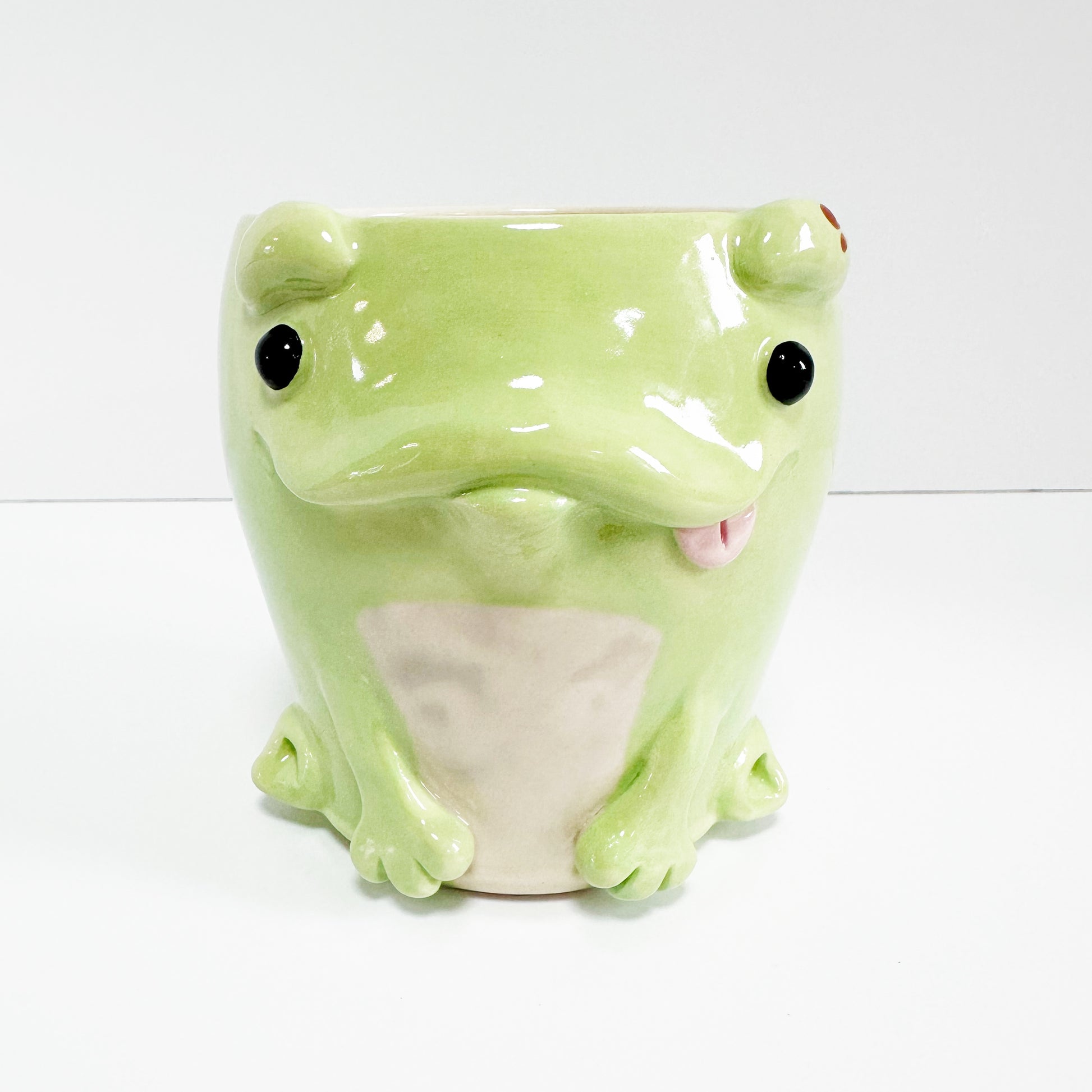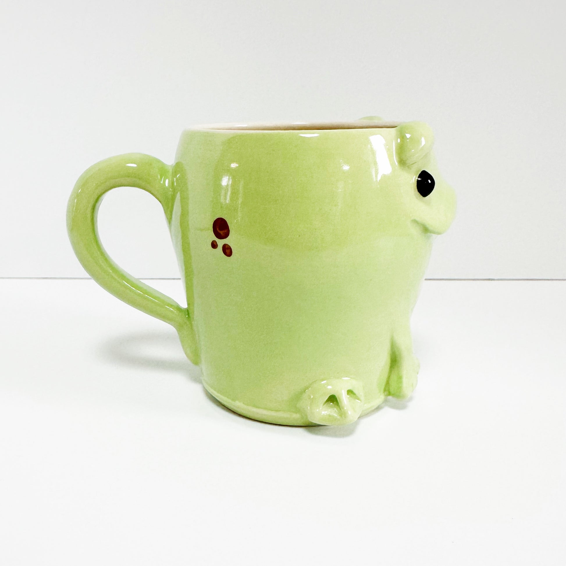 This mug is lovingly created on the wheel and then the features are built on by hand. Since all of our creations are built one at a time, no two are exactly the same. Our products are also hand painted adding to the unique design on every creation. You may be able to see our hands at work in the brush strokes of the glaze. You may also notice some texture in spots. This is part of our handmade quality and the uniqueness to every piece.