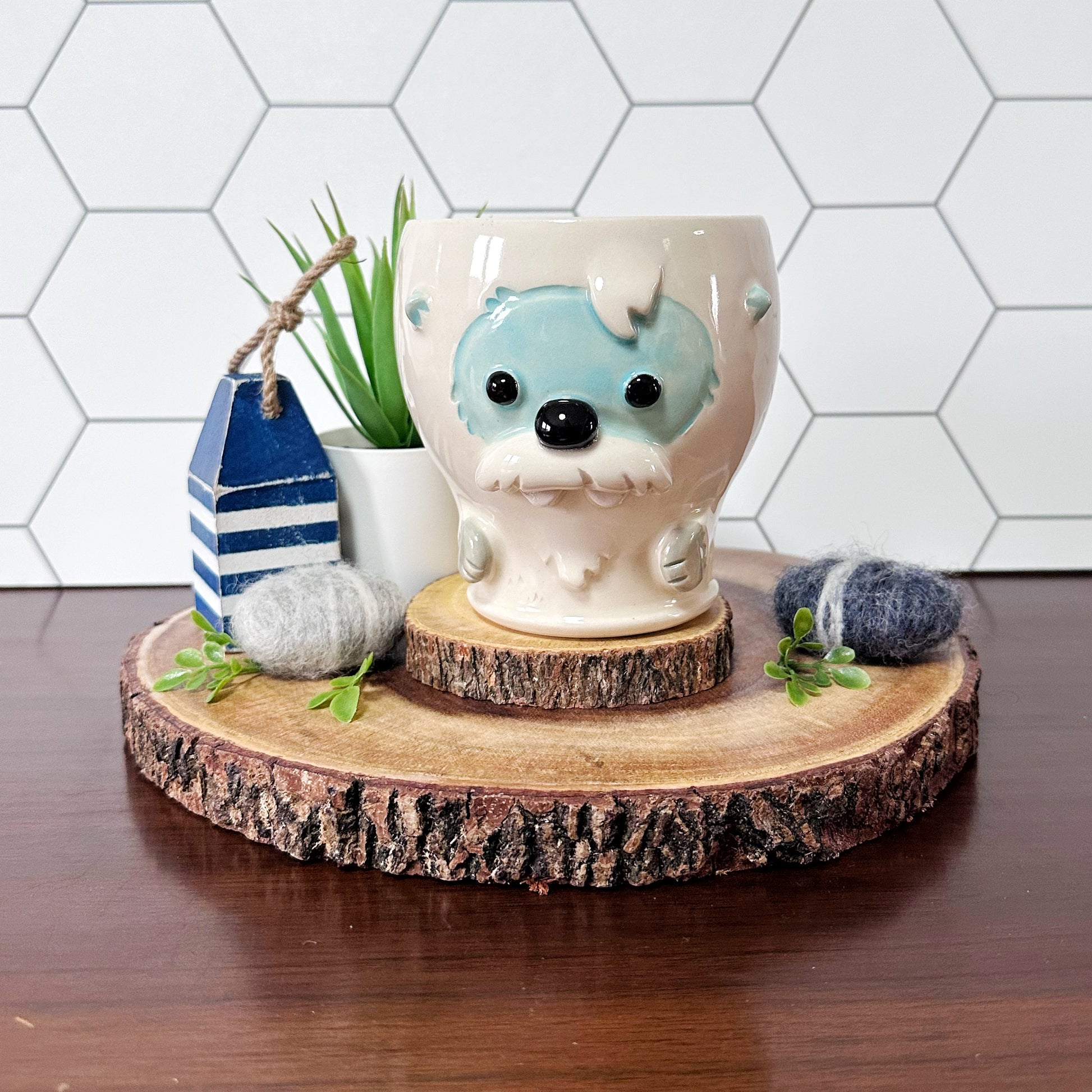 This mug is lovingly created on the wheel and then the features are built on by hand. Since all of our creations are built one at a time, no two are exactly the same. Our products are also hand painted adding to the unique design on every creation. You may be able to see our hands at work in the brush strokes of the glaze. You may also notice some texture in spots. This is part of our handmade quality and the uniqueness to every piece.