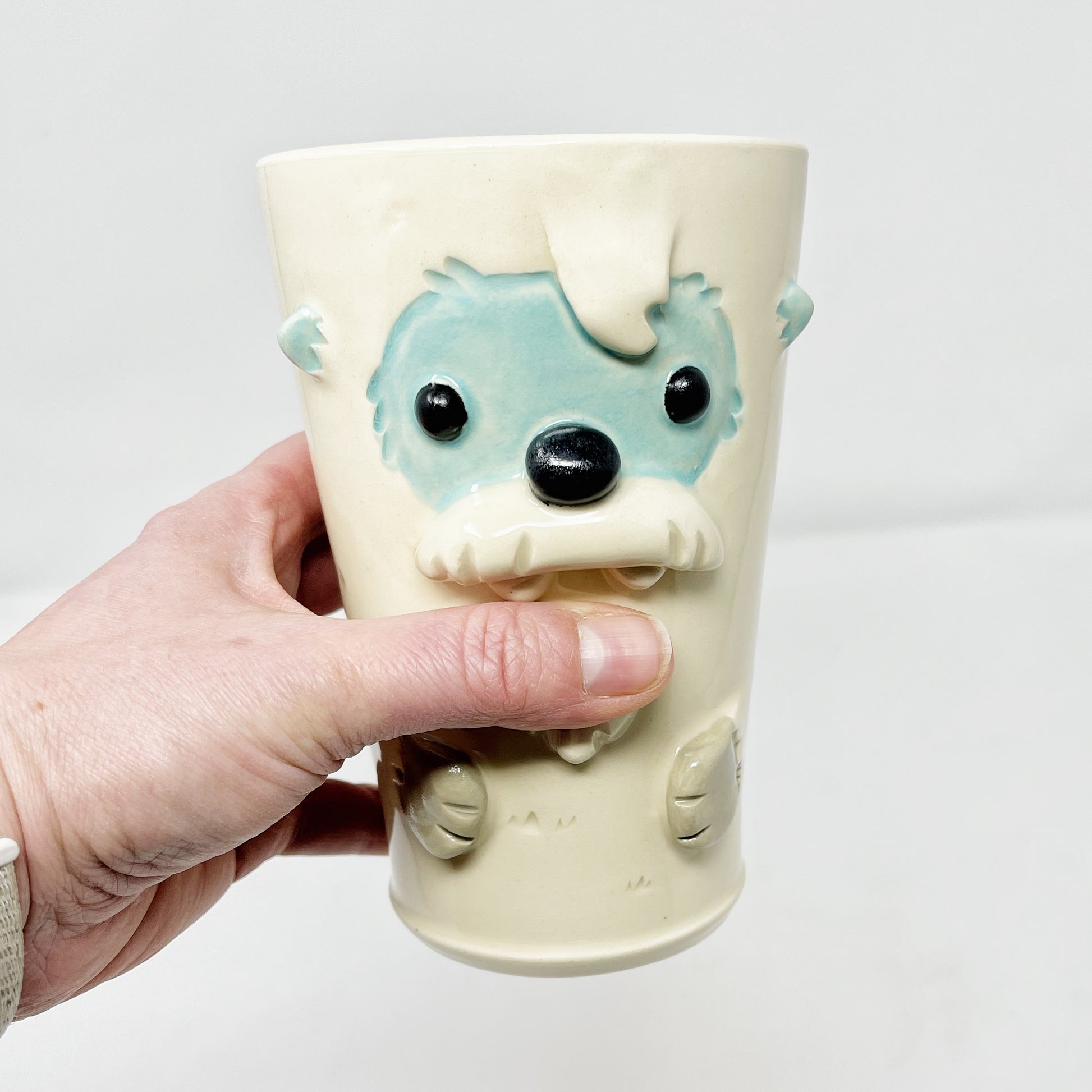 This tumbler is lovingly created on the wheel and then the features are built on by hand. Since all of our tumblers are built one at a time, no two items are exactly the same. Our tumblers are also hand painted adding to the unique design on every mug. You may be able to see our hands at work in the brush strokes of the glaze.