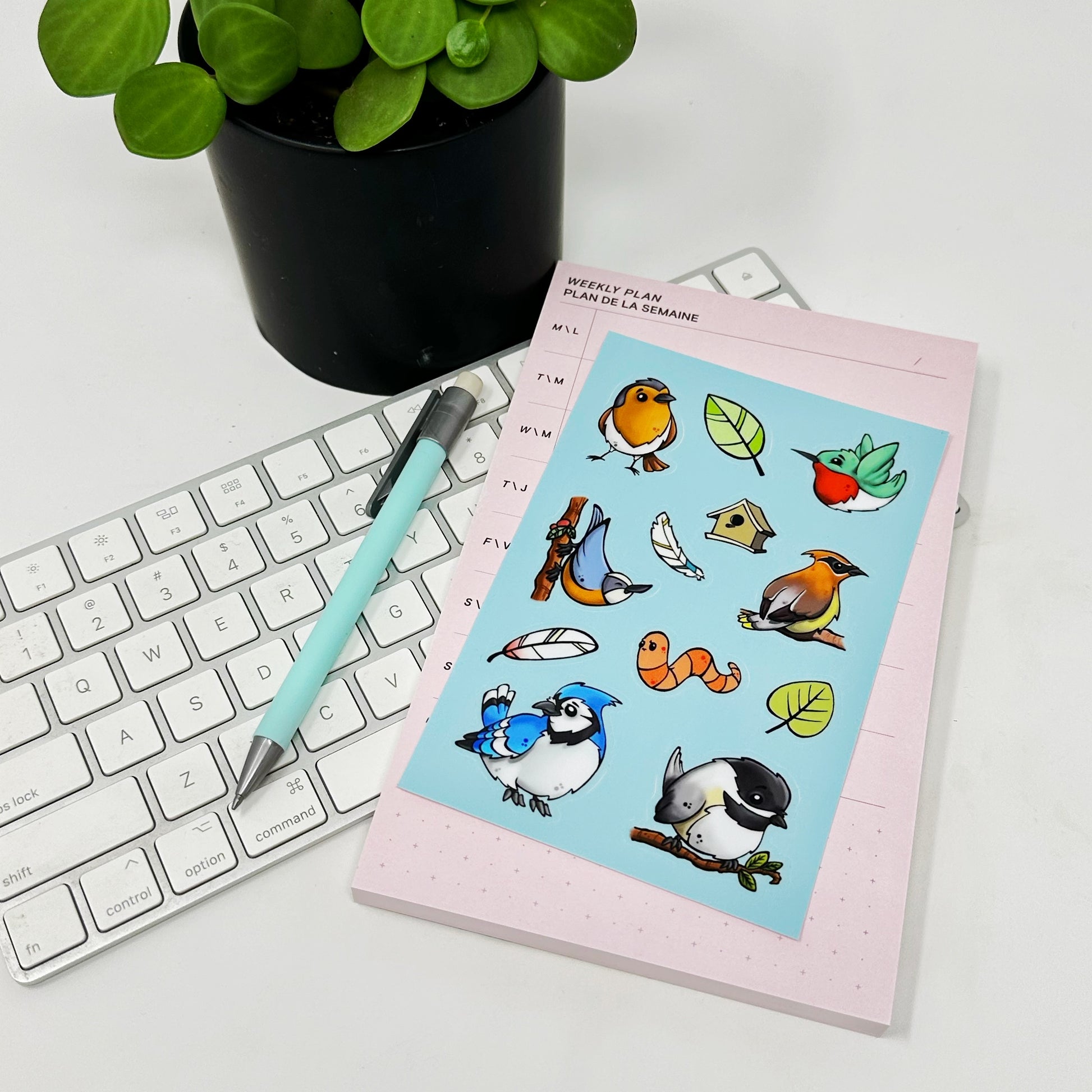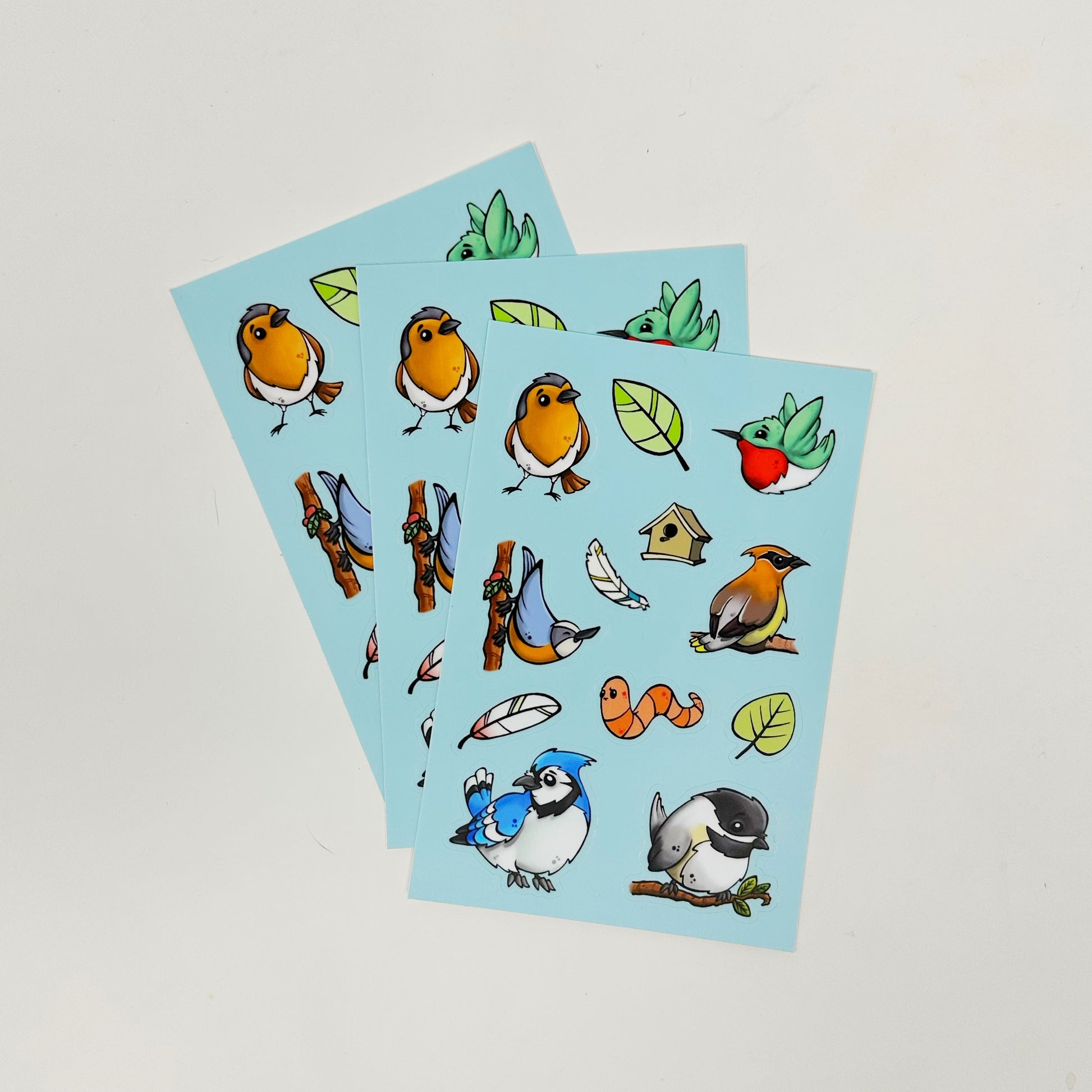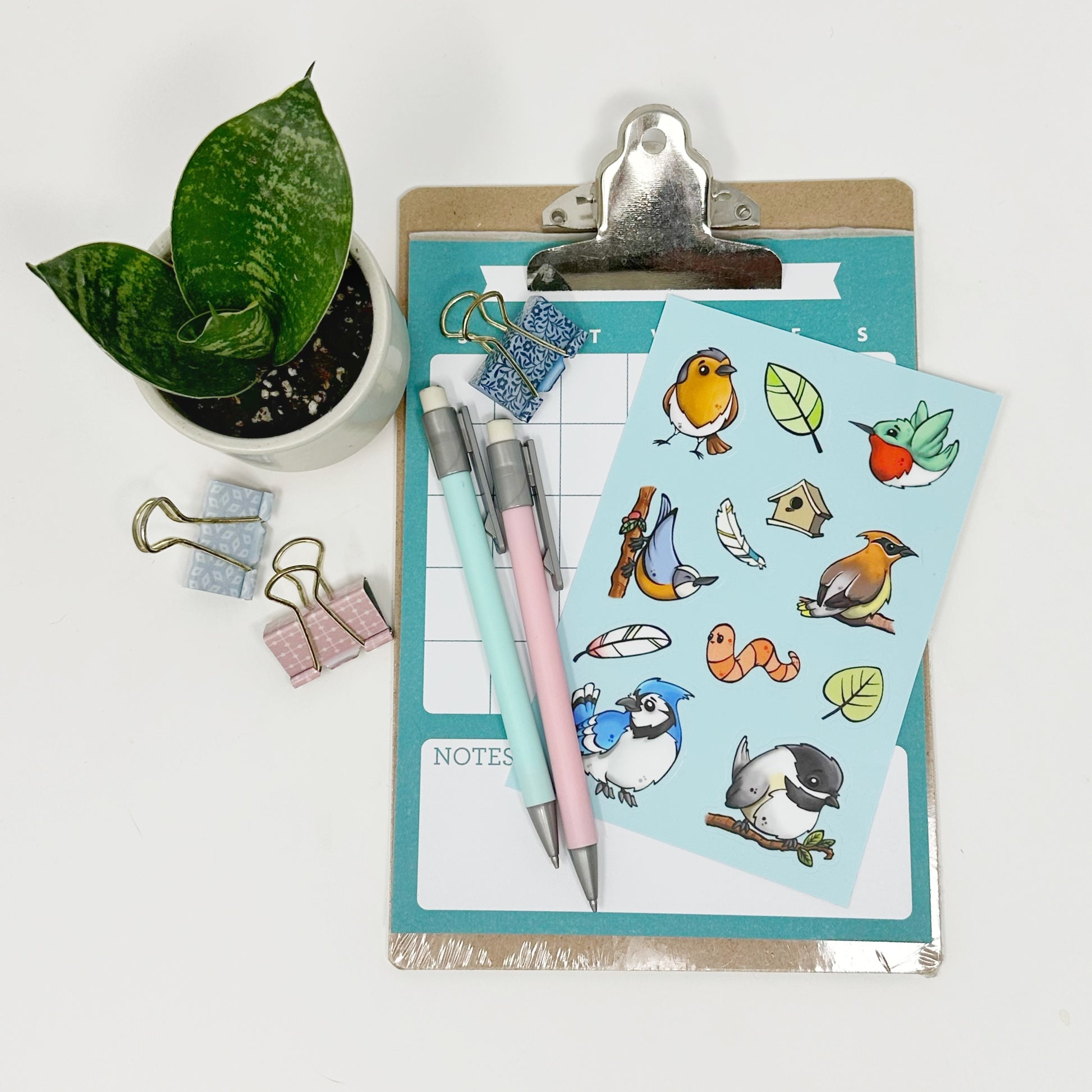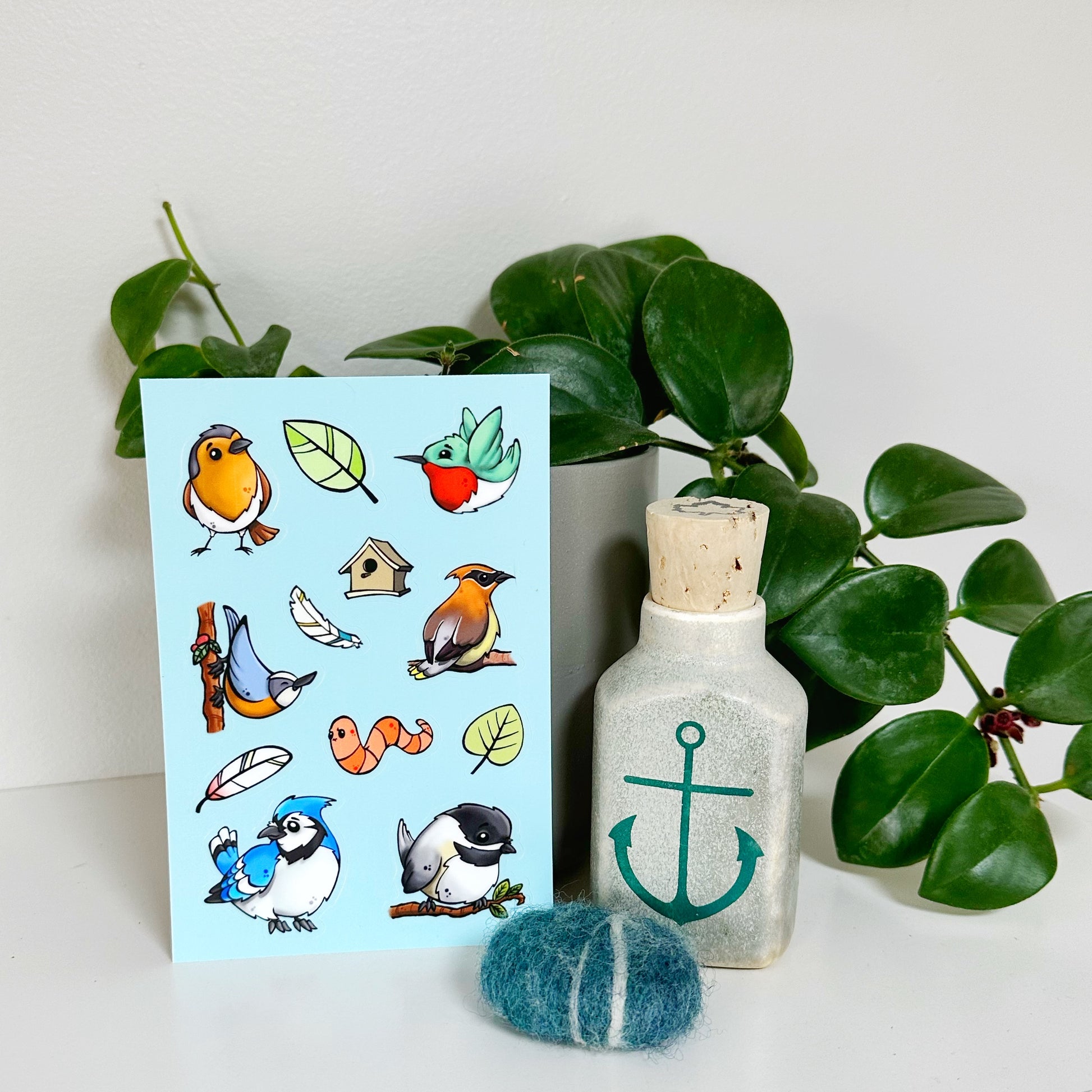 Sticker sheet for the bird lover! This sticker sheet comes with 12 individual stickers including a Robin, Humming Bird, Nuthatch, Cedar Waxwing, Blue Jay, Chickadee, a worm, two feathers, two leaves and a bird house.
