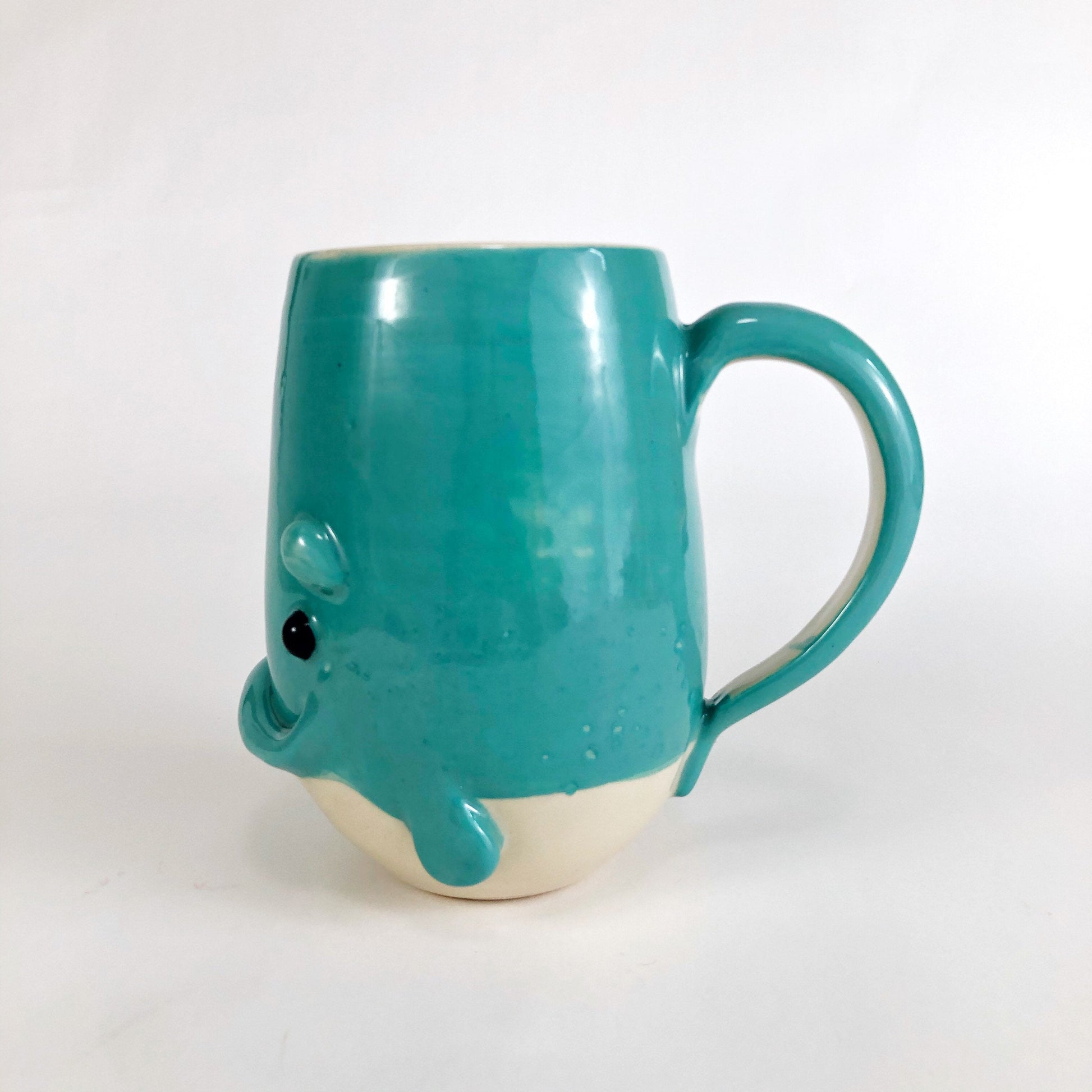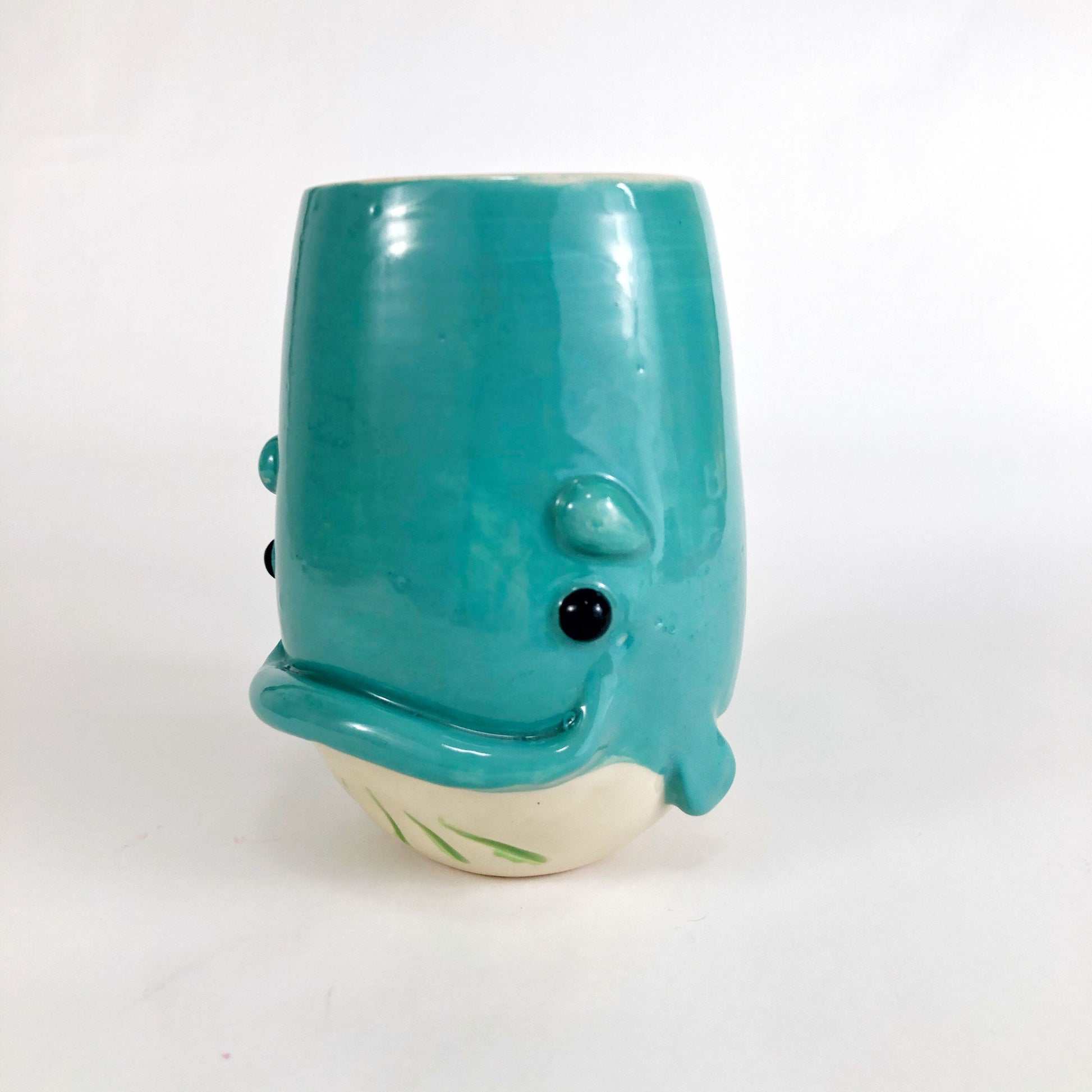 This mug is lovingly created on the wheel and then the features are built on by hand. Since all of our mugs are built one at a time, no two mugs are exactly the same. Our mugs are also hand painted adding to the unique design on every mug. You may be able to see our hands at work in the brush strokes of the glaze. You may also notice some texture in spots. This is part of our handmade quality and the uniqueness to every piece.