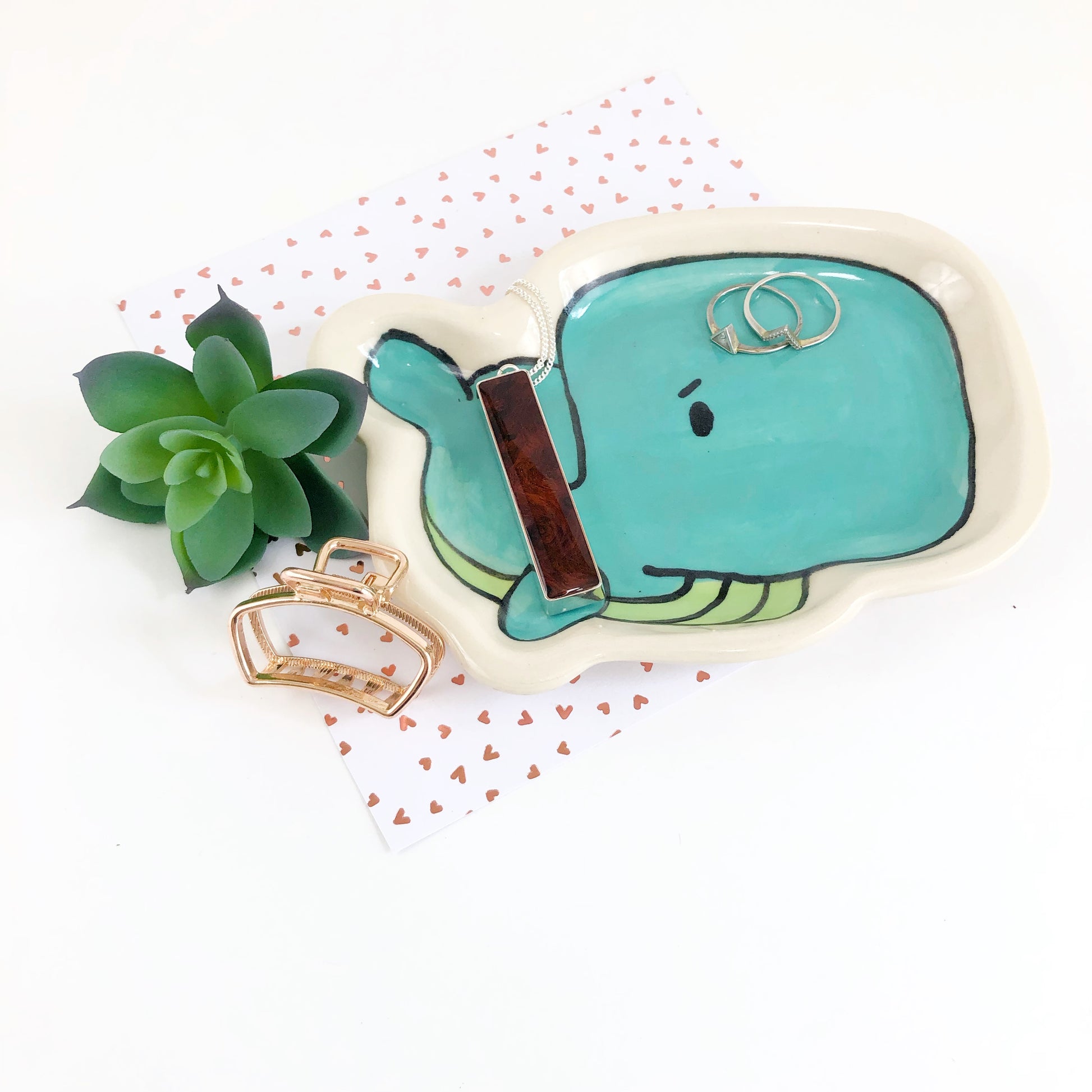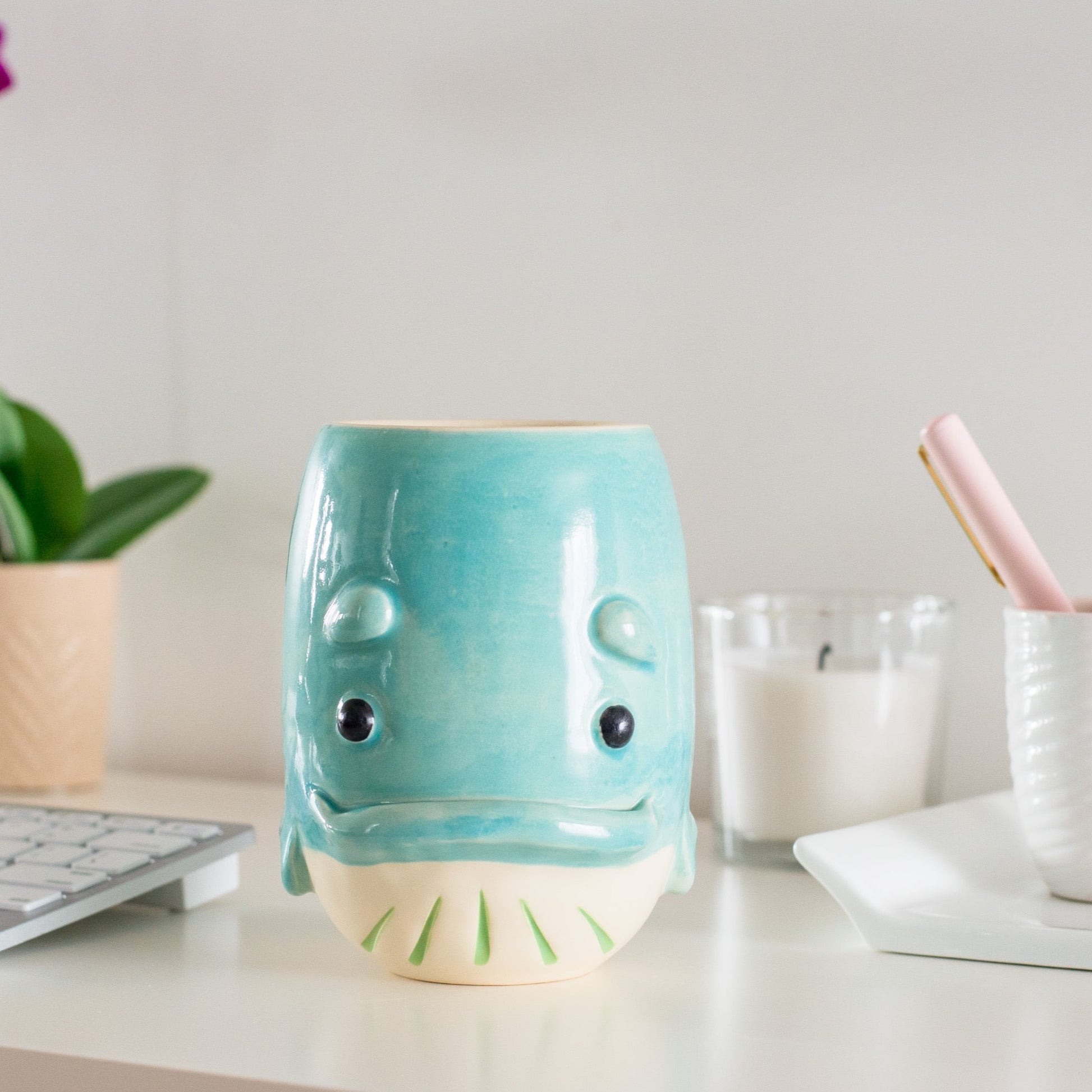 Our mugs are all wheel thrown and the details are sculpted by hand and trays are hand pressed in a handmade form. This may mean that your item may not be exactly as pictured. Each piece of pottery is also painted by hand enhancing their unique qualities. You may be able to see our hands at work in the brush strokes of the glaze. Our designs are microwave and dishwasher safe for easy care and convenience.