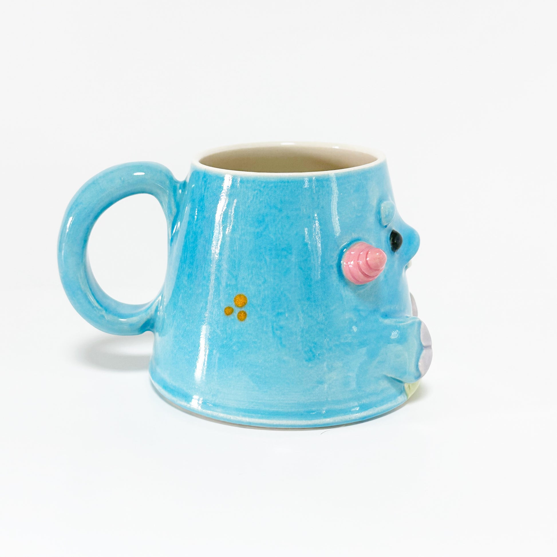 This mug is lovingly created on the wheel and then the features are built on by hand. Since all of our creations are built one at a time, no two are exactly the same. Our products are also hand painted adding to the unique design on every creation. You may be able to see our hands at work in the brush strokes of the glaze. You may also notice some texture in spots. This is part of our handmade quality and the uniqueness to every piece.