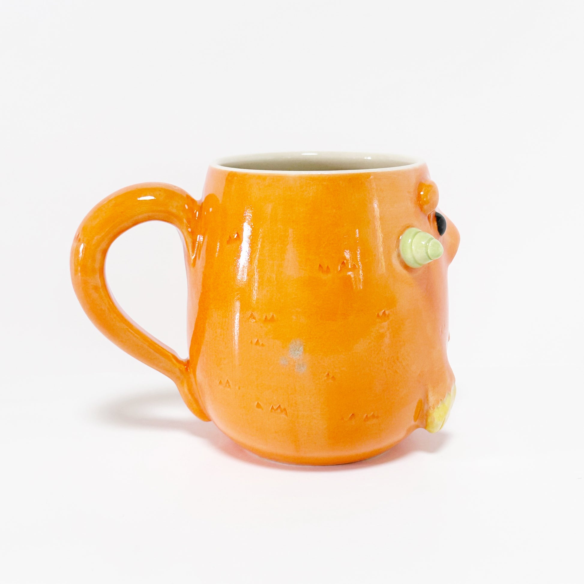 This mug is lovingly created on the wheel and then the features are built on by hand. Since all of our creations are built one at a time, no two are exactly the same. Our products are also hand painted adding to the unique design on every creation. You may be able to see our hands at work in the brush strokes of the glaze. You may also notice some texture in spots. This is part of our handmade quality and the uniqueness to every piece.