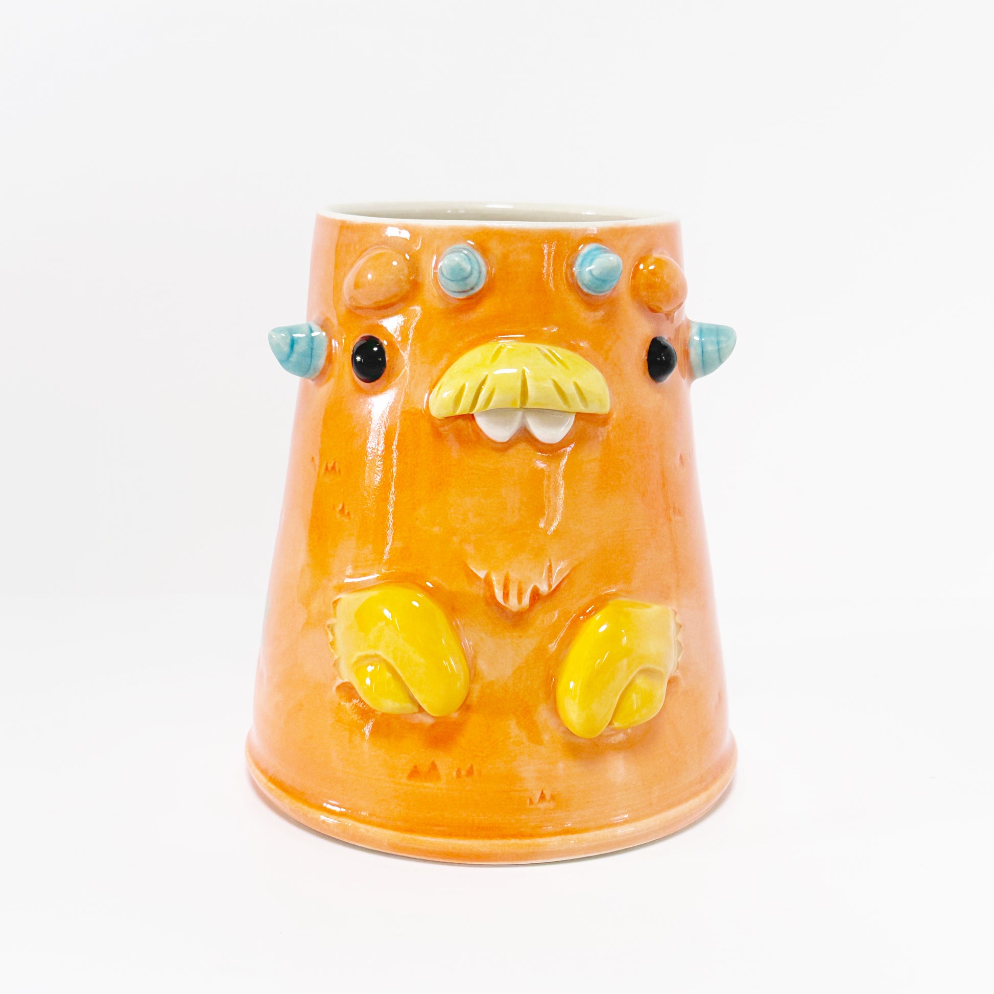 This mug is lovingly created on the wheel and then the features are built on by hand. Since all of our creations are built one at a time, no two are exactly the same. Our products are also hand painted adding to the unique design on every creation. You may be able to see our hands at work in the brush strokes of the glaze. You may also notice some texture in spots. This is part of our handmade quality and the uniqueness to every piece.