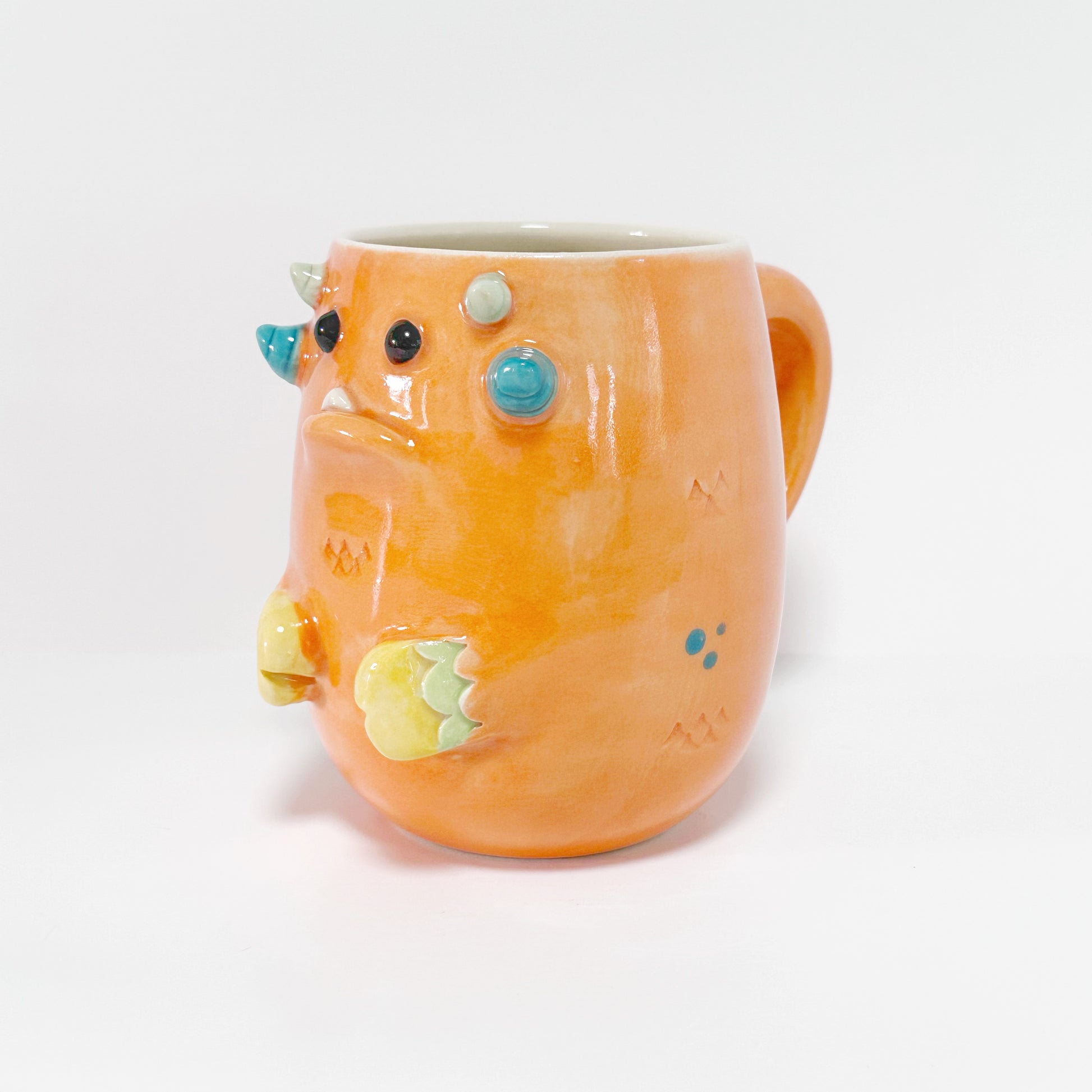 This mug is lovingly created on the wheel and then the features are built on by hand. Since all of our creations are built one at a time, no two are exactly the same. Our products are also hand painted adding to the unique design on every creation. You may be able to see our hands at work in the brush strokes of the glaze. You may also notice some texture in spots. This is part of our handmade quality and the uniqueness to every piece.