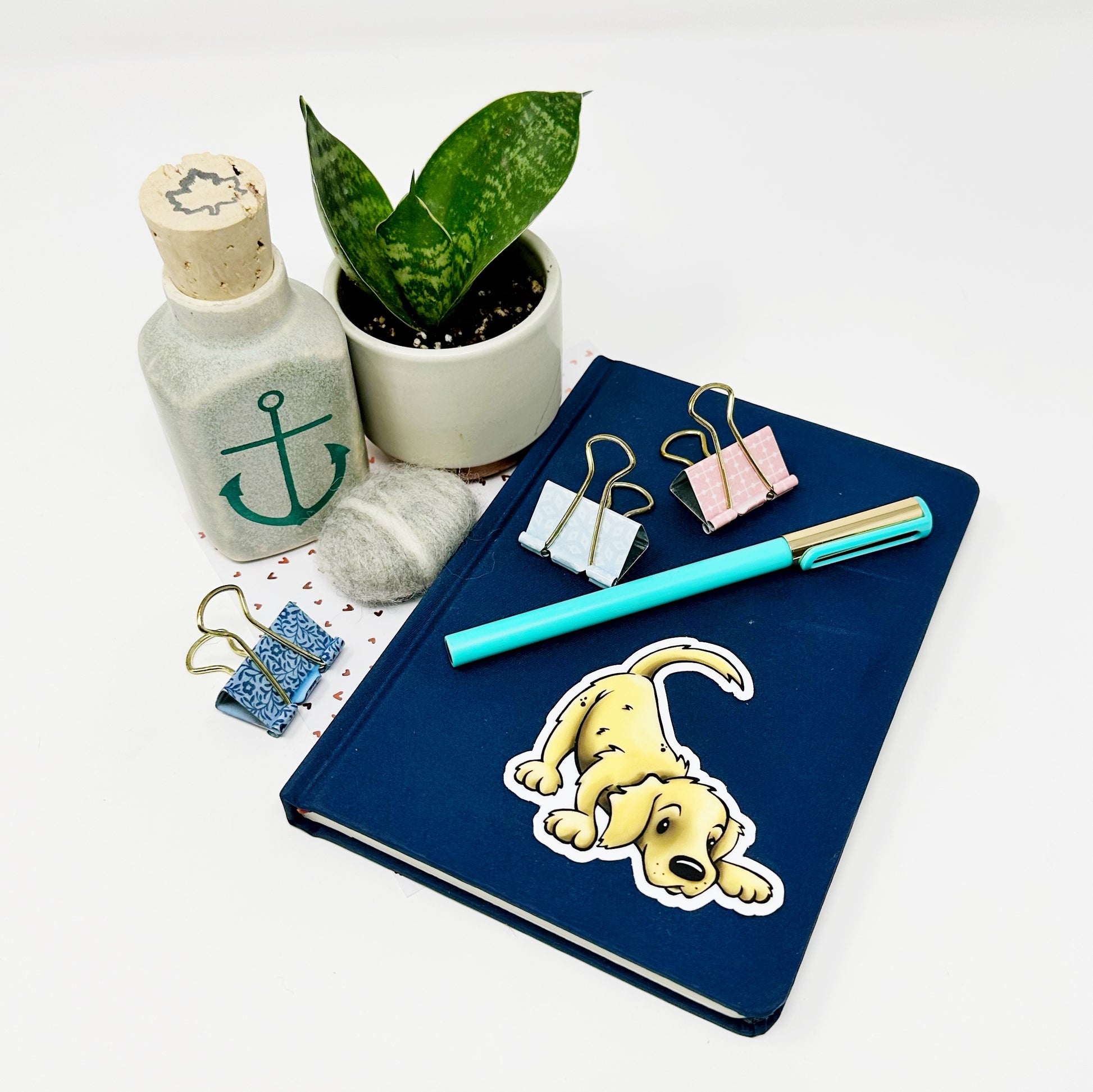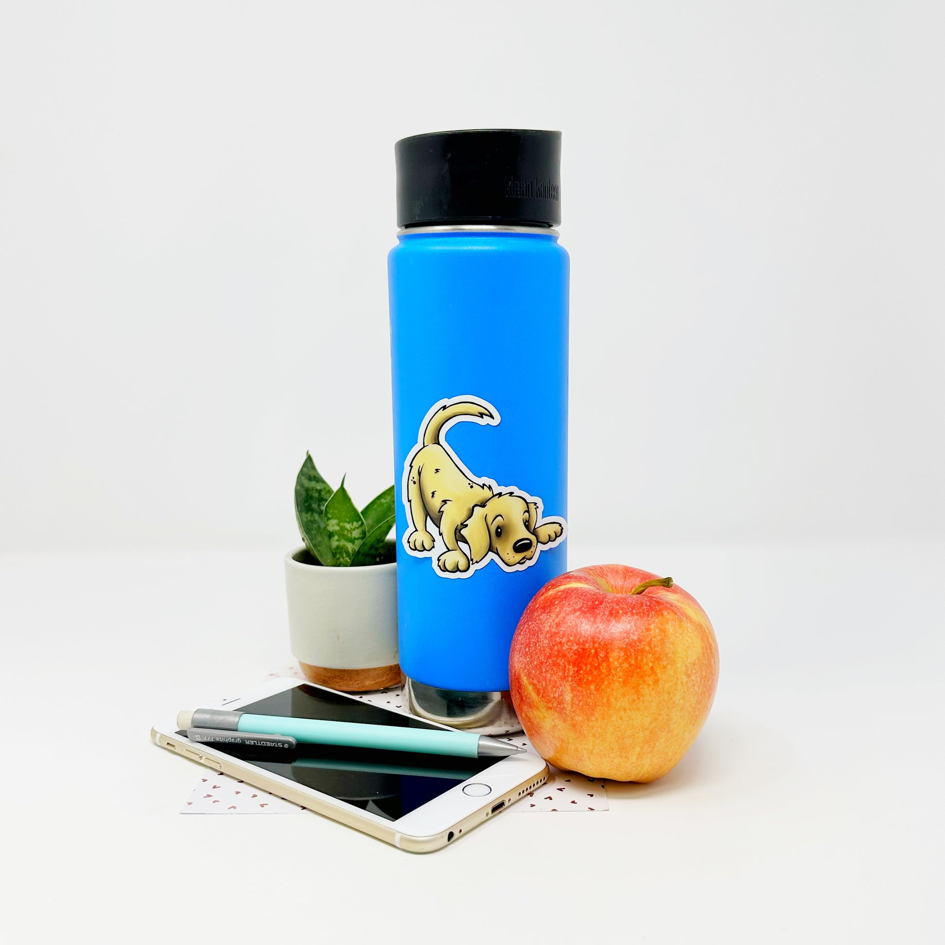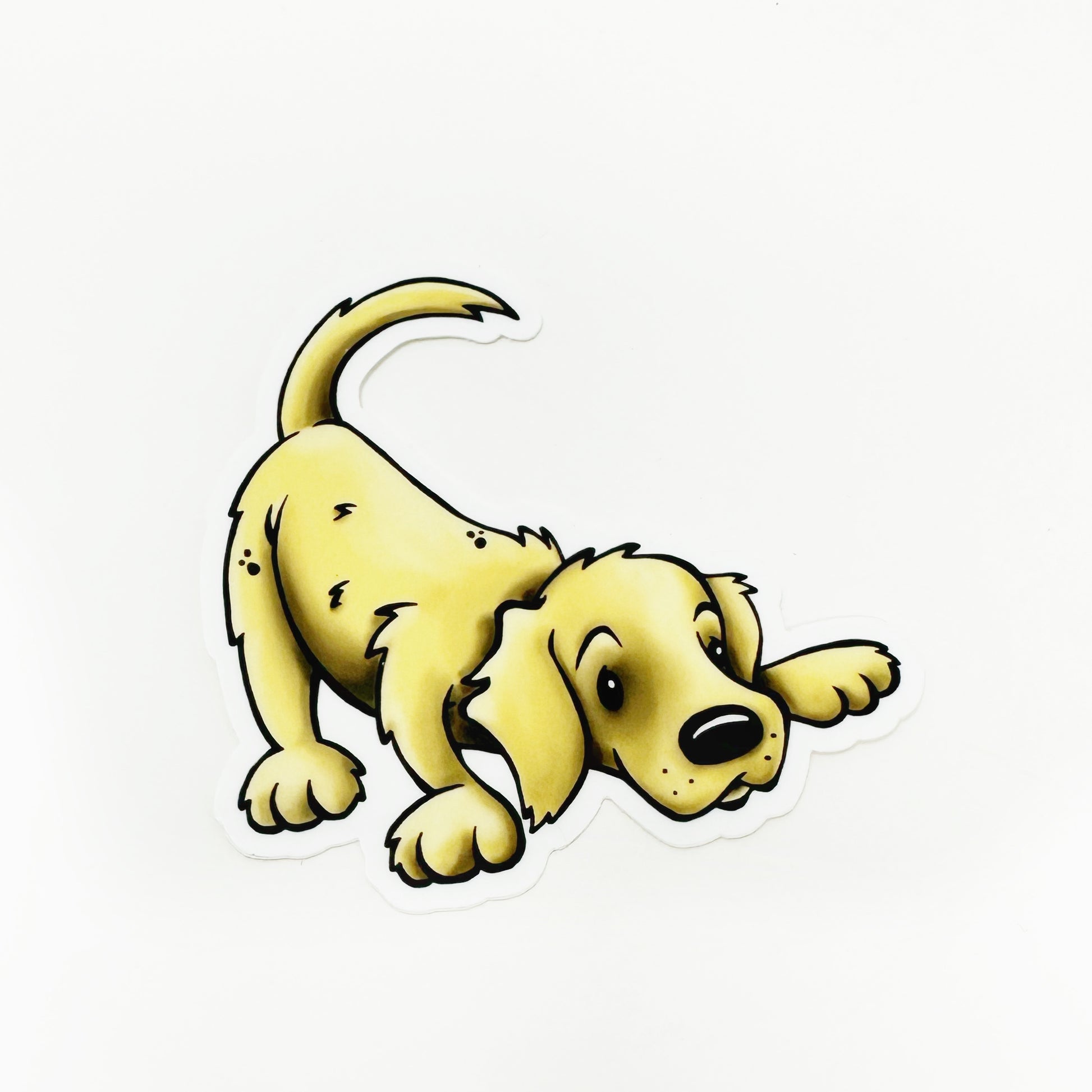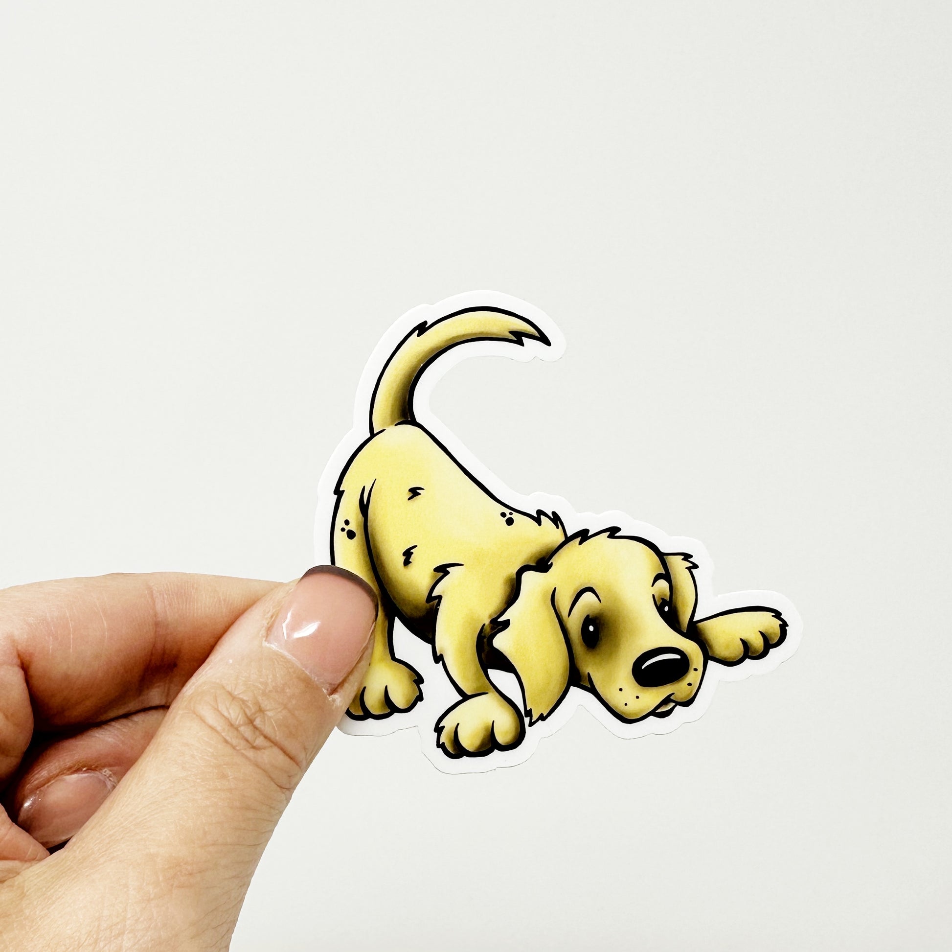 Adorable illustrated golden retriever die cut vinyl sticker.
