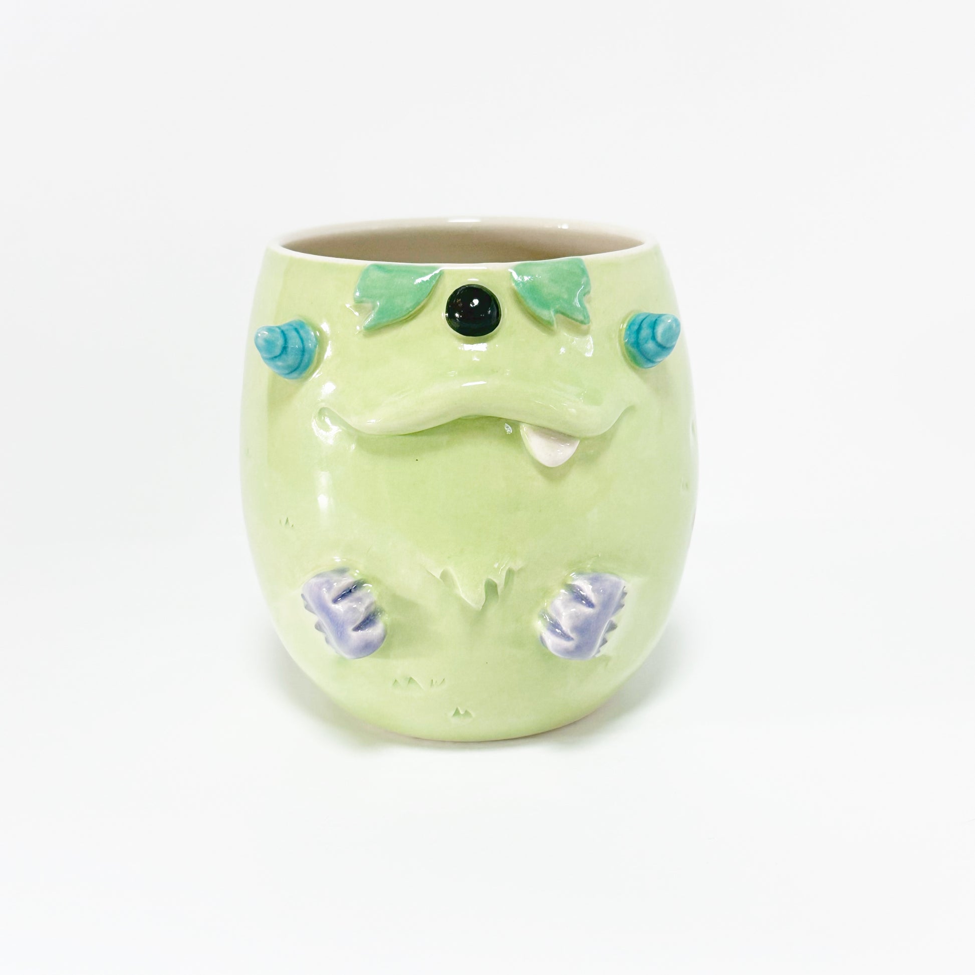 This mug is lovingly created on the wheel and then the features are built on by hand. Since all of our creations are built one at a time, no two are exactly the same. Our products are also hand painted adding to the unique design on every creation. You may be able to see our hands at work in the brush strokes of the glaze. You may also notice some texture in spots. This is part of our handmade quality and the uniqueness to every piece.