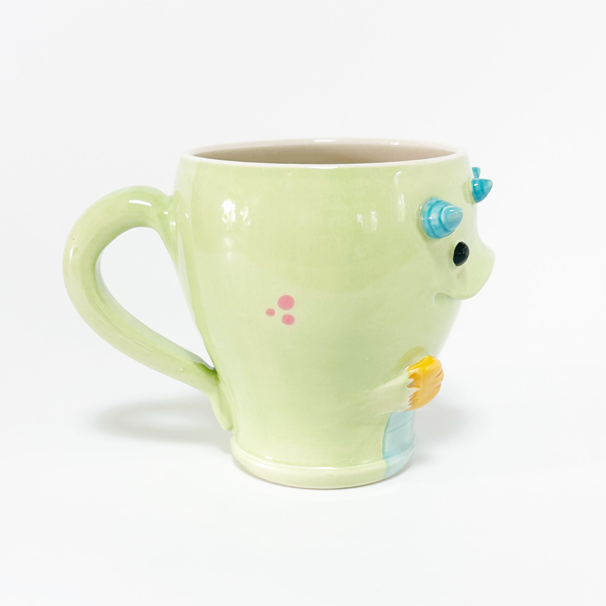 This mug is lovingly created on the wheel and then the features are built on by hand. Since all of our creations are built one at a time, no two are exactly the same. Our products are also hand painted adding to the unique design on every creation. You may be able to see our hands at work in the brush strokes of the glaze. You may also notice some texture in spots. This is part of our handmade quality and the uniqueness to every piece.