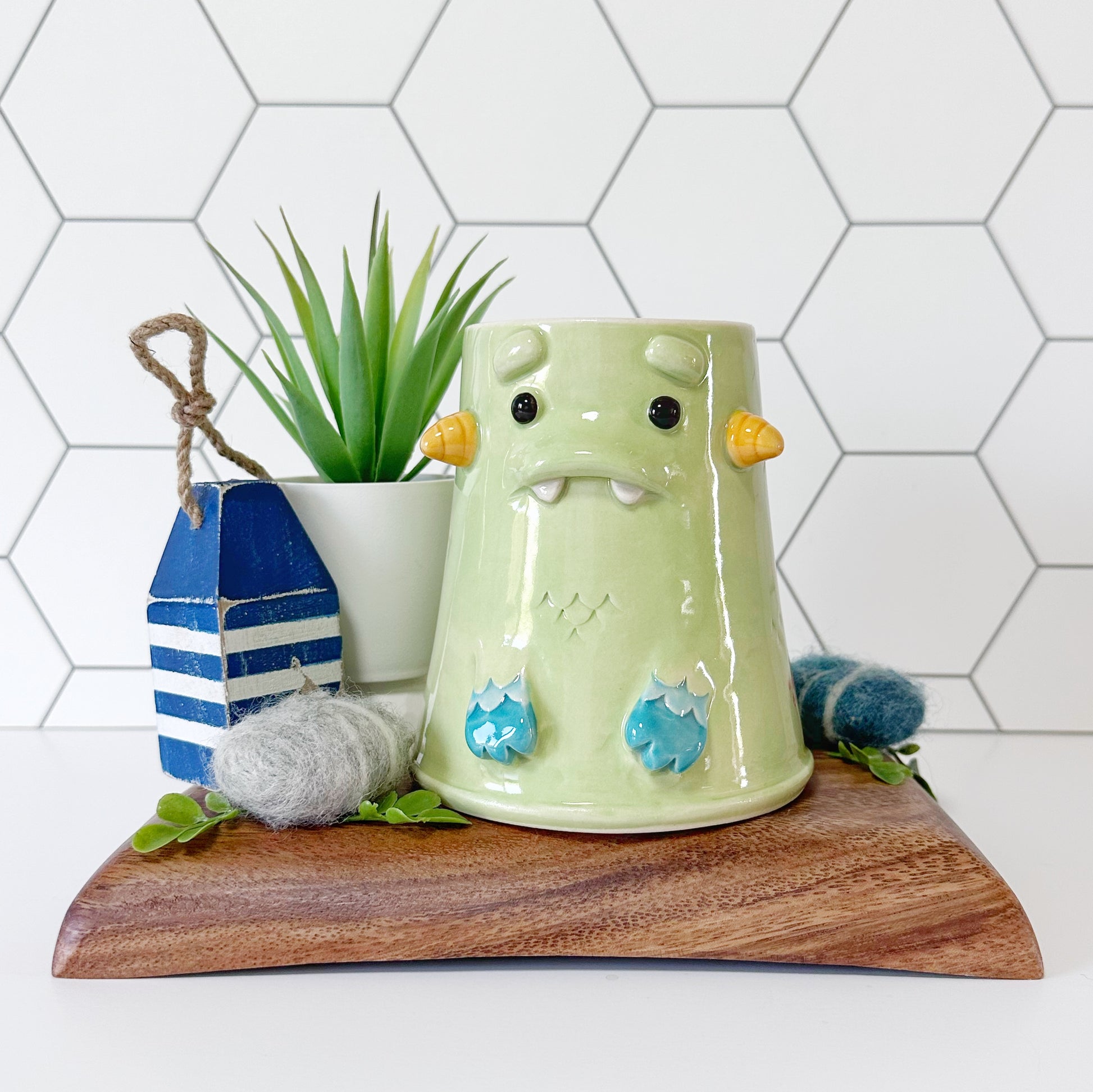 This mug is lovingly created on the wheel and then the features are built on by hand. Since all of our creations are built one at a time, no two are exactly the same. Our products are also hand painted adding to the unique design on every creation. You may be able to see our hands at work in the brush strokes of the glaze. You may also notice some texture in spots. This is part of our handmade quality and the uniqueness to every piece.