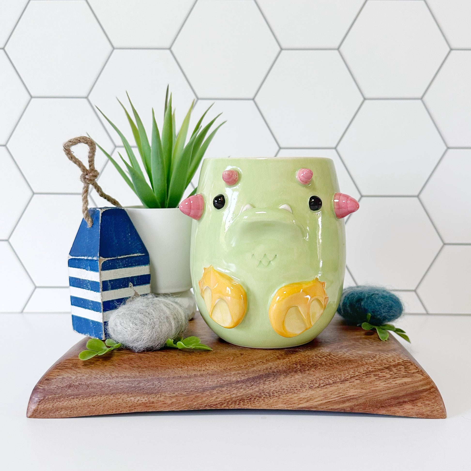 This mug is lovingly created on the wheel and then the features are built on by hand. Since all of our creations are built one at a time, no two are exactly the same. Our products are also hand painted adding to the unique design on every creation. You may be able to see our hands at work in the brush strokes of the glaze. You may also notice some texture in spots. This is part of our handmade quality and the uniqueness to every piece.