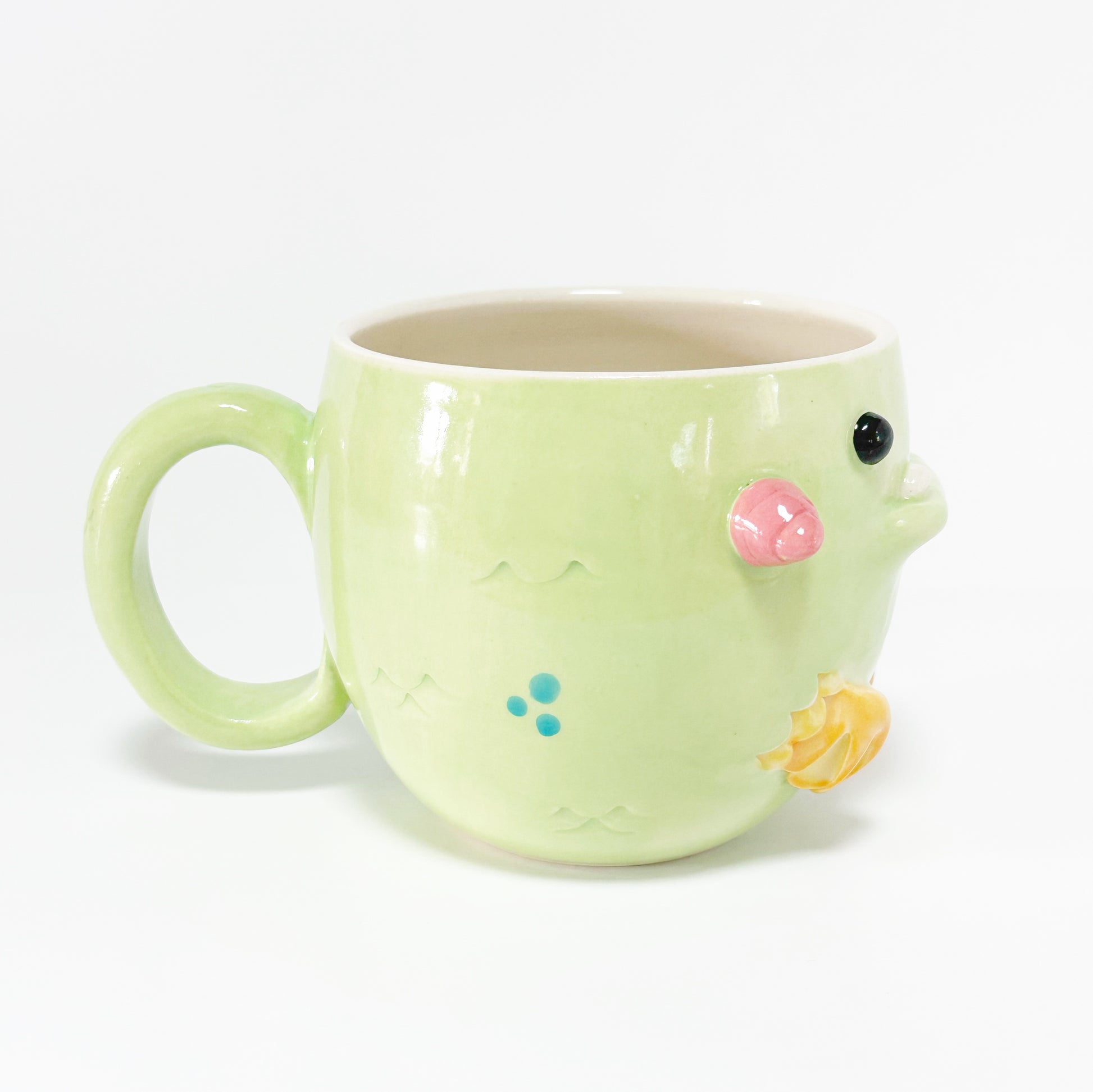 This mug is lovingly created on the wheel and then the features are built on by hand. Since all of our creations are built one at a time, no two are exactly the same. Our products are also hand painted adding to the unique design on every creation. You may be able to see our hands at work in the brush strokes of the glaze. You may also notice some texture in spots. This is part of our handmade quality and the uniqueness to every piece.