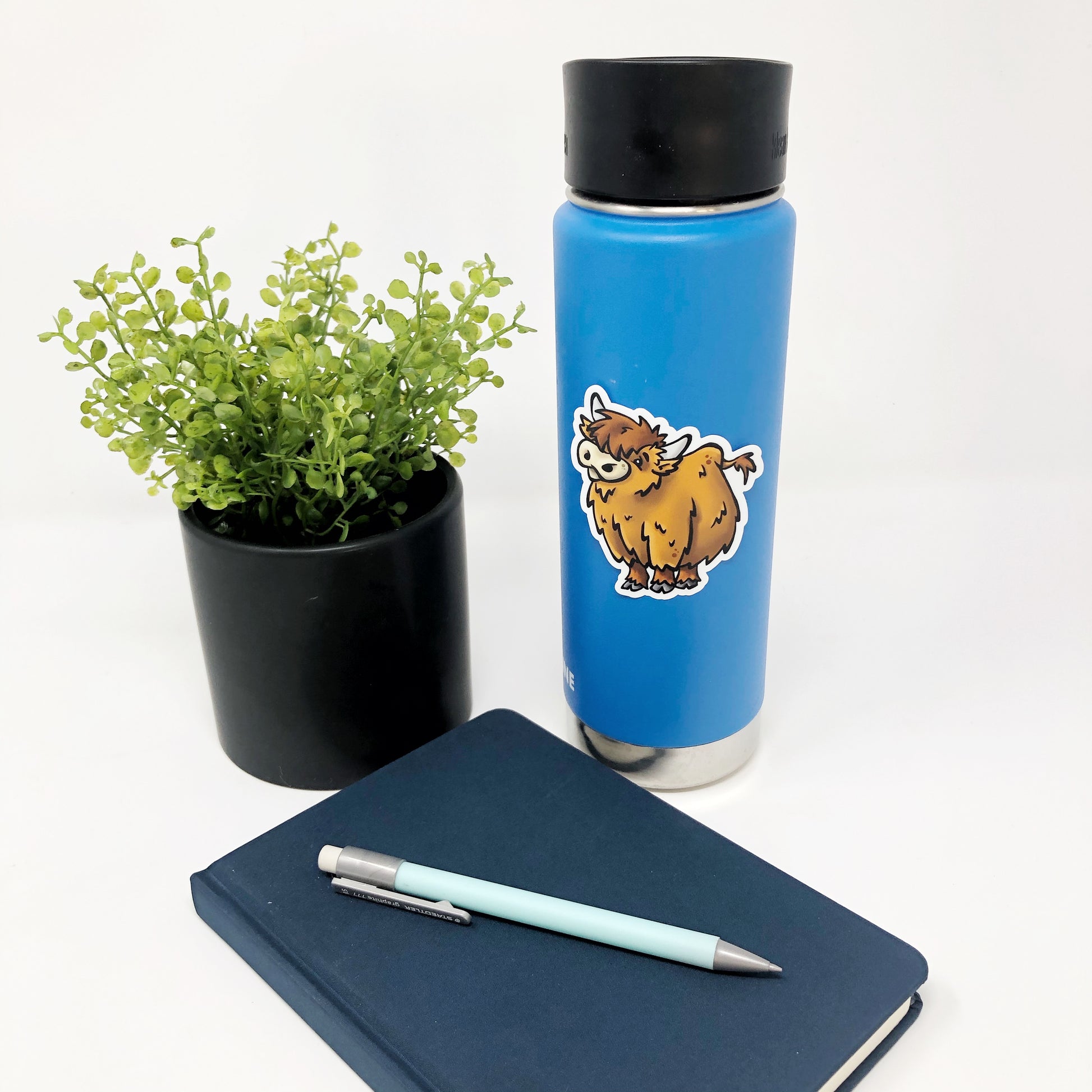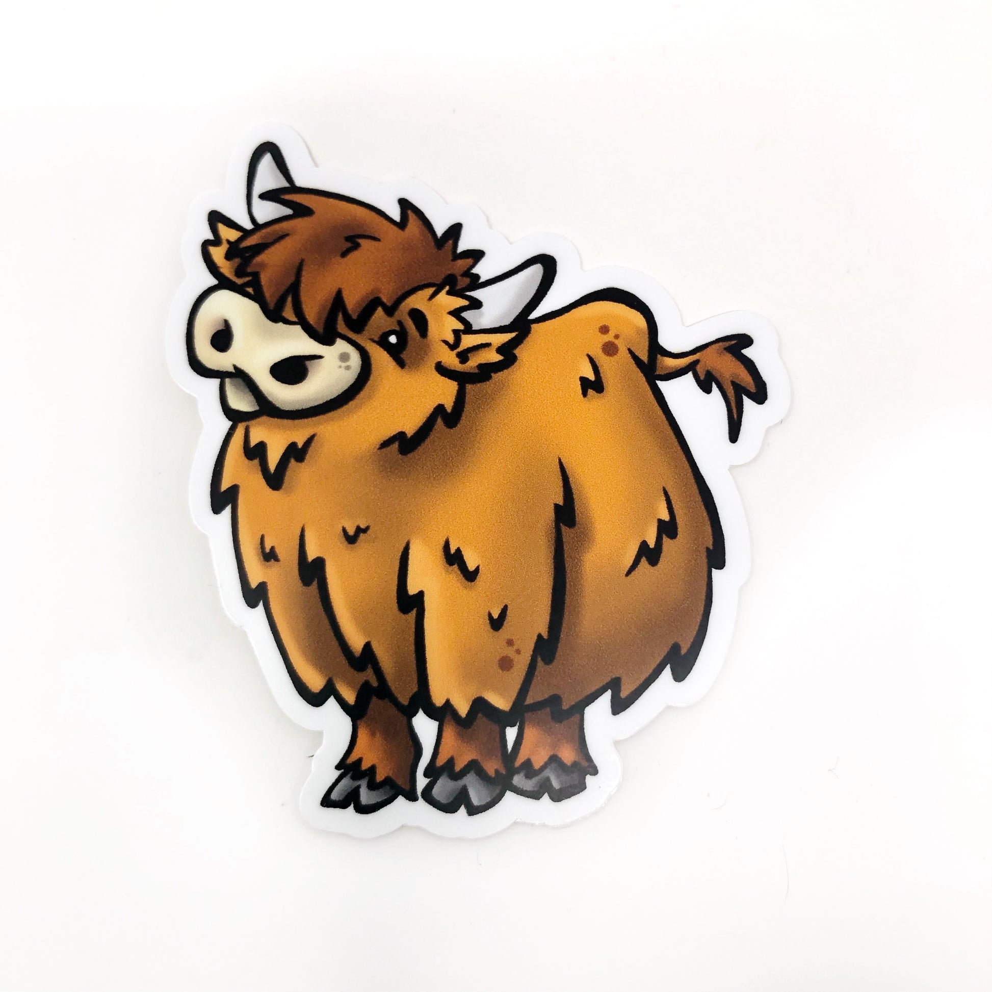 Adorable illustrated highland cow die cut vinyl sticker.