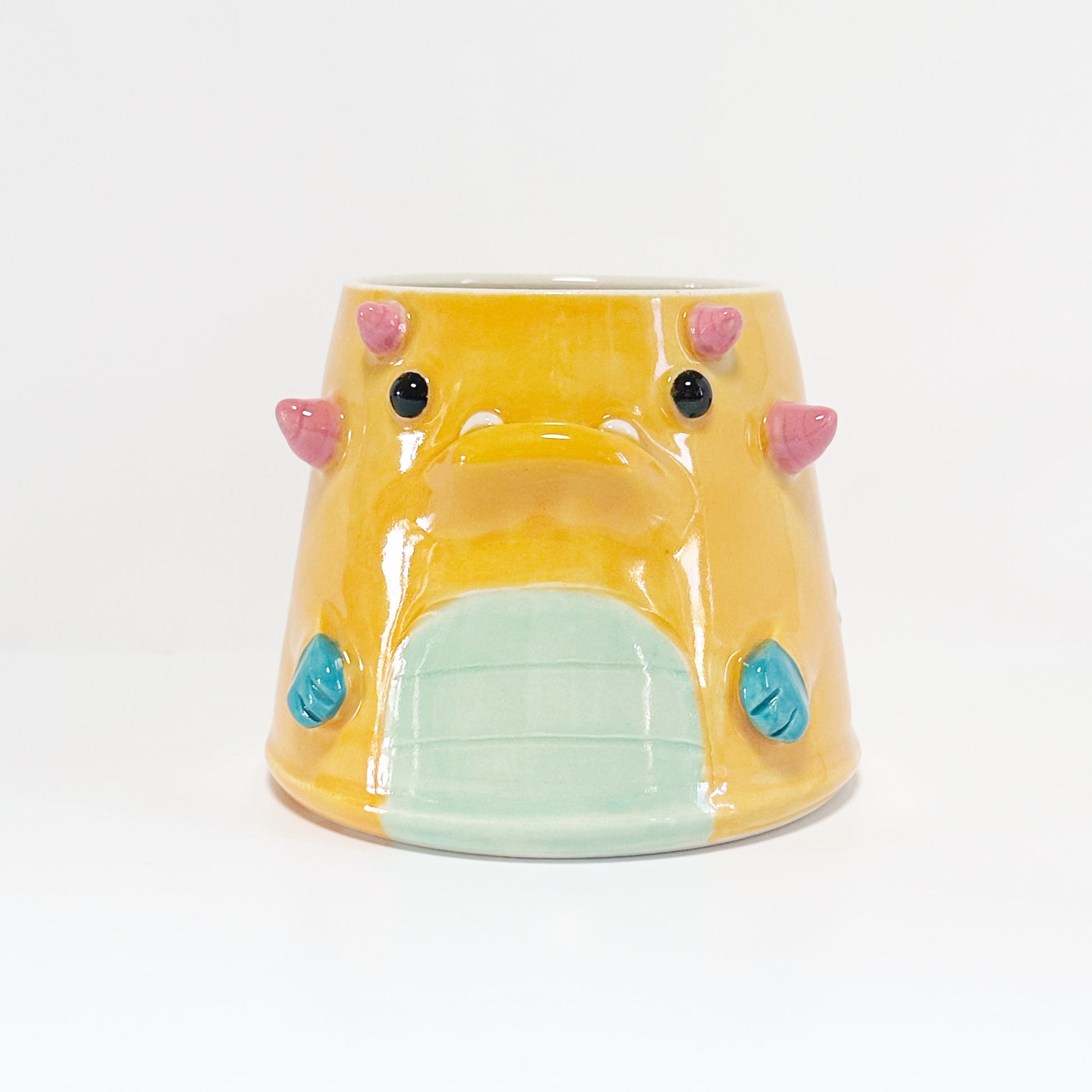 This mug is lovingly created on the wheel and then the features are built on by hand. Since all of our creations are built one at a time, no two are exactly the same. Our products are also hand painted adding to the unique design on every creation. You may be able to see our hands at work in the brush strokes of the glaze. You may also notice some texture in spots. This is part of our handmade quality and the uniqueness to every piece.