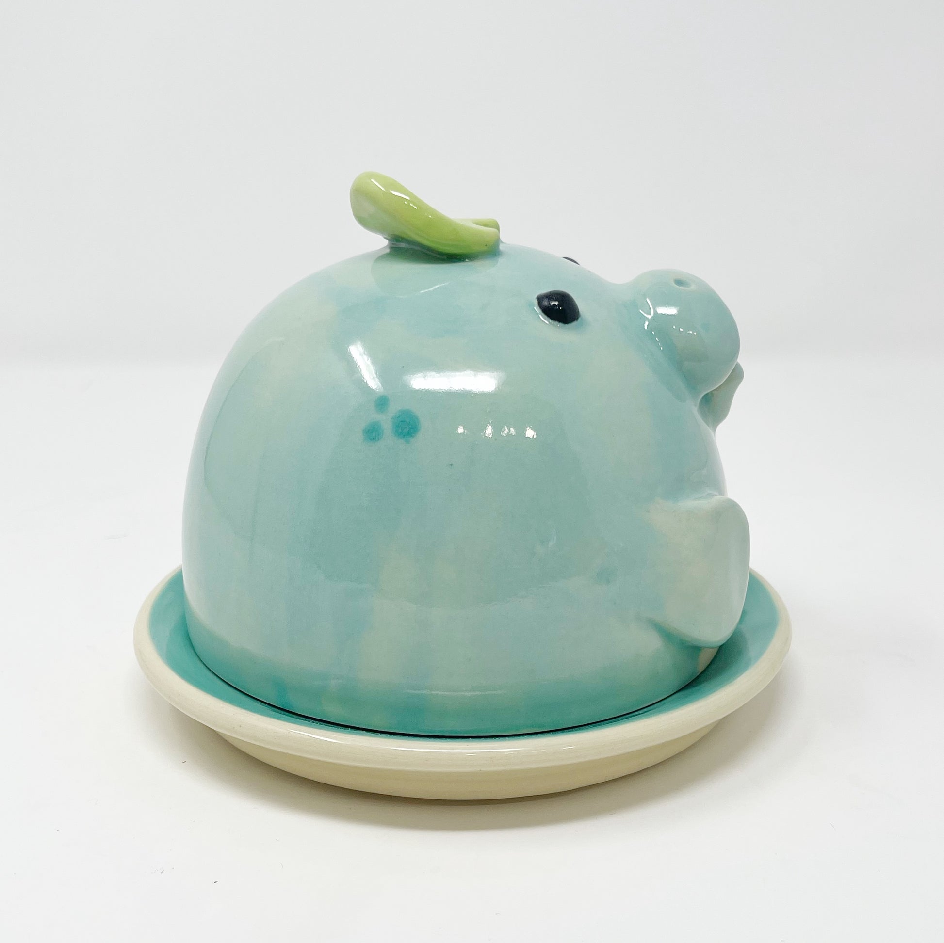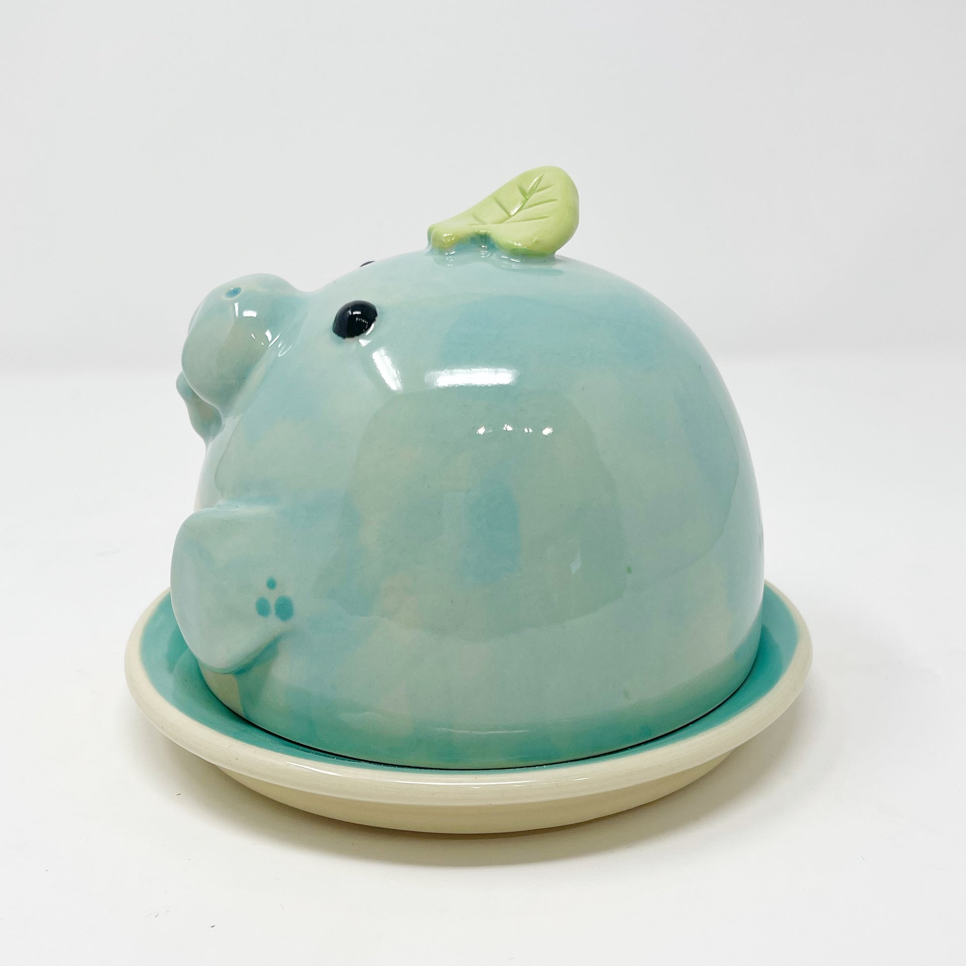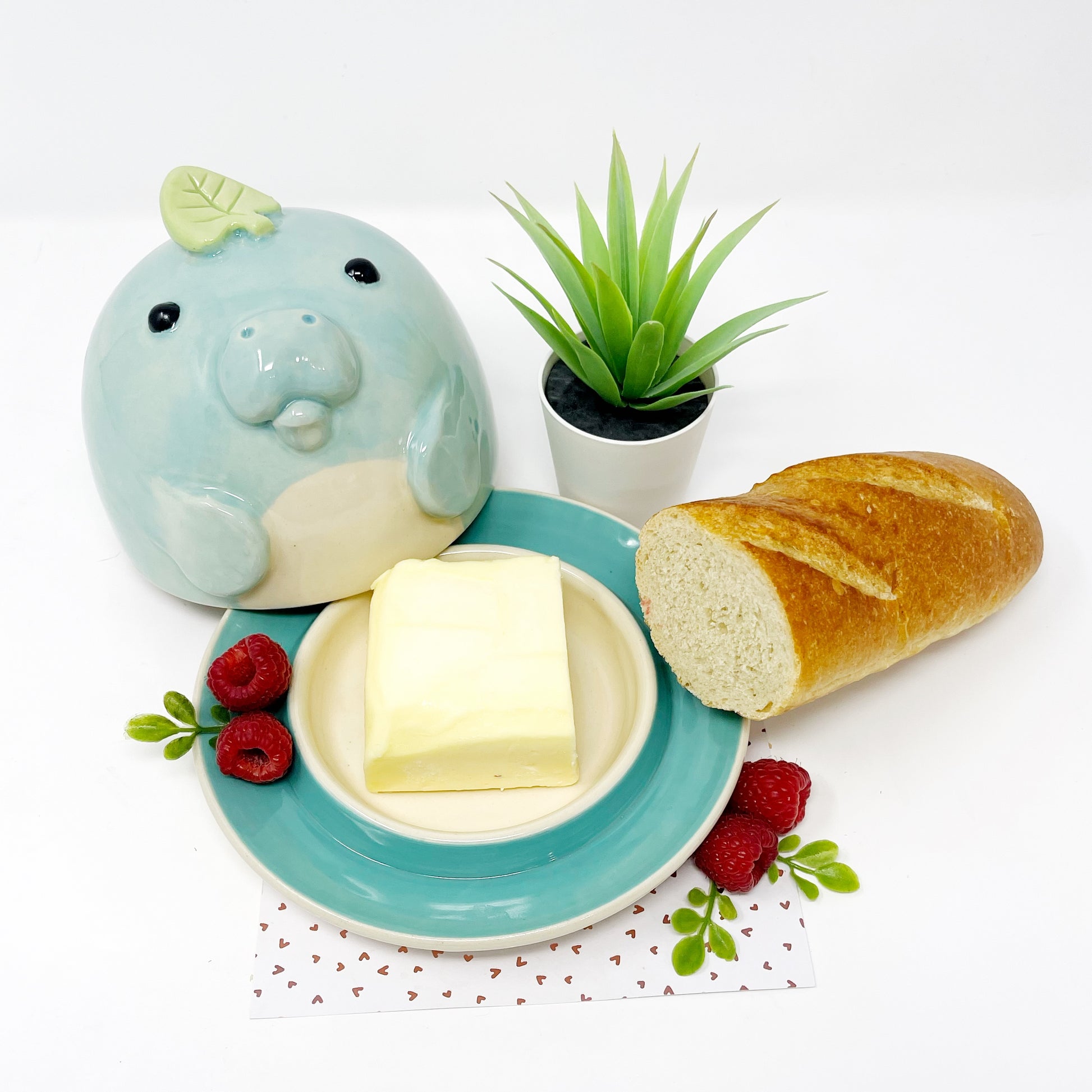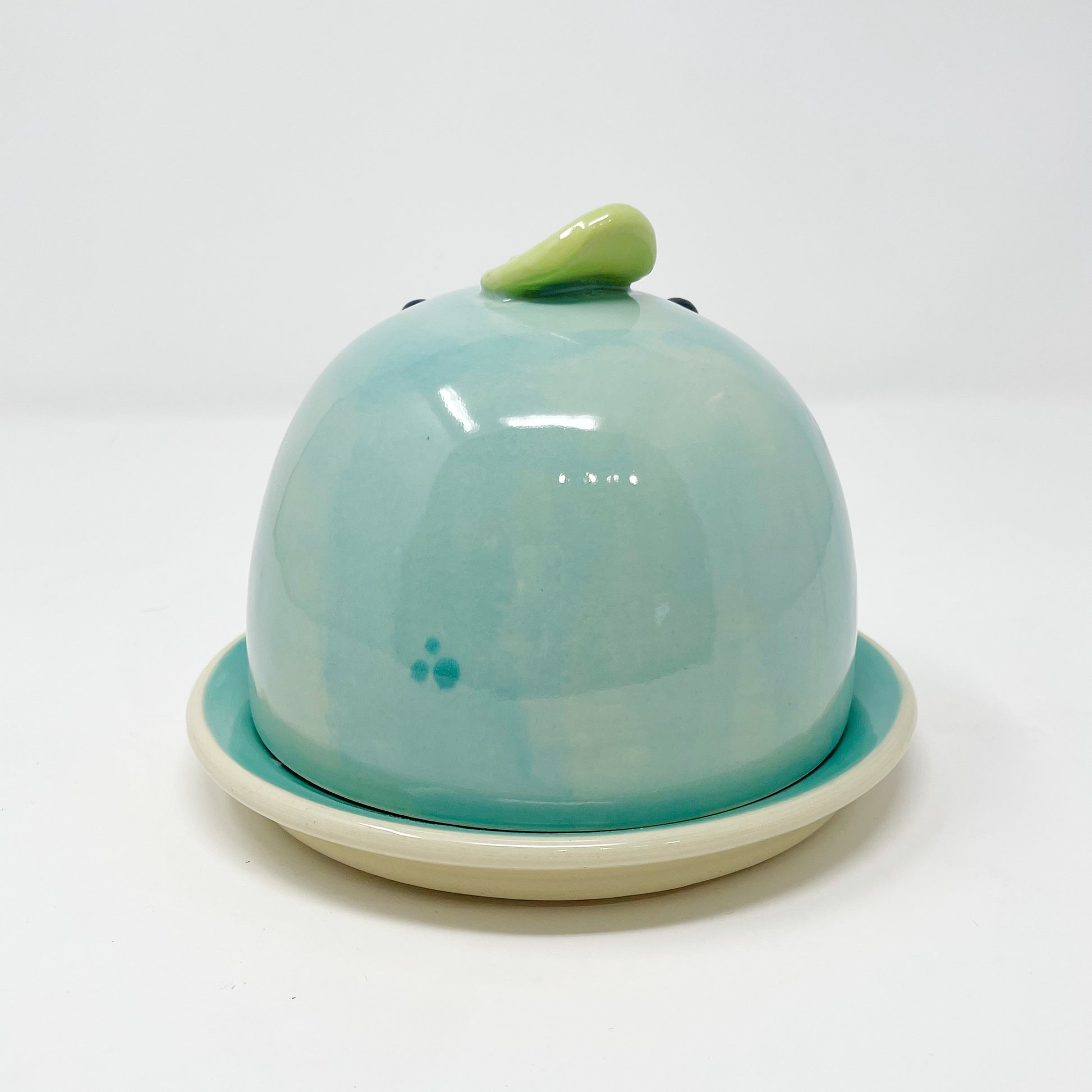 This butter dish is lovingly created on the wheel and the details are built on by hand. The plate is made with a raised lip to keep your pad of butter in place and protect against the moving lid.