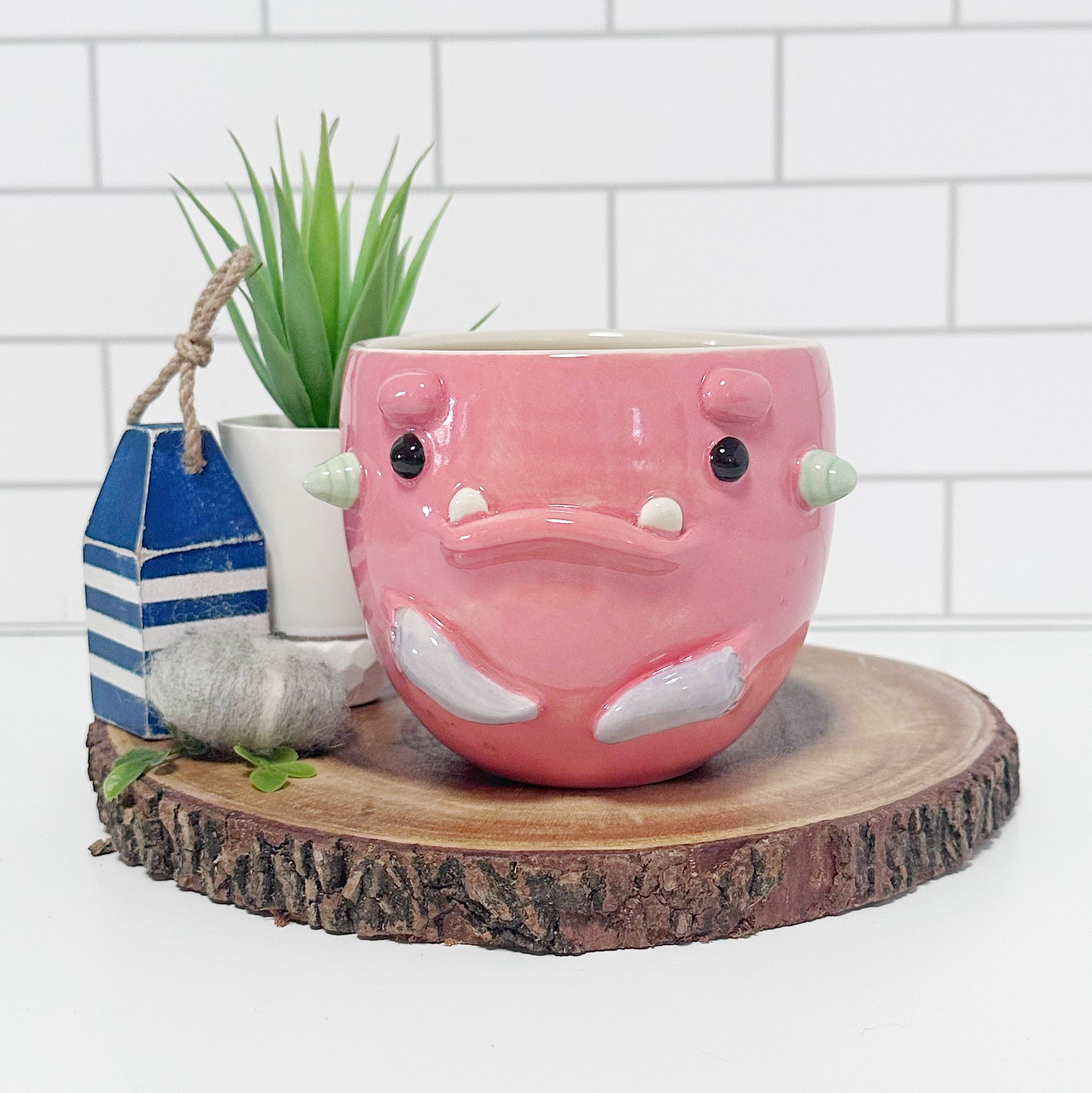 This mug is lovingly created on the wheel and then the features are built on by hand. Since all of our creations are built one at a time, no two are exactly the same. Our products are also hand painted adding to the unique design on every creation. You may be able to see our hands at work in the brush strokes of the glaze. You may also notice some texture in spots. This is part of our handmade quality and the uniqueness to every piece.