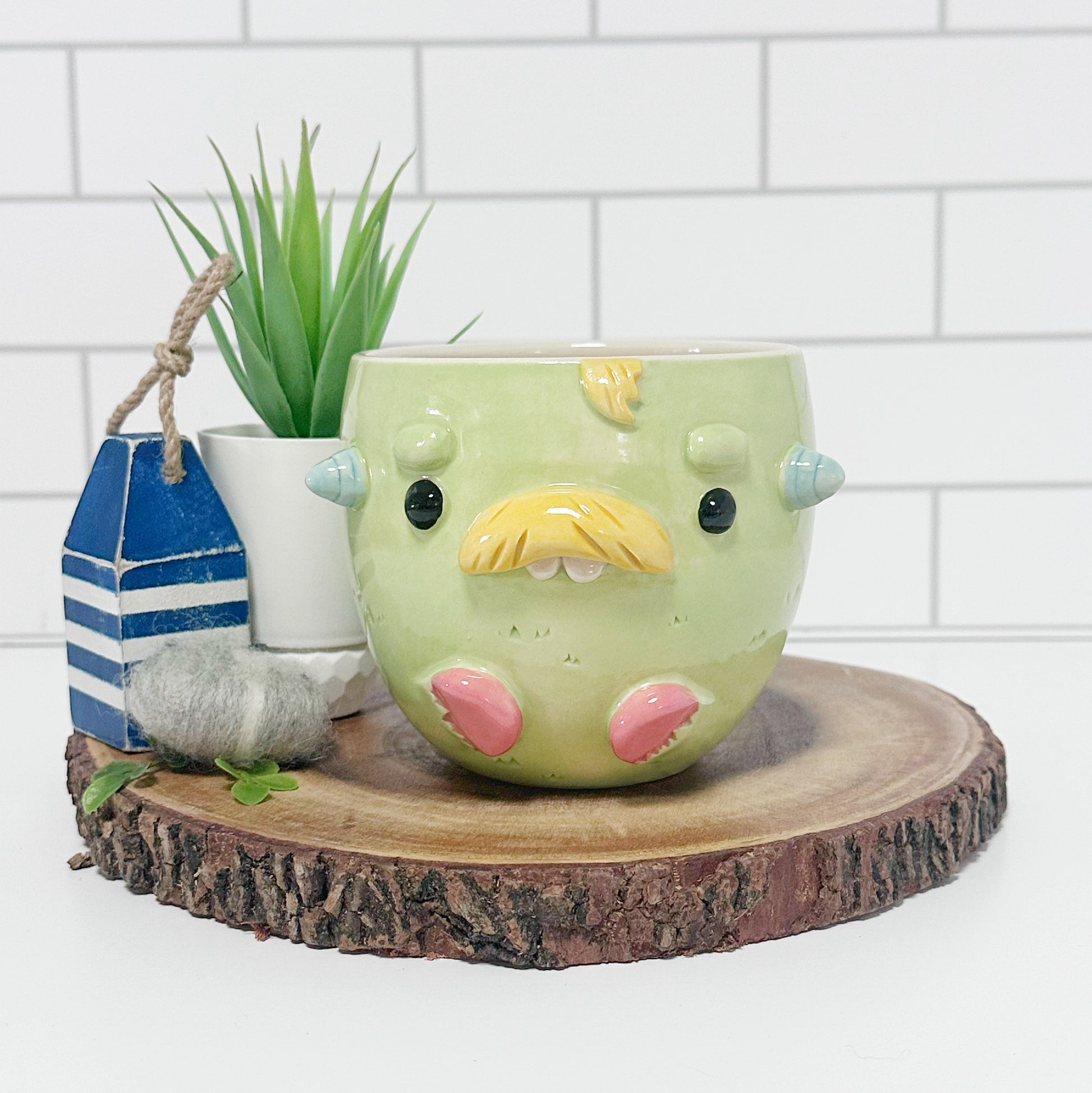 This mug is lovingly created on the wheel and then the features are built on by hand. Since all of our creations are built one at a time, no two are exactly the same. Our products are also hand painted adding to the unique design on every creation. You may be able to see our hands at work in the brush strokes of the glaze. You may also notice some texture in spots. This is part of our handmade quality and the uniqueness to every piece.
