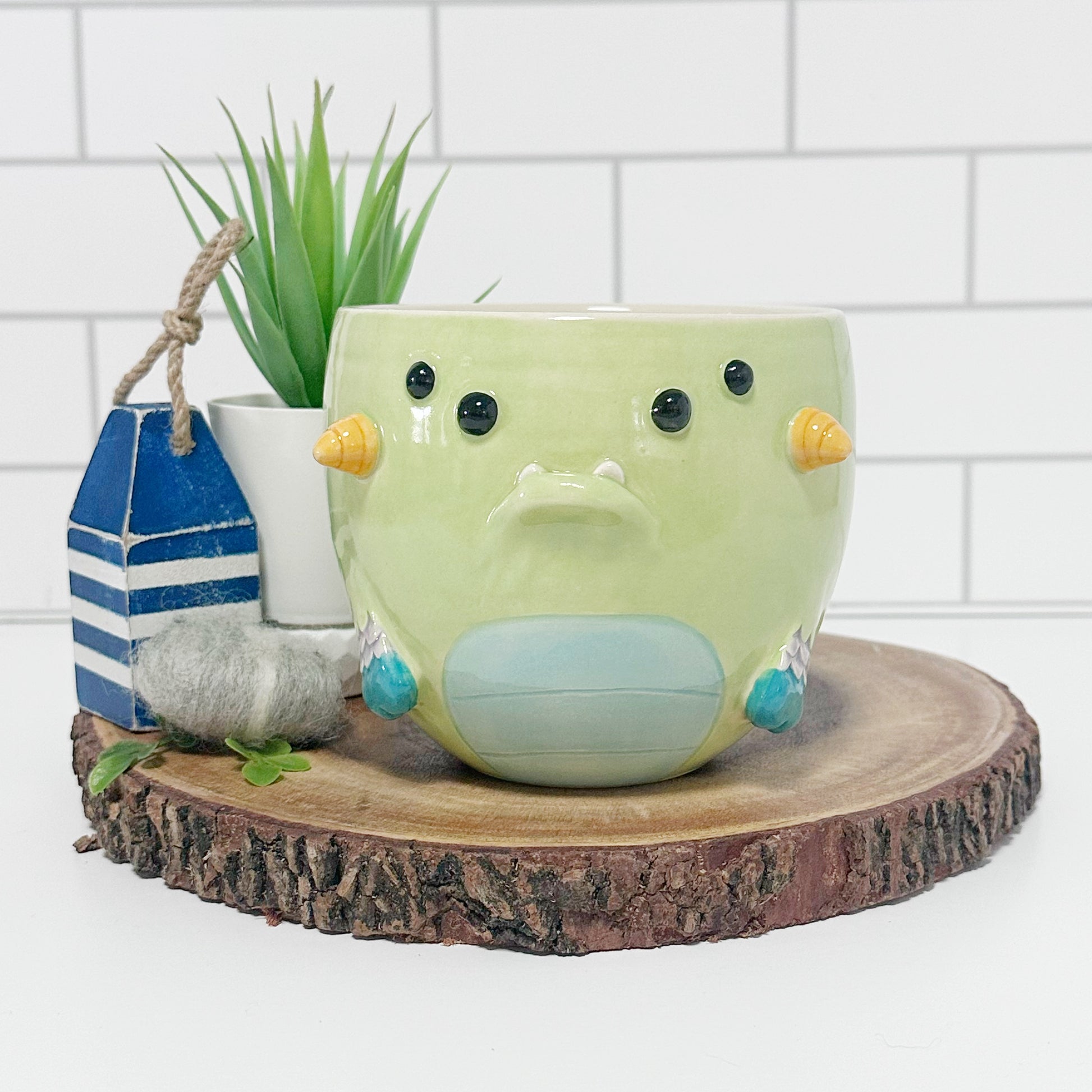 This mug is lovingly created on the wheel and then the features are built on by hand. Since all of our creations are built one at a time, no two are exactly the same. Our products are also hand painted adding to the unique design on every creation. You may be able to see our hands at work in the brush strokes of the glaze. You may also notice some texture in spots. This is part of our handmade quality and the uniqueness to every piece.