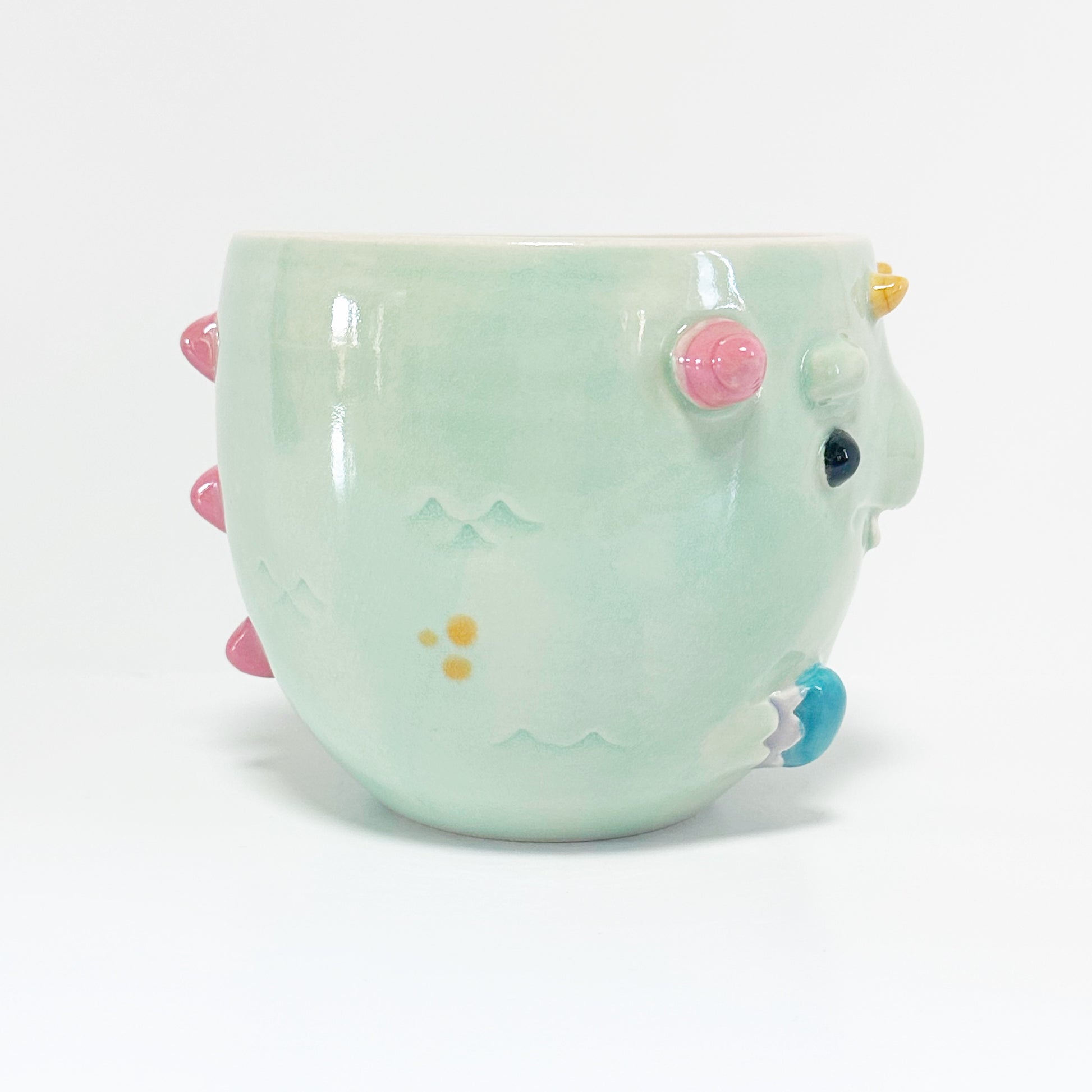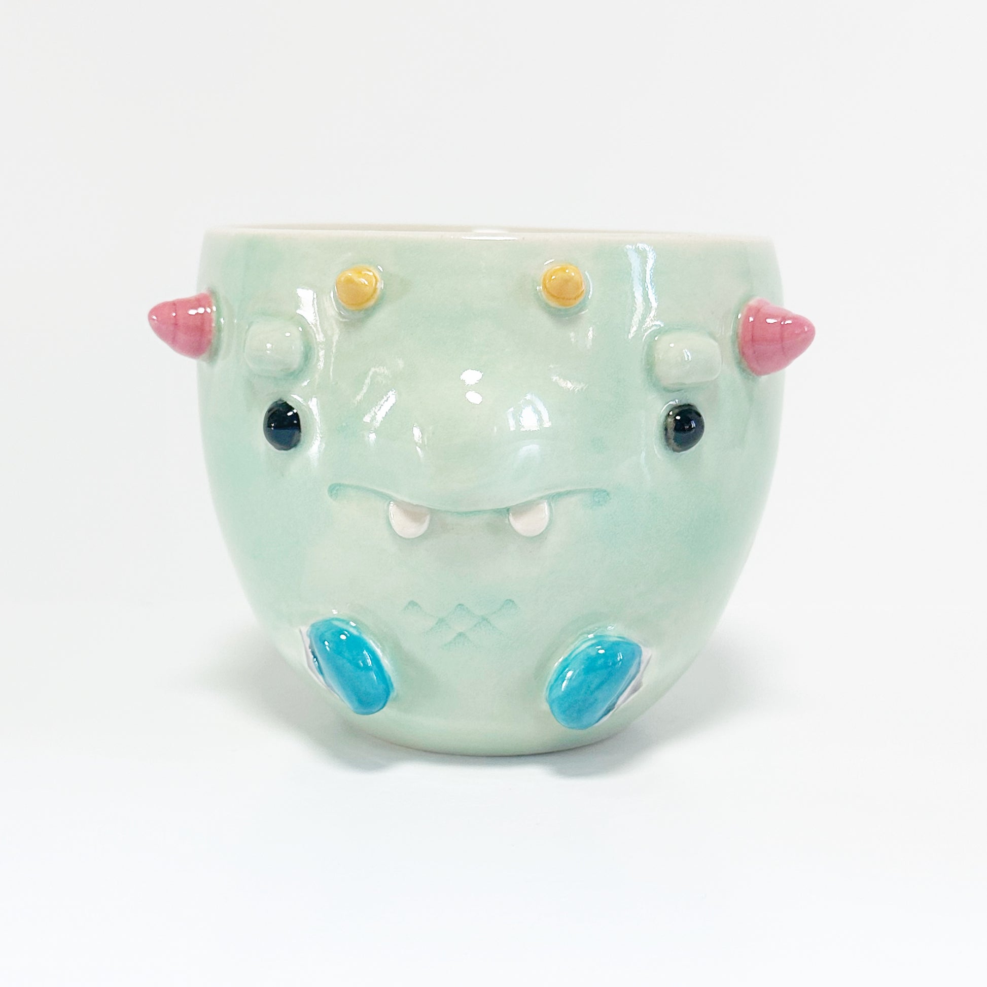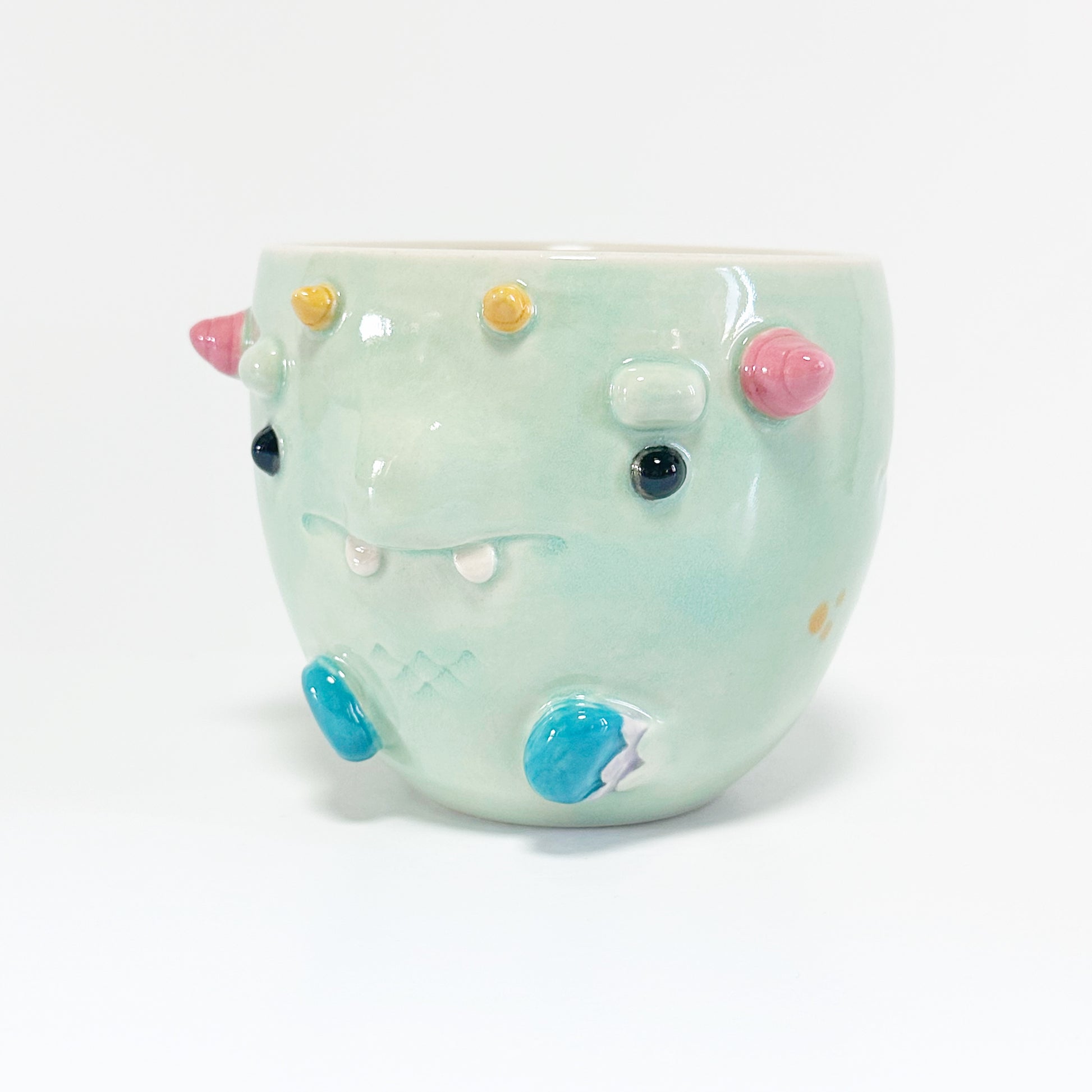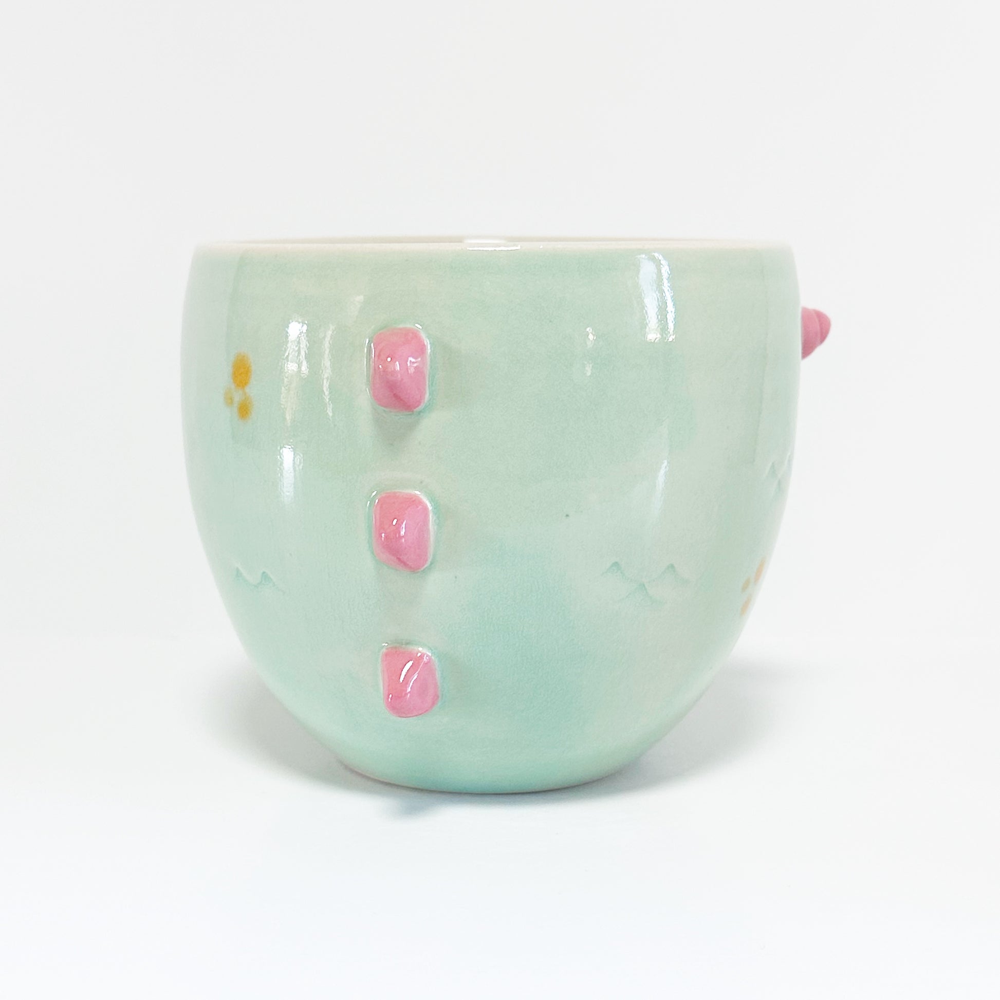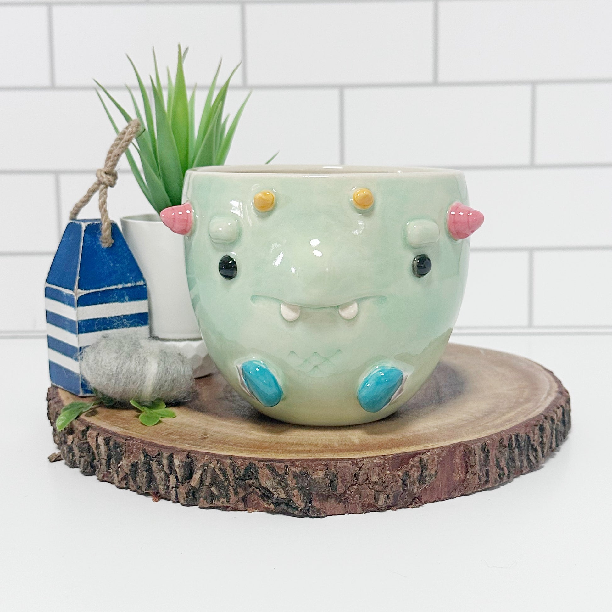 This mug is lovingly created on the wheel and then the features are built on by hand. Since all of our creations are built one at a time, no two are exactly the same. Our products are also hand painted adding to the unique design on every creation. You may be able to see our hands at work in the brush strokes of the glaze. You may also notice some texture in spots. This is part of our handmade quality and the uniqueness to every piece.