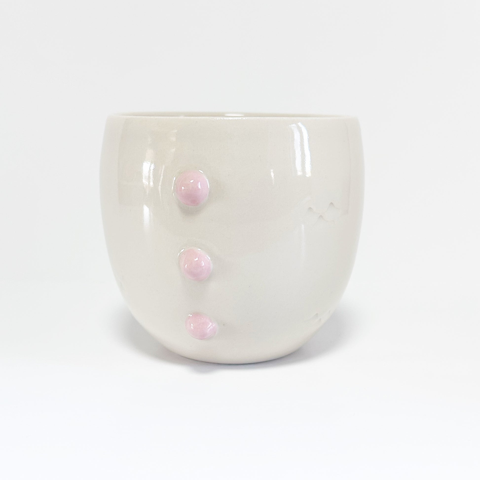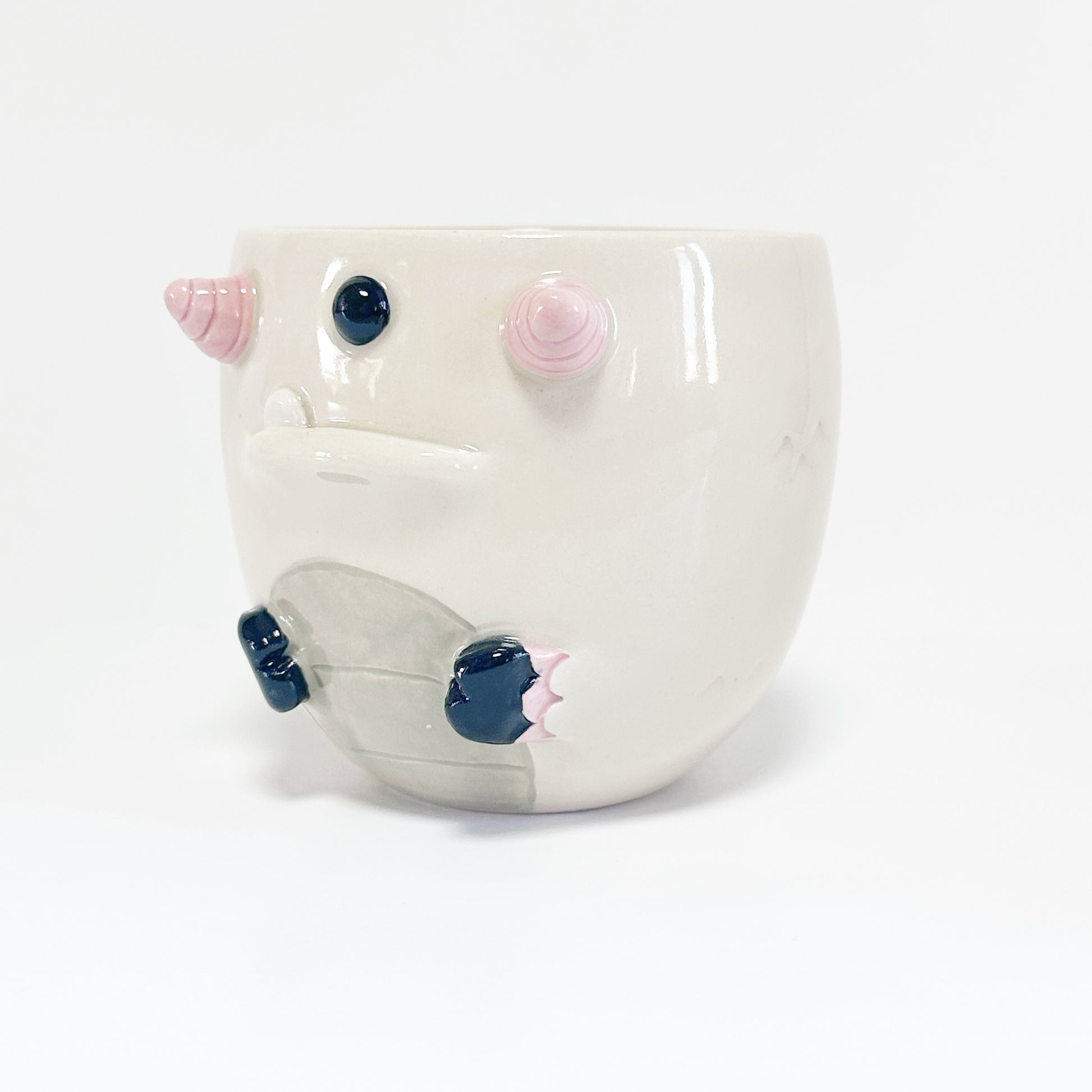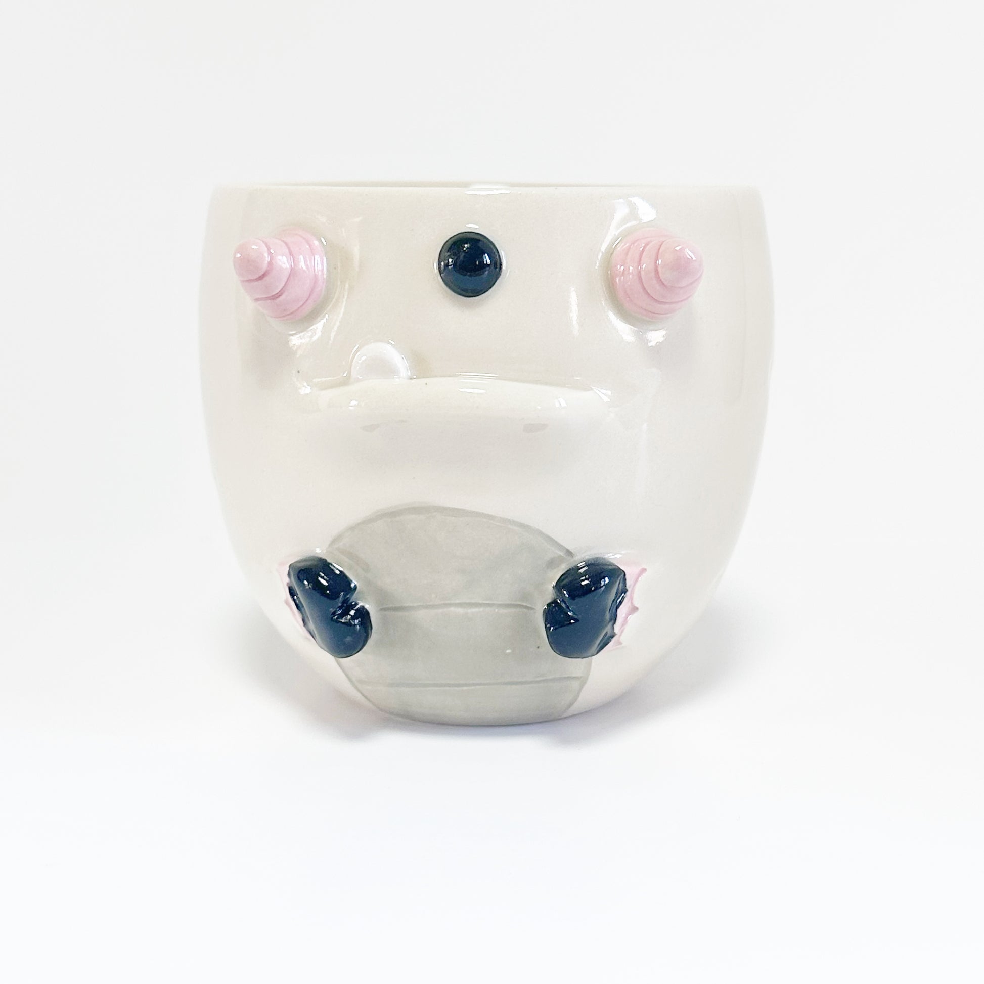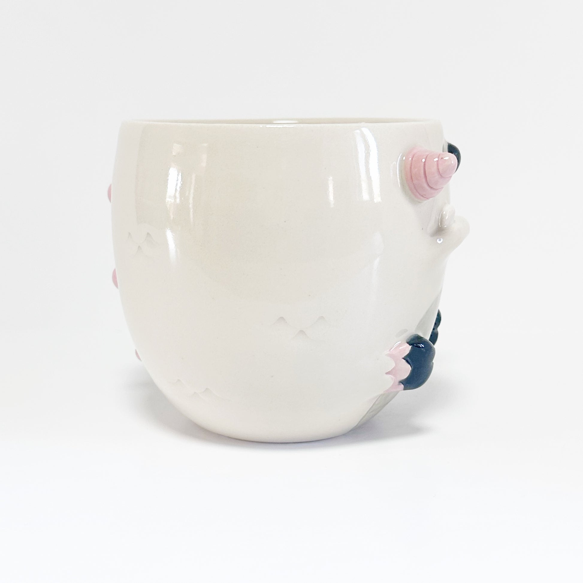 This mug is lovingly created on the wheel and then the features are built on by hand. Since all of our creations are built one at a time, no two are exactly the same. Our products are also hand painted adding to the unique design on every creation. You may be able to see our hands at work in the brush strokes of the glaze. You may also notice some texture in spots. This is part of our handmade quality and the uniqueness to every piece.