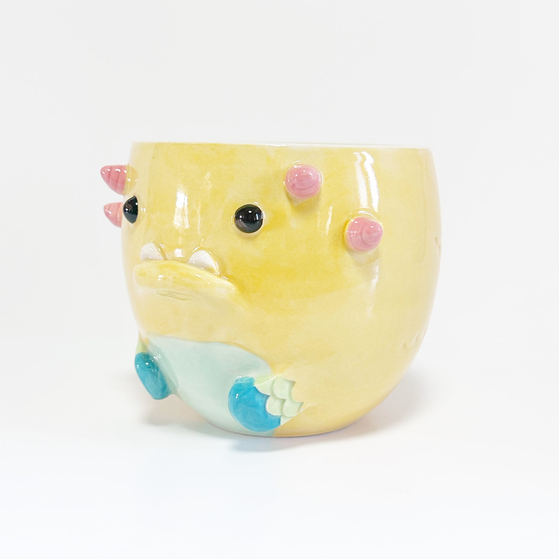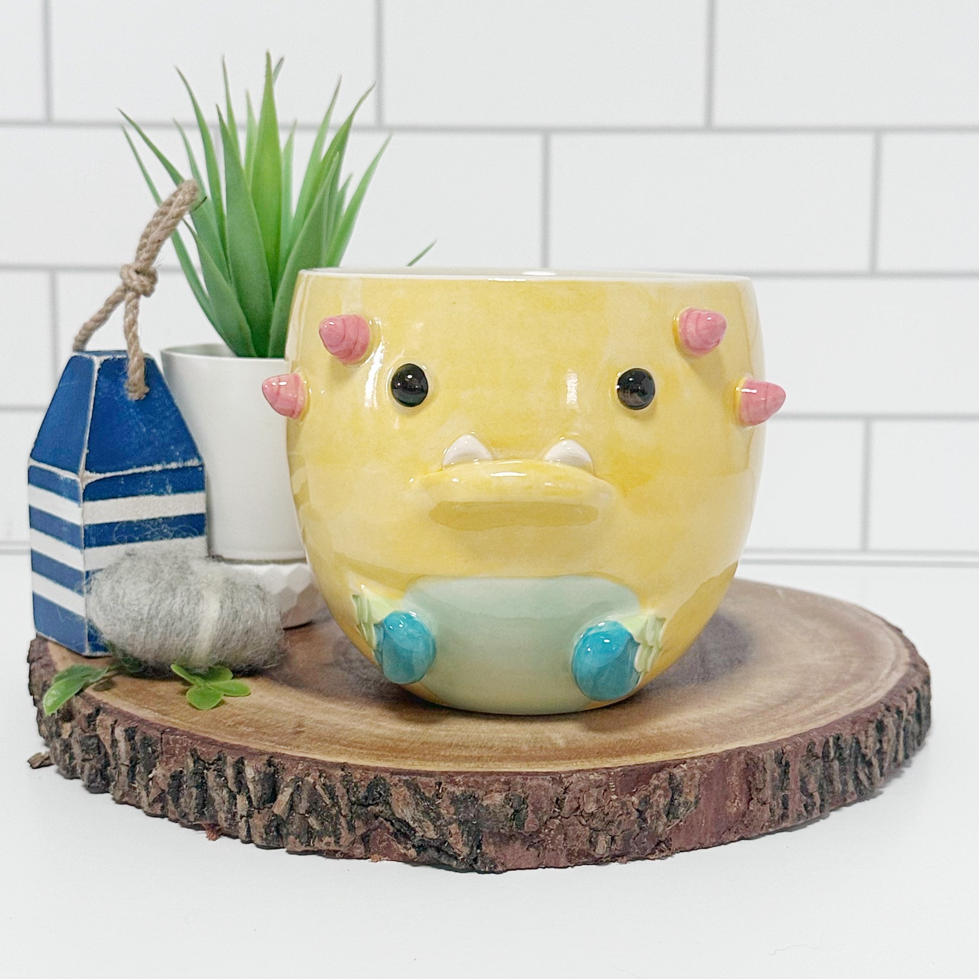 This mug is lovingly created on the wheel and then the features are built on by hand. Since all of our creations are built one at a time, no two are exactly the same. Our products are also hand painted adding to the unique design on every creation. You may be able to see our hands at work in the brush strokes of the glaze. You may also notice some texture in spots. This is part of our handmade quality and the uniqueness to every piece.