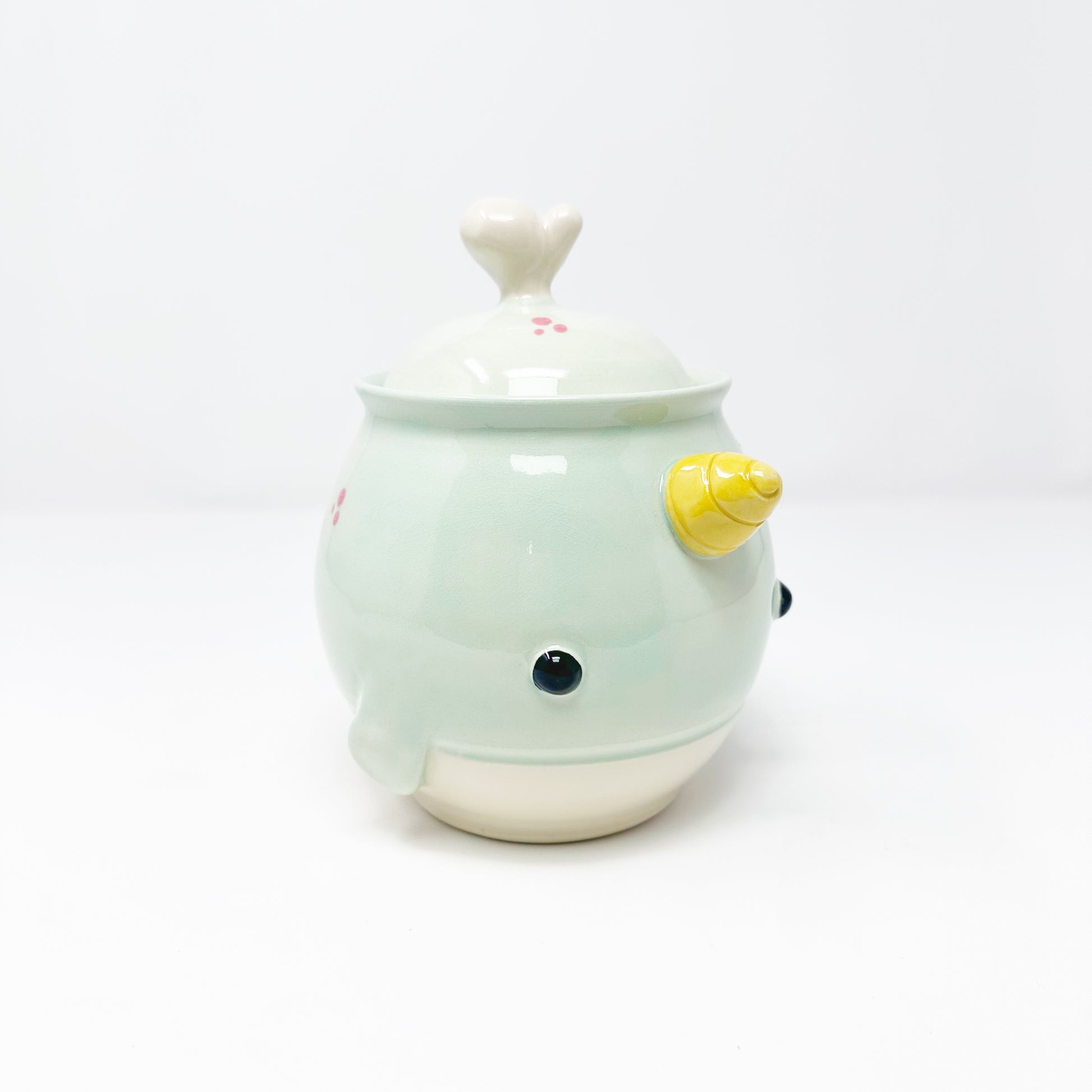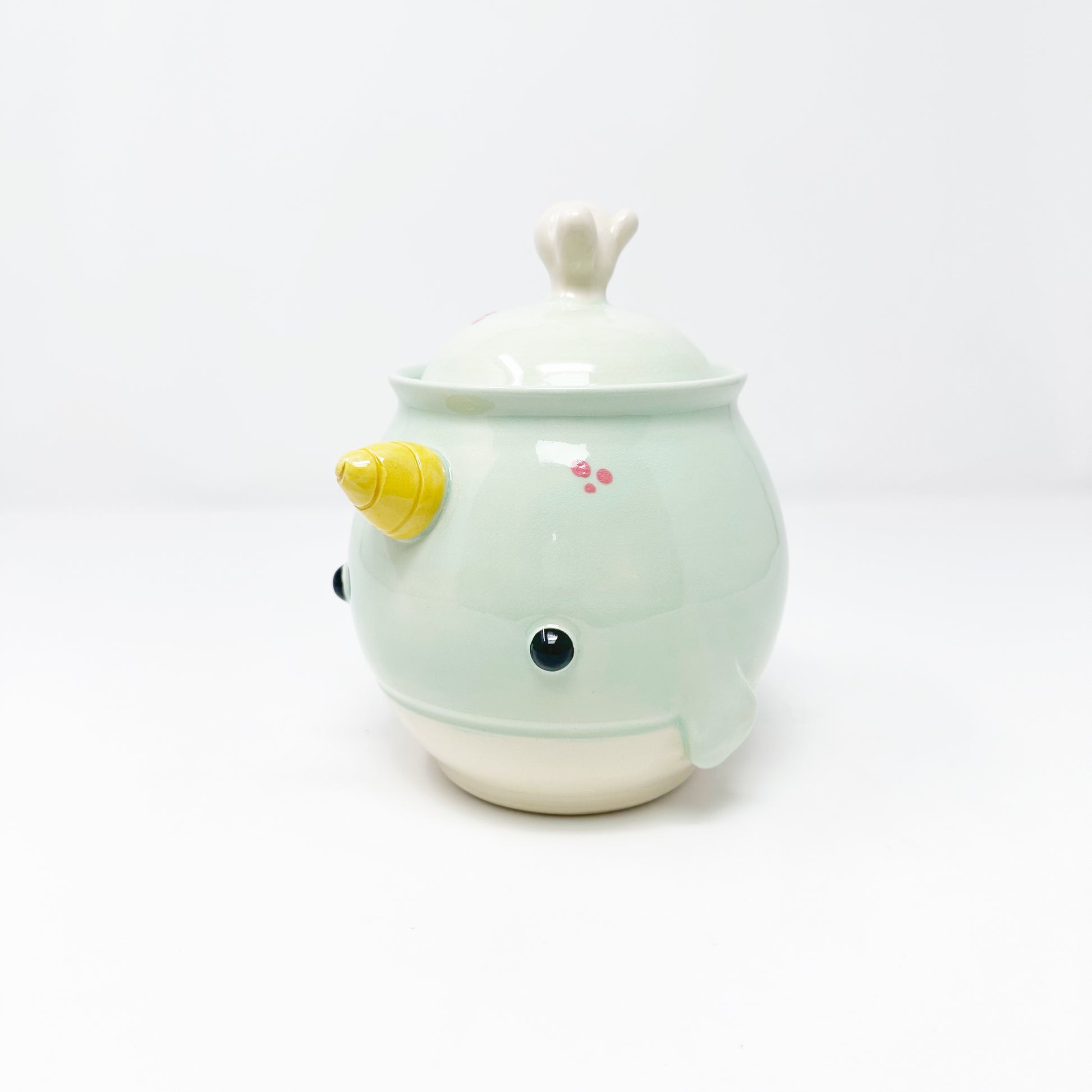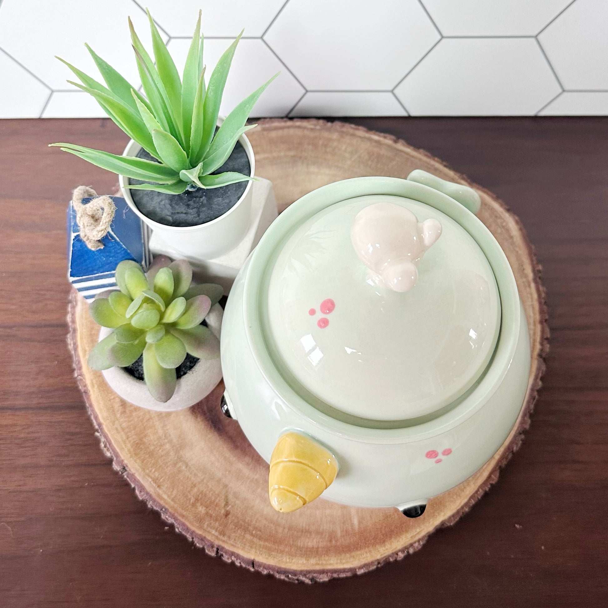 This item is lovingly created on the wheel and then the features are built on by hand. Since all of our creations are built one at a time, no two are exactly the same. Our products are also hand painted adding to the unique design on every creation. You may be able to see our hands at work in the brush strokes of the glaze. You may also notice some texture in spots. This is part of our handmade quality and the uniqueness to every piece.