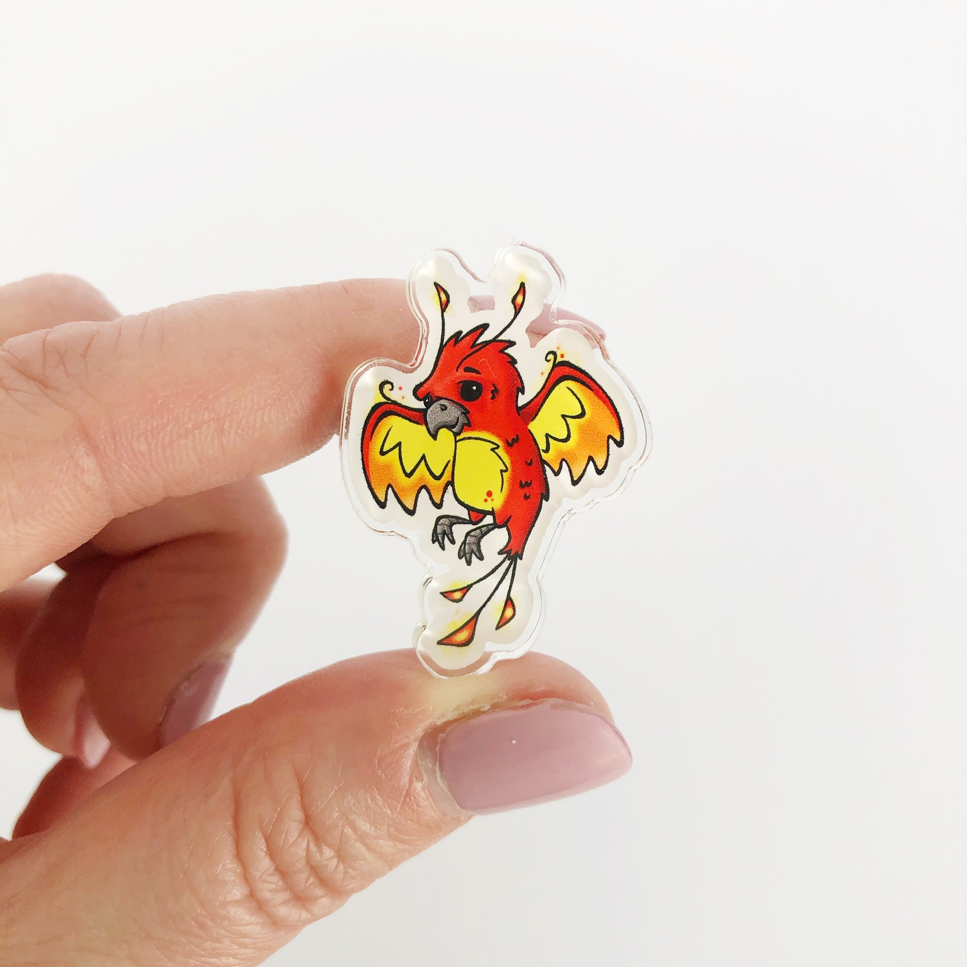 This phoenix pin will add flair to your jackets, sweaters, bags and more! Adorably illustrated and made from acrylic to show case the details that connote be replicated in enamel.