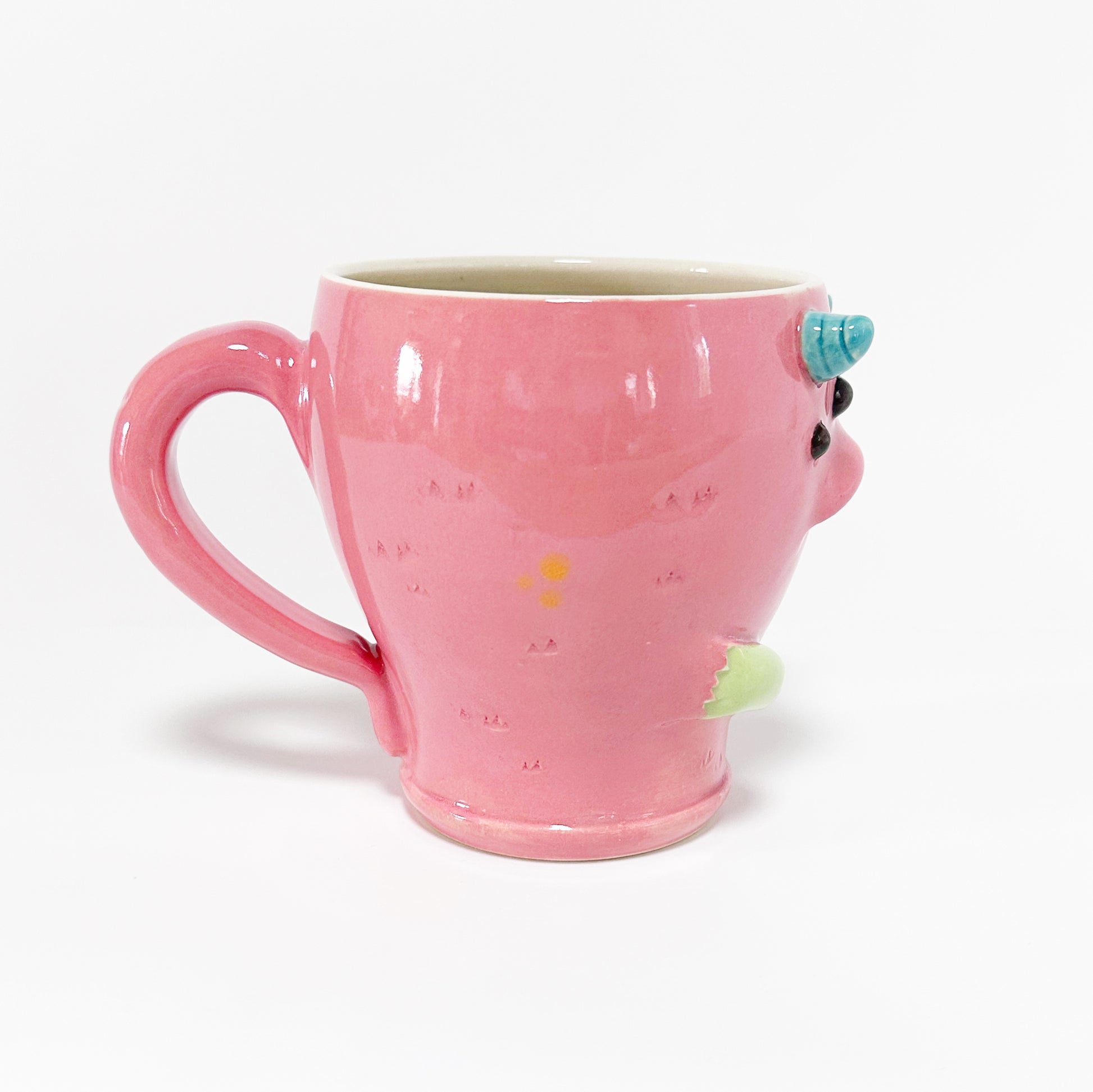 This mug is lovingly created on the wheel and then the features are built on by hand. Since all of our creations are built one at a time, no two are exactly the same. Our products are also hand painted adding to the unique design on every creation. You may be able to see our hands at work in the brush strokes of the glaze. You may also notice some texture in spots. This is part of our handmade quality and the uniqueness to every piece.