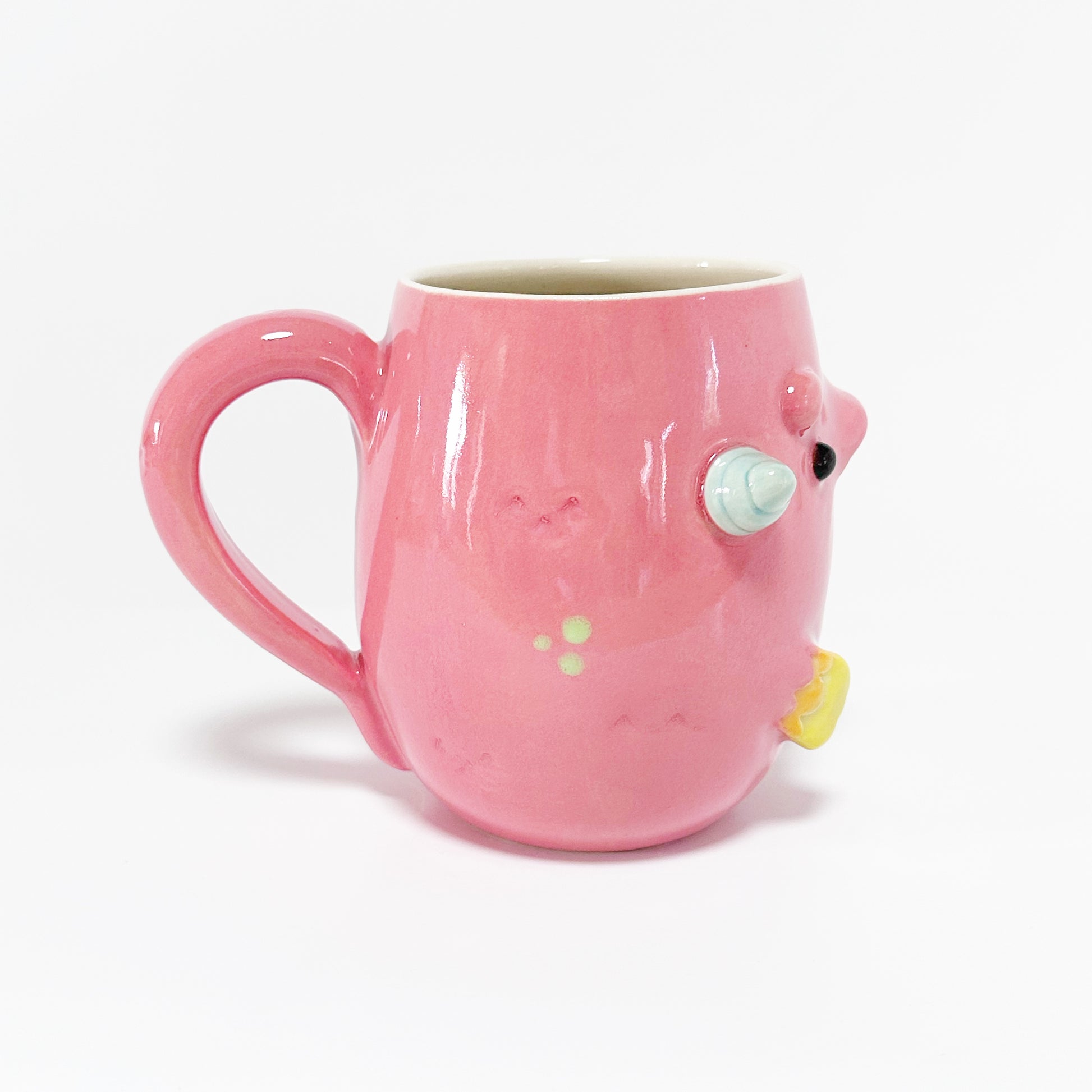 This mug is lovingly created on the wheel and then the features are built on by hand. Since all of our creations are built one at a time, no two are exactly the same. Our products are also hand painted adding to the unique design on every creation. You may be able to see our hands at work in the brush strokes of the glaze. You may also notice some texture in spots. This is part of our handmade quality and the uniqueness to every piece.