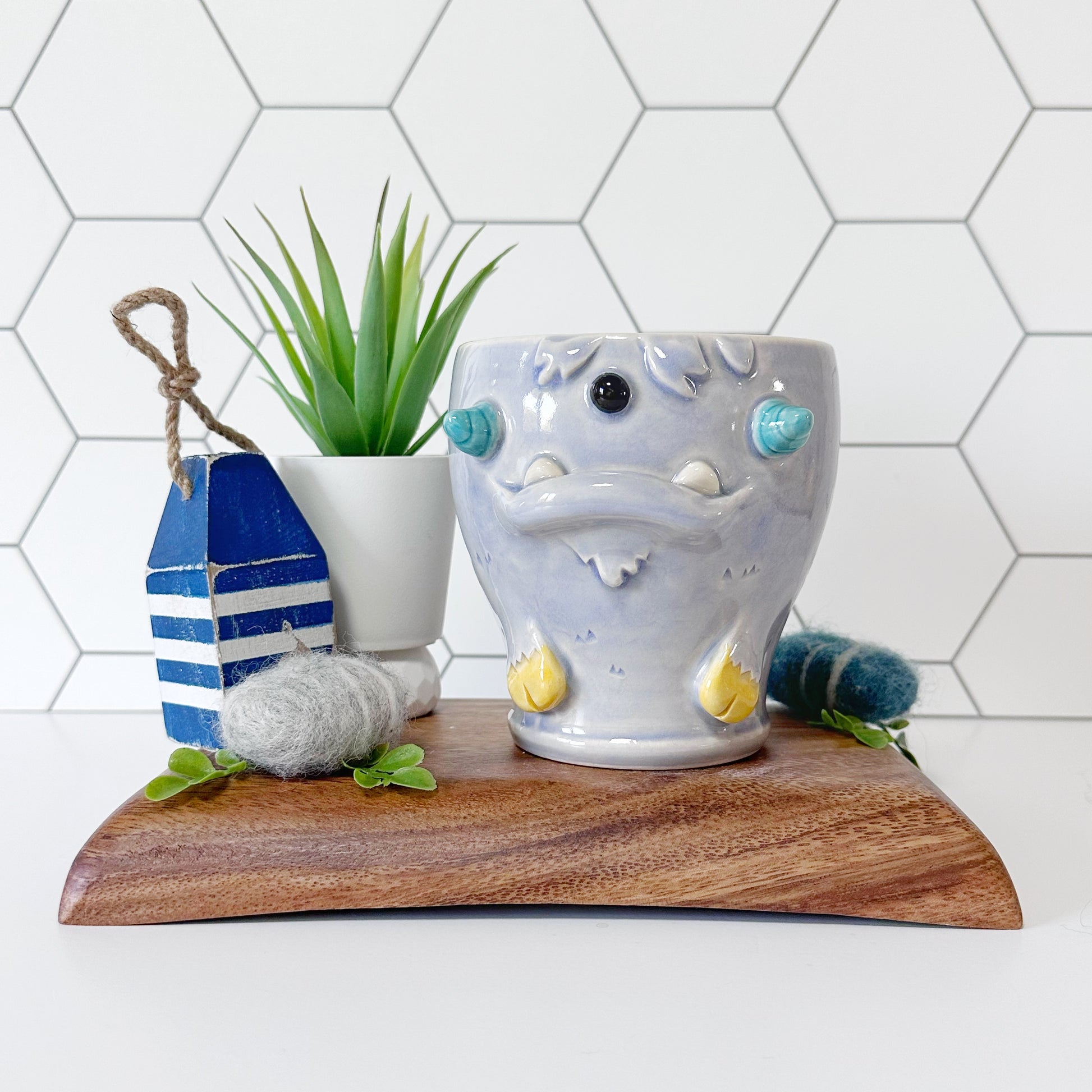 This mug is lovingly created on the wheel and then the features are built on by hand. Since all of our creations are built one at a time, no two are exactly the same. Our products are also hand painted adding to the unique design on every creation. You may be able to see our hands at work in the brush strokes of the glaze. You may also notice some texture in spots. This is part of our handmade quality and the uniqueness to every piece.