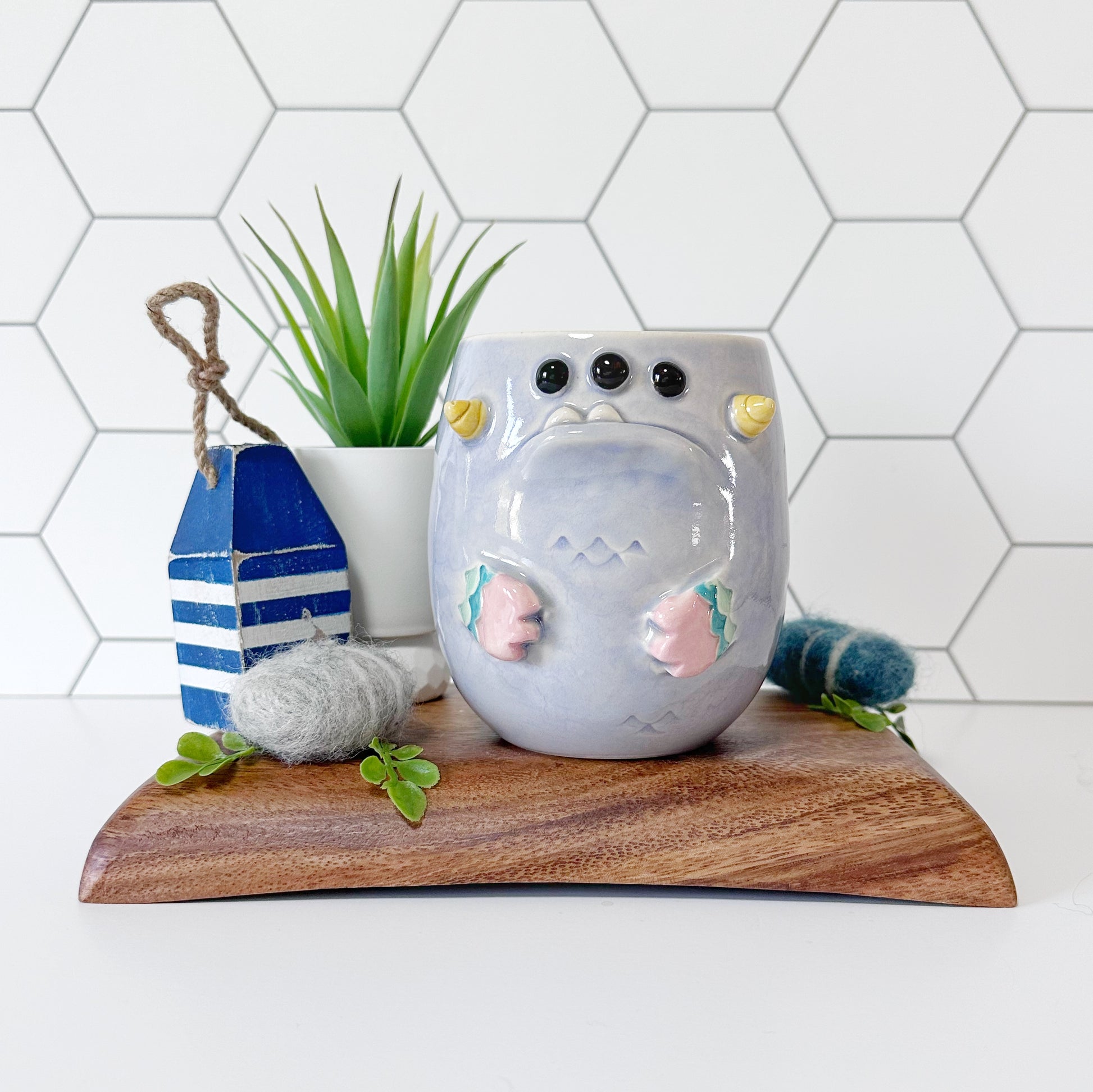 This mug is lovingly created on the wheel and then the features are built on by hand. Since all of our creations are built one at a time, no two are exactly the same. Our products are also hand painted adding to the unique design on every creation. You may be able to see our hands at work in the brush strokes of the glaze. You may also notice some texture in spots. This is part of our handmade quality and the uniqueness to every piece.