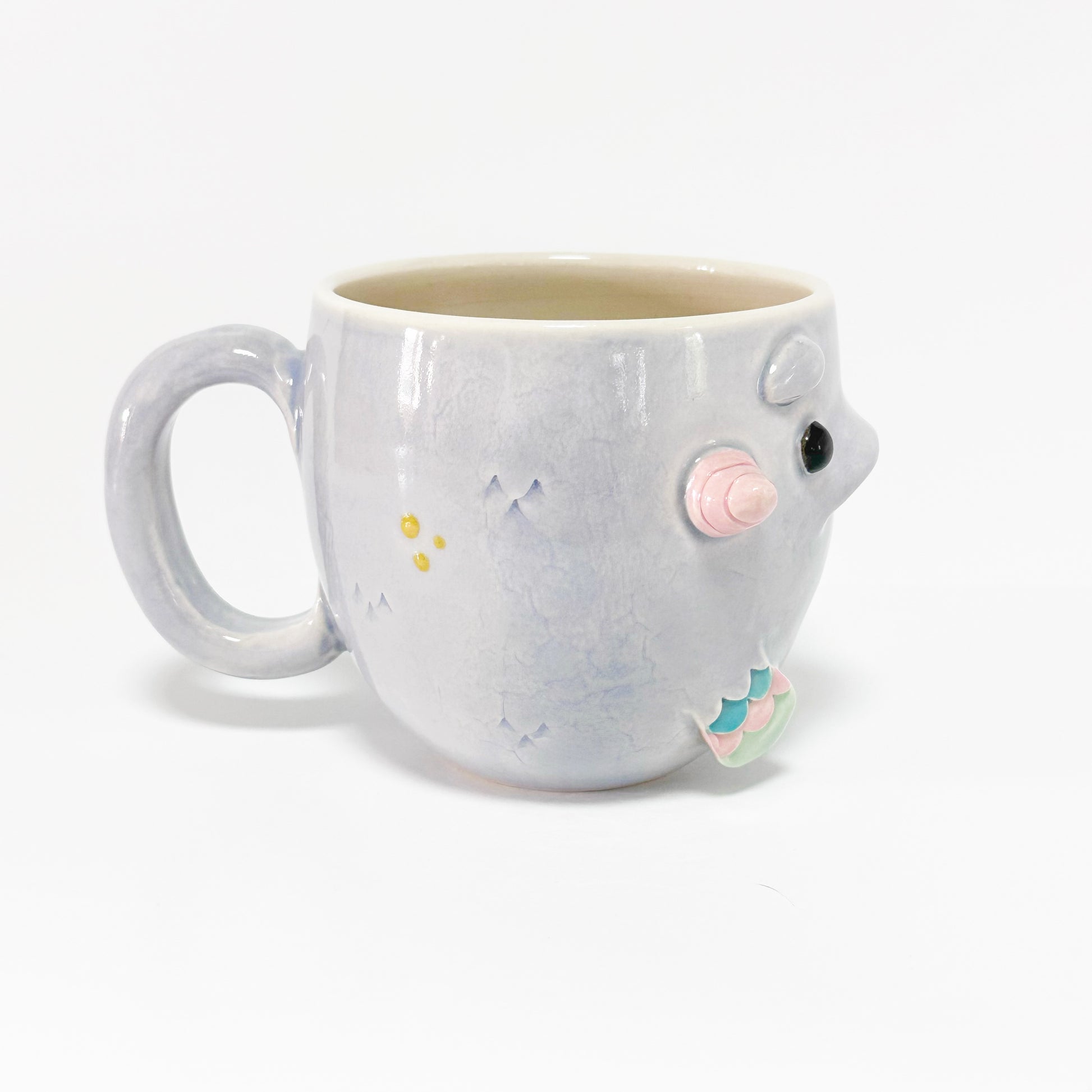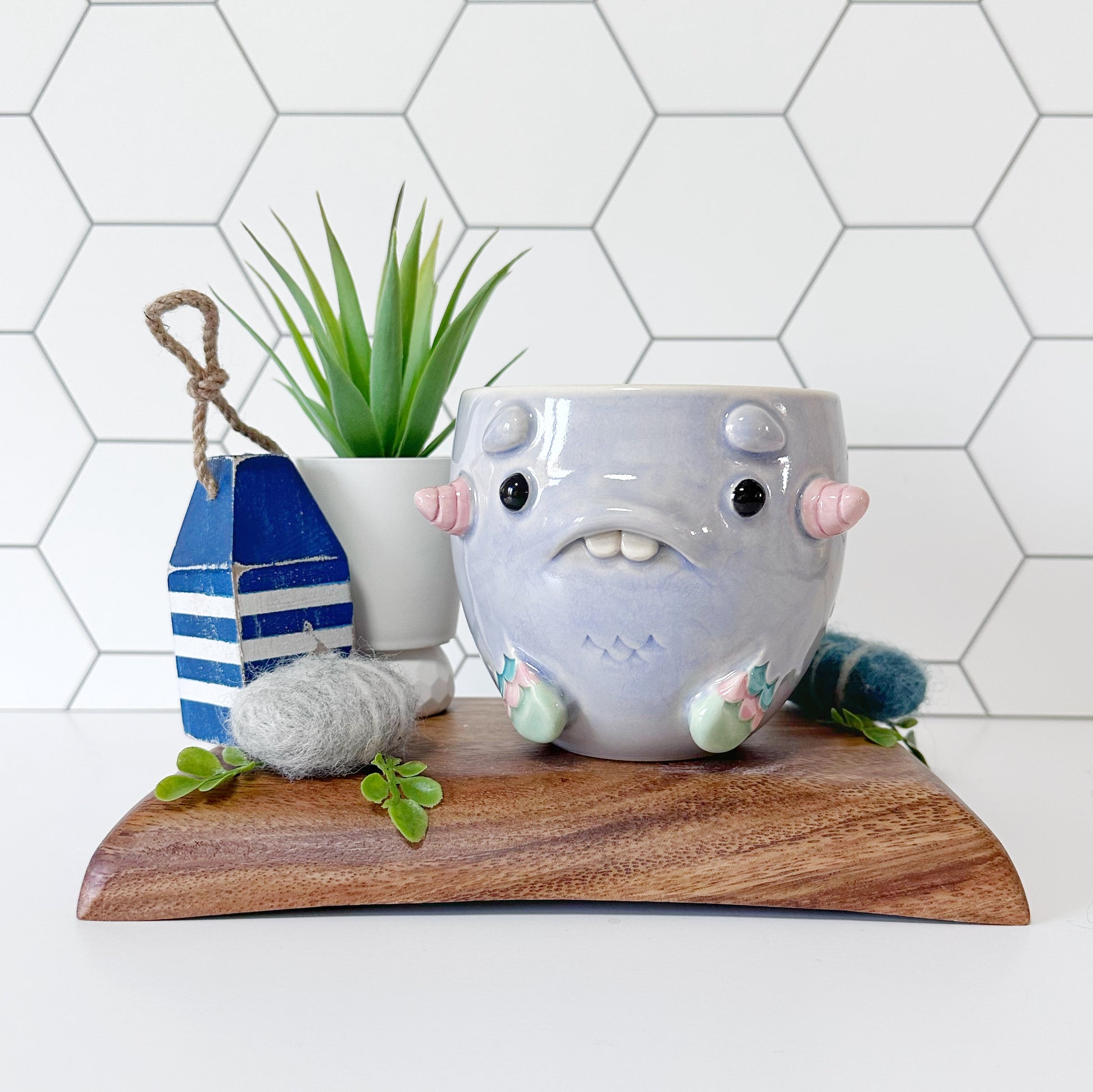 This mug is lovingly created on the wheel and then the features are built on by hand. Since all of our creations are built one at a time, no two are exactly the same. Our products are also hand painted adding to the unique design on every creation. You may be able to see our hands at work in the brush strokes of the glaze. You may also notice some texture in spots. This is part of our handmade quality and the uniqueness to every piece.