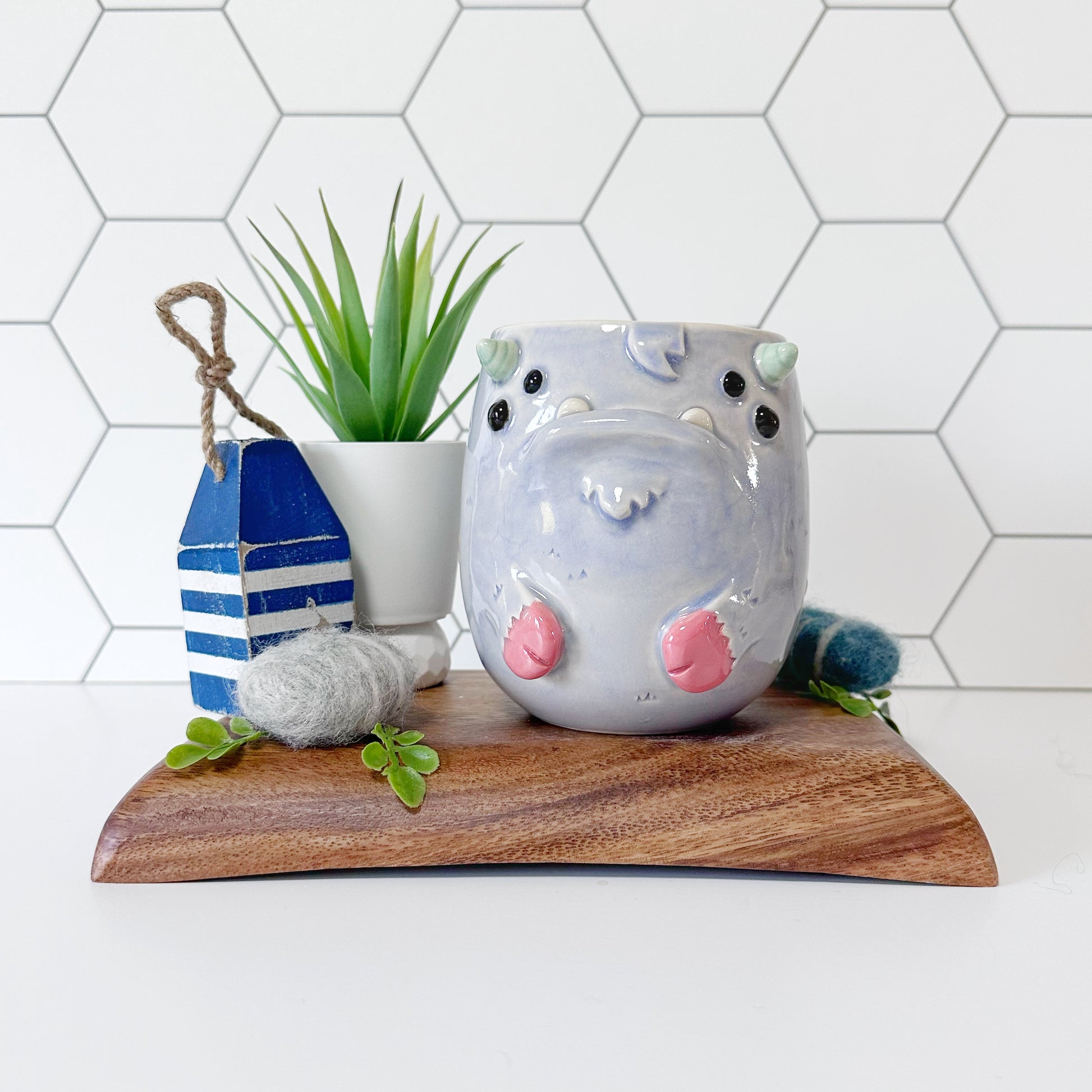 This mug is lovingly created on the wheel and then the features are built on by hand. Since all of our creations are built one at a time, no two are exactly the same. Our products are also hand painted adding to the unique design on every creation. You may be able to see our hands at work in the brush strokes of the glaze. You may also notice some texture in spots. This is part of our handmade quality and the uniqueness to every piece.