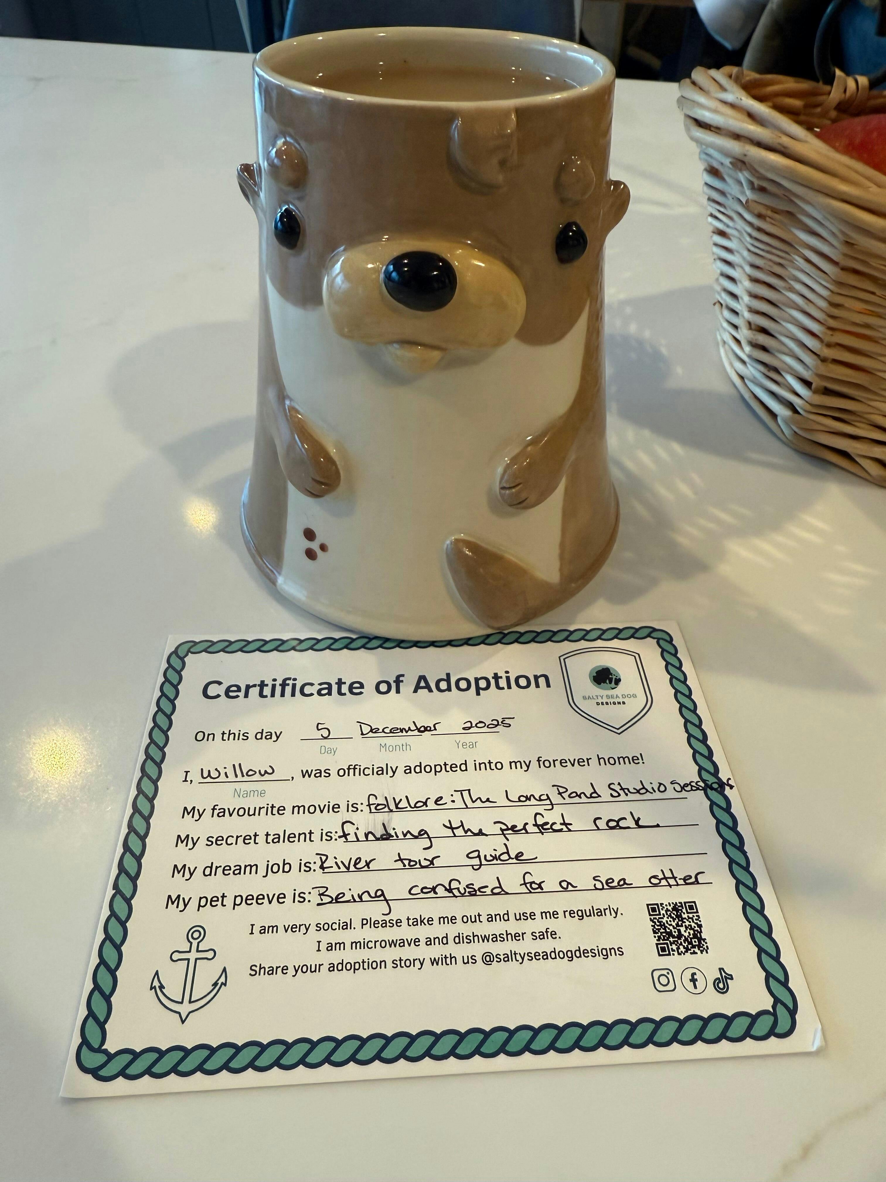 I love my river otter mug from salty sea dog designs! The handcrafted artistic details, sturdiness of design, microwave/dishwasher ready construction, and sweet whimsical details are a winning combination. I love the care and attention that this company provides for every one of their creations and customers. They exude kindness and care!