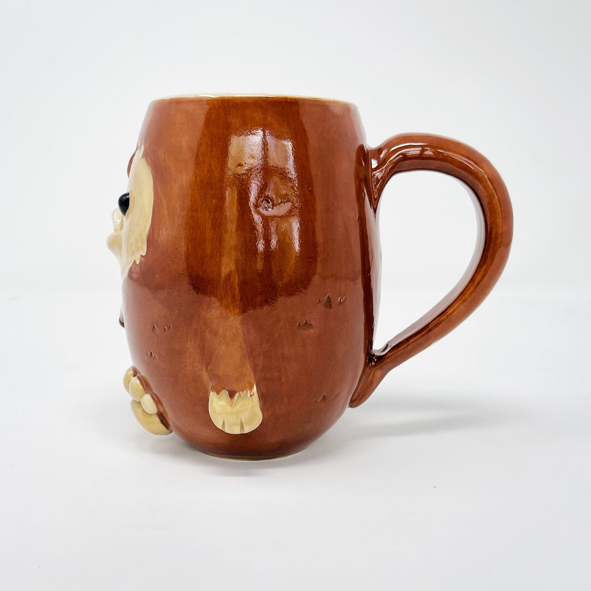 This mug is lovingly created on the wheel and then the features are built on by hand. Since all of our mugs are built one at a time, no two mugs are exactly the same. Our mugs are also hand painted adding to the unique design on every mug. You may be able to see our hands at work in the brush strokes of the glaze. You may also notice some texture in spots. This is part of our handmade quality and the uniqueness to every piece.