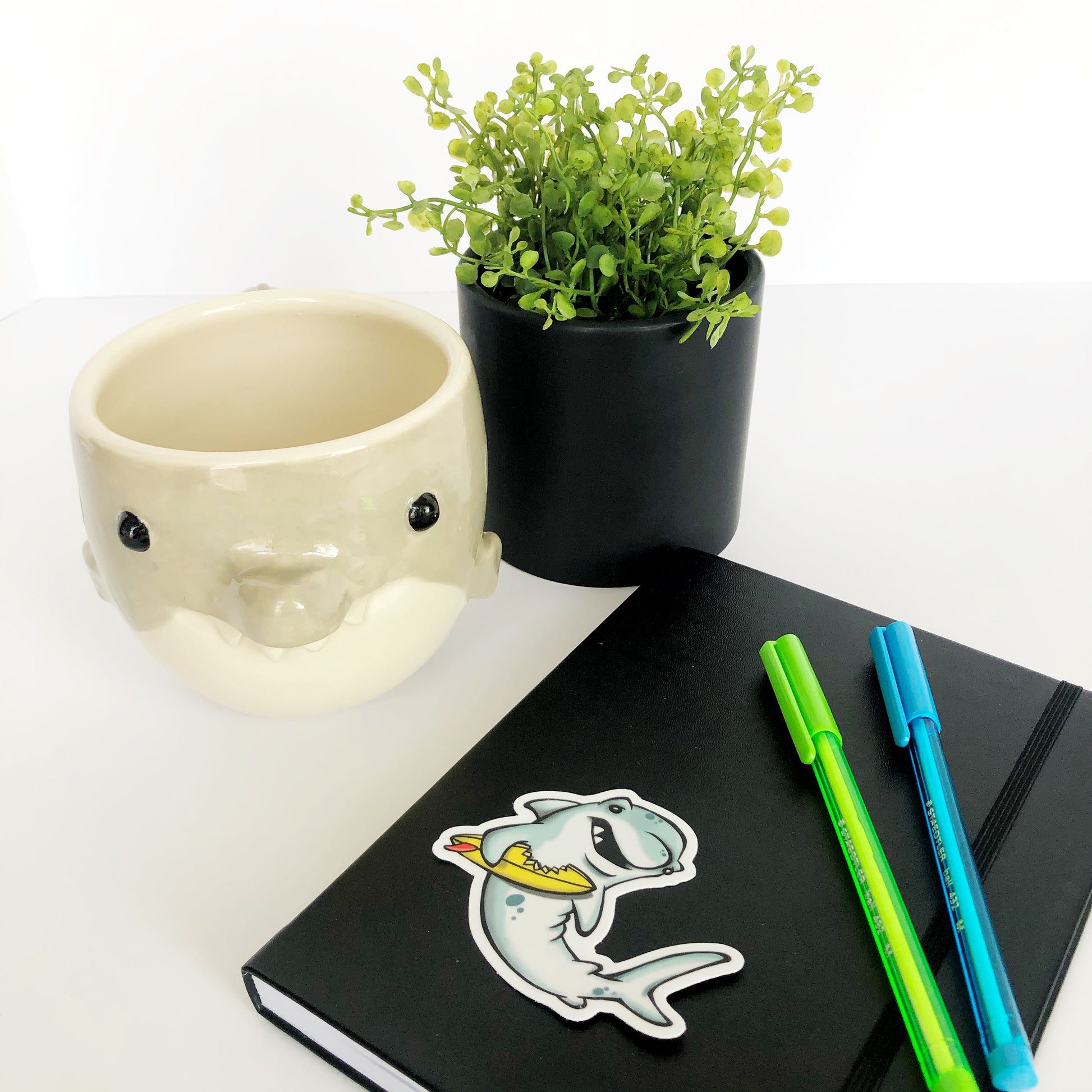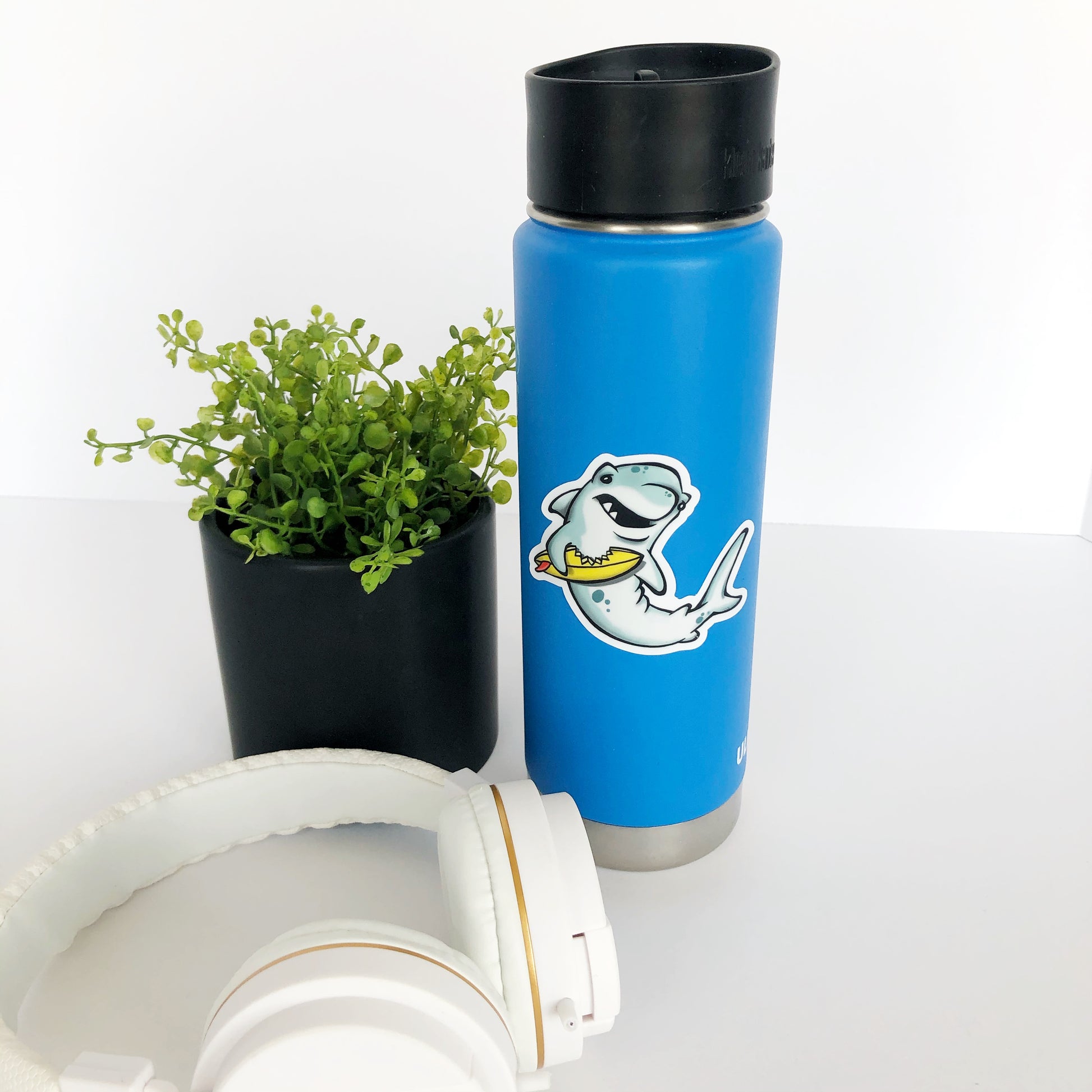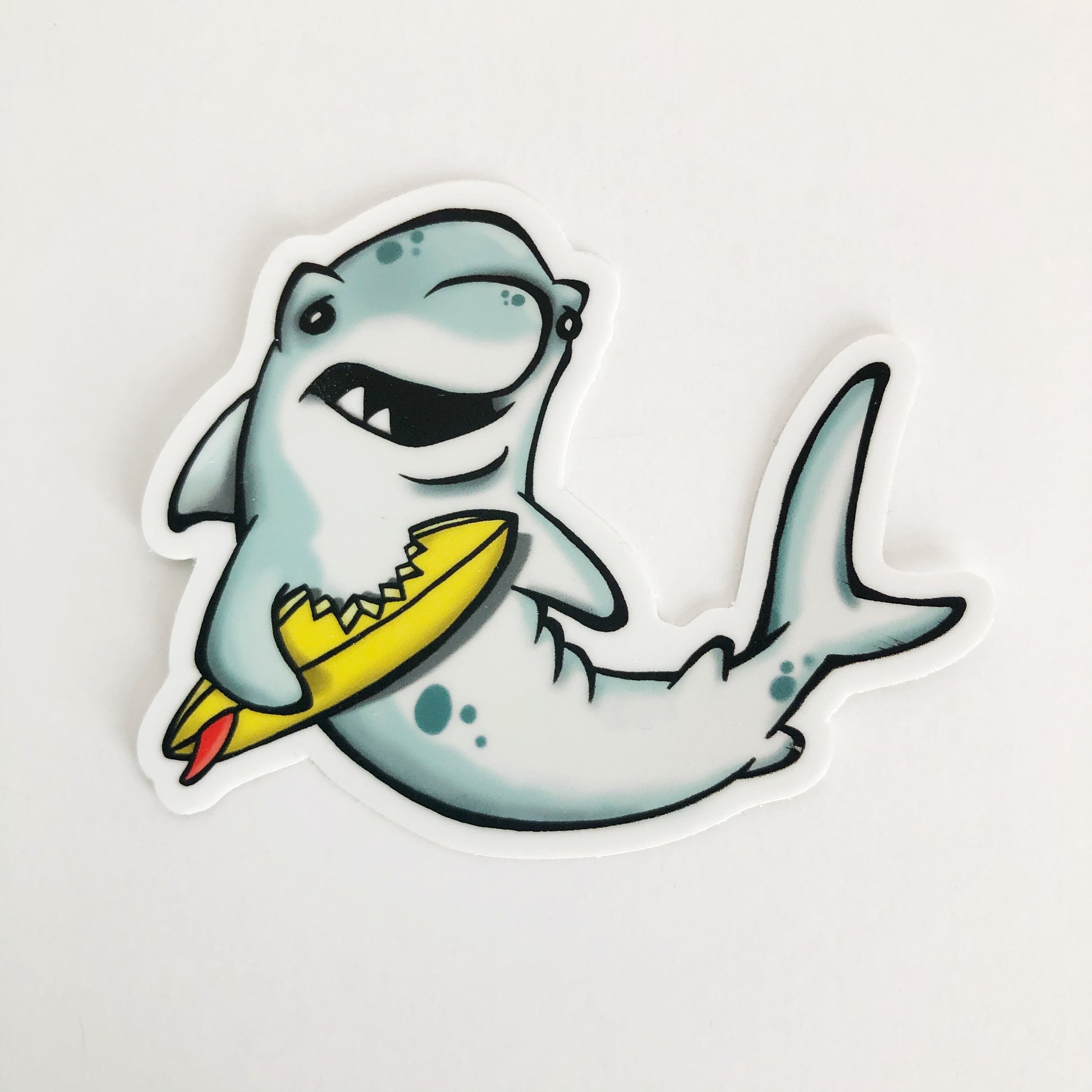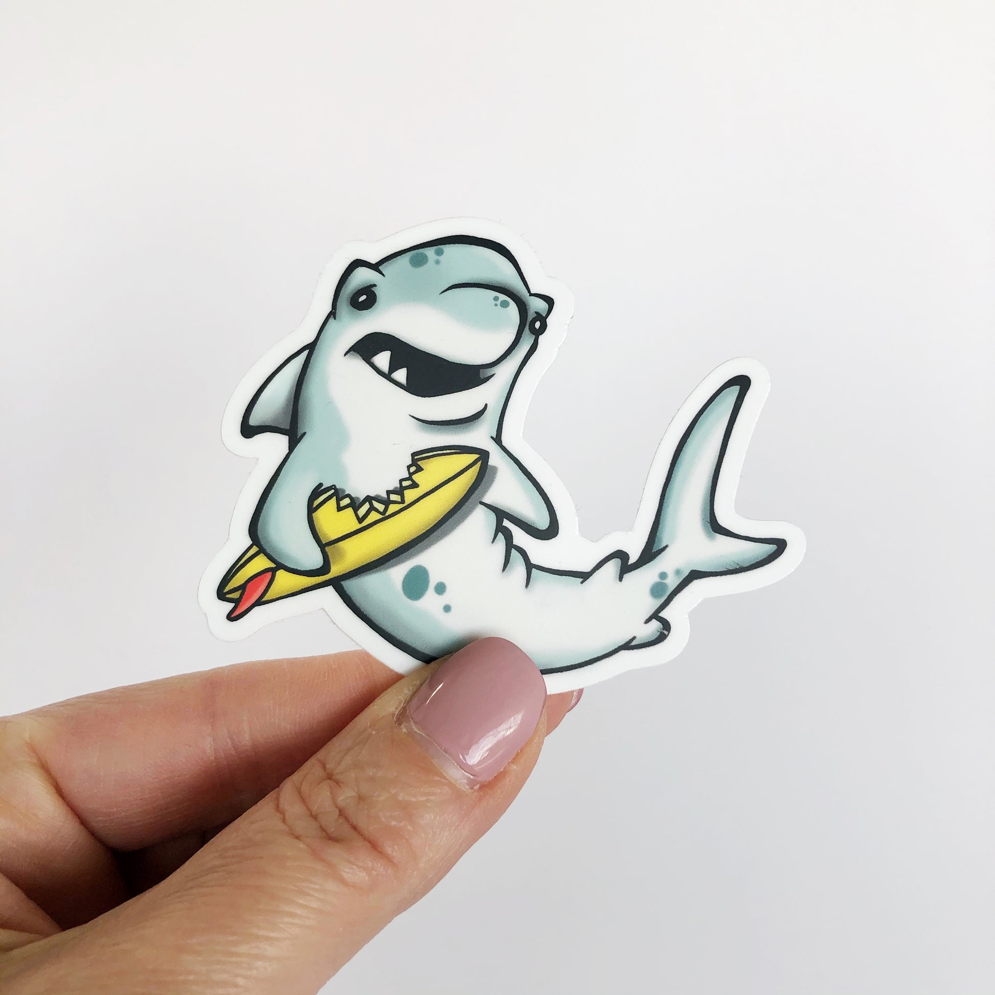 Adorable illustrated shark die cut vinyl sticker.