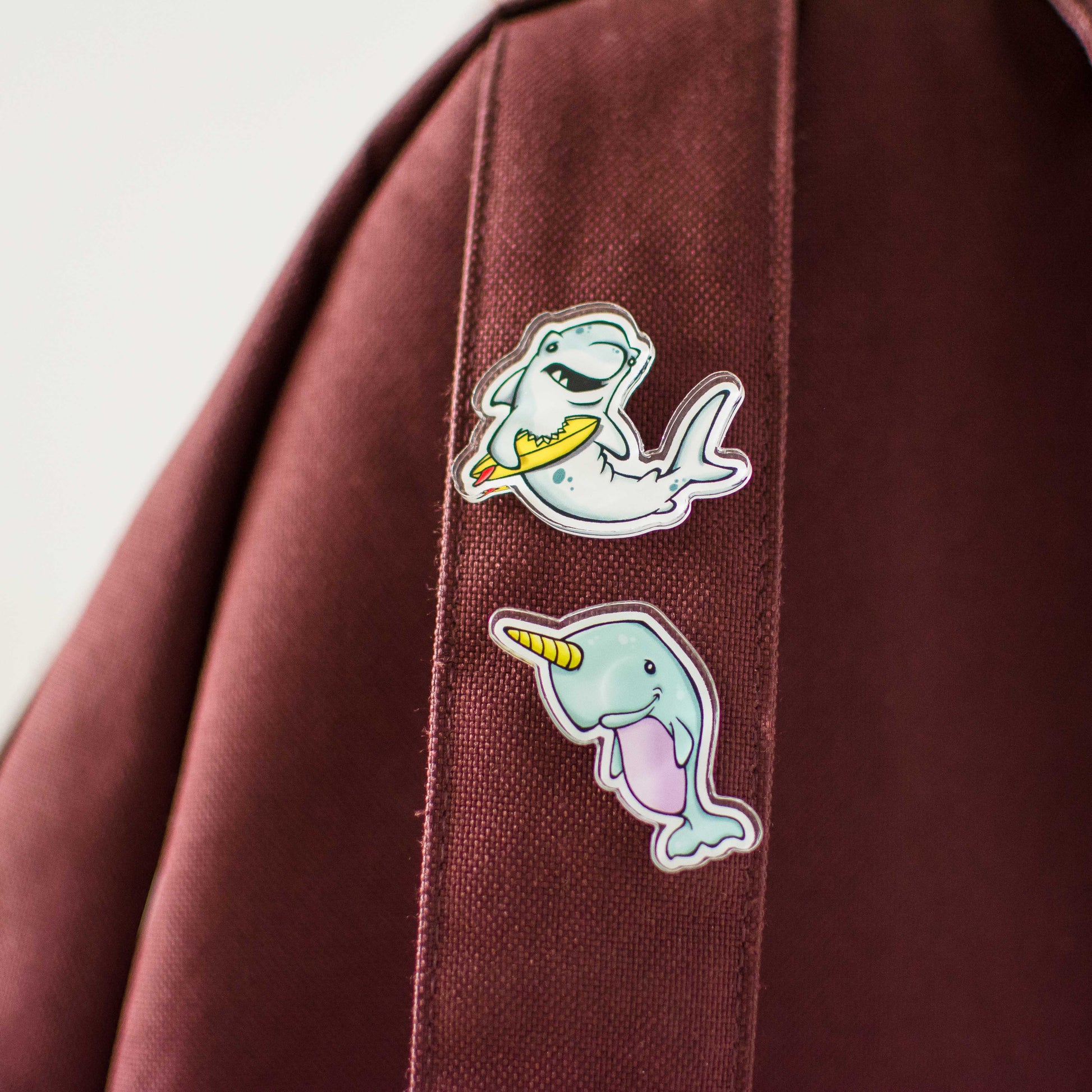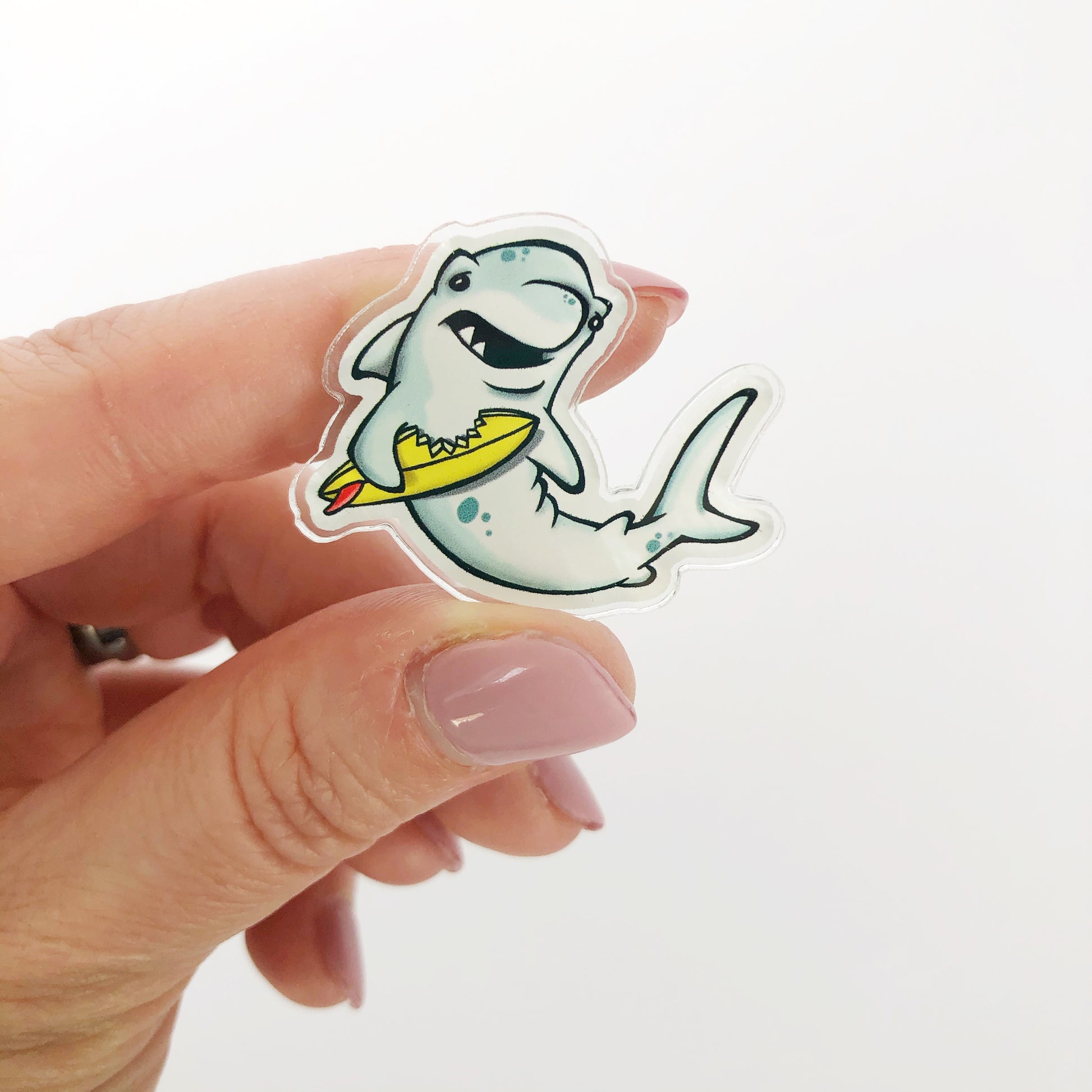 This shark pin will add flair to your jackets, sweaters, bags and more! Adorably illustrated and made from acrylic to show case the details that connote be replicated in enamel.