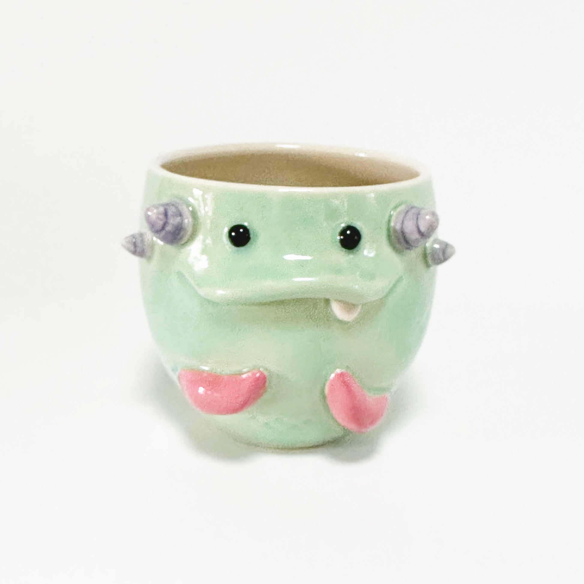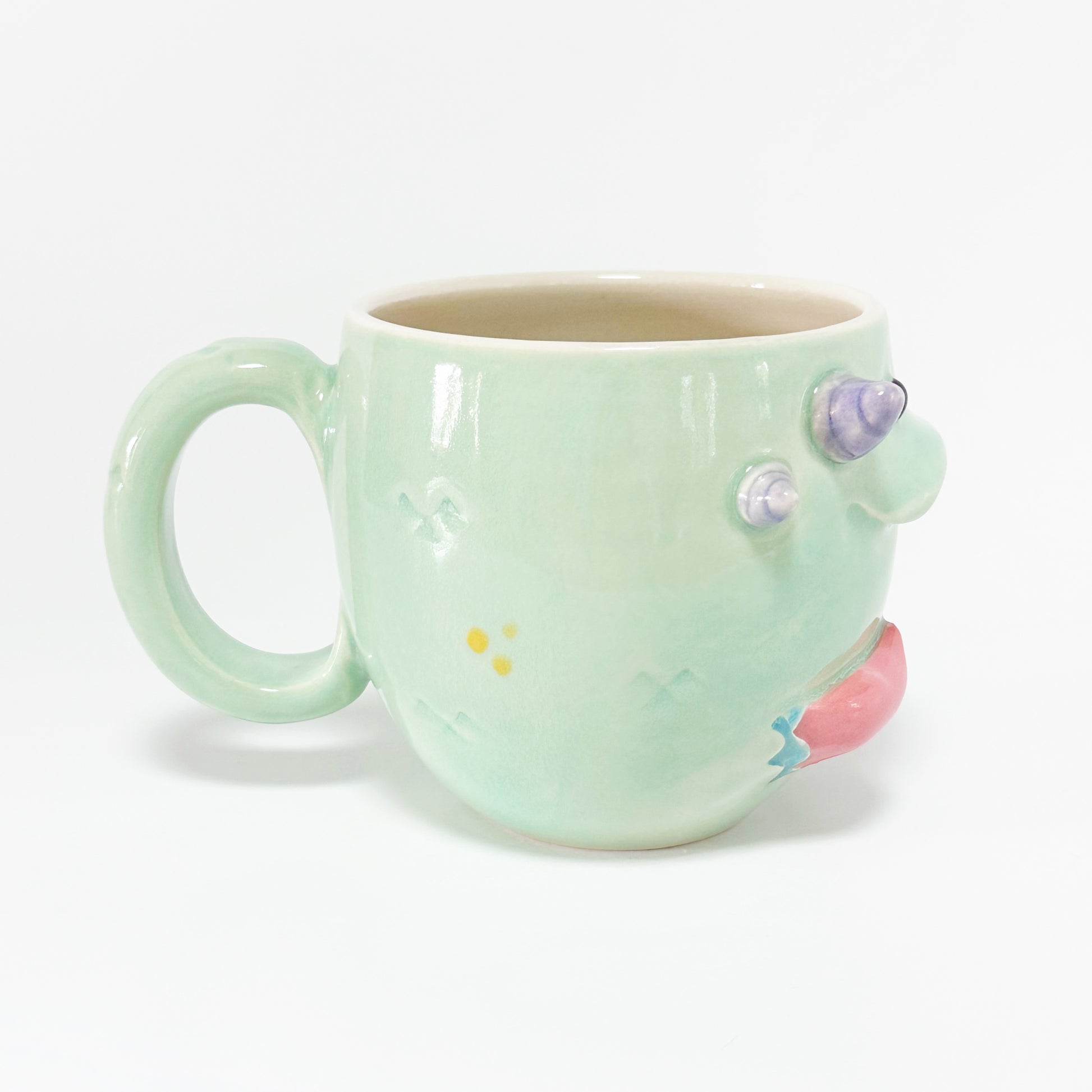 This mug is lovingly created on the wheel and then the features are built on by hand. Since all of our creations are built one at a time, no two are exactly the same. Our products are also hand painted adding to the unique design on every creation. You may be able to see our hands at work in the brush strokes of the glaze. You may also notice some texture in spots. This is part of our handmade quality and the uniqueness to every piece.